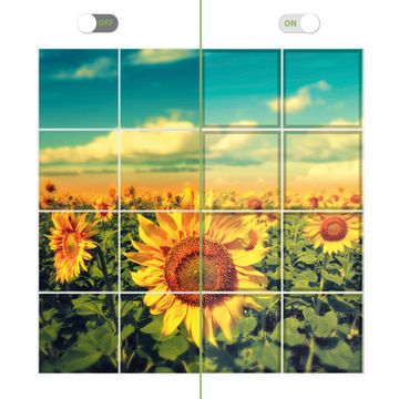 Entdecken Sie unsere vielseitigen Lichtdecken, hier in der Größe 248 x 248cm mit dem Motiv Motiv Sonnenblumen - Ihre Beleuchtungslösung für jede Umgebung Beleuchten Sie Ihren Raum nicht nur, sondern schaffen Sie Atmosphäre! Die banjado Lichtdecke verwandelt jeden Ort, ob zu Hause, in Praxen, Büros oder Studios in eine Wohlfühloase. Unsere einzelnen Elemente haben eine genormte Einheitsgröße von 62 x 62cm und können somit in jede gängige Rasterdecken verbaut werden. So finden Sie Ihre passende Ausführung: Gern helfen wir Ihnen, die passende Ausführung zu wählen. Hierfür muss die aktuelle Gegebenheit Ihrer Decke oder Wand beachtet werden. Haben Sie bereits eine Rasterdecke (auch Odenwalddecke genannt)? Hier bestellen Sie lediglich das Motiv + Beleuchtungspanel, denn beides wird in die bereits vorhandene Decke eingelegt. Haben Sie eine glatte Decke mit Lichtauslass oder möchten die Lichtdecke an der Wand befestigen? Hier bestellen Sie bitte Motiv + Beleuchtungspanel + Deckenbefestigung, eine Aufbauanleitung liegt immer bei. Die Lichtdecke kann sowohl an der Decke als auch an der Wand montiert werden, perfekt für kreative Lichtakzente oder alternative Beleuchtungslösungen. Haben Sie bereits eine Lichtdecke und möchten nur das Motiv wechseln? Hier bestellen Sie bitte nur Motiv, der Wechsel ist denkbar einfach. Der Aufbau Ihrer banjado Lichtdecke gestaltet sich unkompliziert, dank einer verständlichen Anleitung, die Ihnen Schritt für Schritt durch den Montageprozess hilft. Für die endgültige Installation und den sicheren Anschluss empfehlen wir die Hinzuziehung eines Fachmanns, um die optimale Funktion und Sicherheit Ihrer Beleuchtung zu gewährleisten. Falls Sie einen Fachmann für die Installation benötigen, geben Sie uns gern Bescheid, wir vermitteln Ihnen gern einen geeigneten Ansprechpartner aus Ihrer Nähe. Steuerung: Steigern Sie Ihr Beleuchtungserlebnis mit der nahtlosen Integration in Ihr Smart Home. Durch die Kompatibilität mit der SmartLife App, Alexa und Google Assistant wird Ihr Smartphone zur zentralen Steuerungseinheit. Ihr Handy fungiert hierbei sozusagen als Fernbedienung. Legen Sie individuelle Lichtszenen in der App fest, die bei Aktivierung über den Wand-Ein-/Ausschalter immer wieder abgerufen werden können ohne Handy. Mit der Szenenfunktion in der Smart App können Sie die Beleuchtung personalisieren und steuern, sodass sie auf Ihre individuellen Bedürfnisse, Tagesrhythmus und Stimmung zugeschnitten ist. Beispielsweise können Sie sich in der Morgendämmerung durch ein sanftes Licht wecken lassen oder das Licht der Praxis werktags um 7 Uhr automatisch einschalten lassen. Dieses kann dann natürlich auch zu einer bestimmten Zeit automatisch ausgeschaltet werden. Motivwahl: Diese einzigartige Lichtdecke zeichnet sich durch ihre Fähigkeit aus, die Lichtfarbe je nach gewähltem Motiv anzupassen - ein Baum wirft ein sanftes grünes Licht, während eine Wolkendecke Ihren Raum in ein beruhigendes blaues Leuchten hüllt. Berücksichtigen Sie dies bitte bei Ihrer Motivauswahl. Sie können das Motiv jederzeit ohne großen Aufwand austauschen, ob nach Jahreszeit oder anderem Anlass, unsere Auswahl lässt kaum Wünsche offen. Wir fertigen Ihnen gern eine personalisierte Lichtdecke mit einem eigenen Motiv oder Logo oder Foto, schreiben Sie uns jederzeit an. Technische Daten: Das Motiv ist auf einer 4mm starken Acrylglas Scheibe aufgebracht, das Gesamtgewicht Ihrer Ausführung beträgt 78,9kg. Die Farbtemperatur lässt sich frei einstellen von 3000 bis 6000 Kelvin, damit können Sie stufenlos zwischen warmweiß, neutralweiß und kaltweiß wählen. Die Gesamtleistung bei Ihrer gewählten Ausführung beträgt 640W. Der Lichtstrom beträgt 3600 Lumen, die Nennspannung 230 V. Die Lichtdecke ist mit Schutzart IP20 für den Innenbereich konzipiert und sollte nicht im Nassbereich verwendet werden.