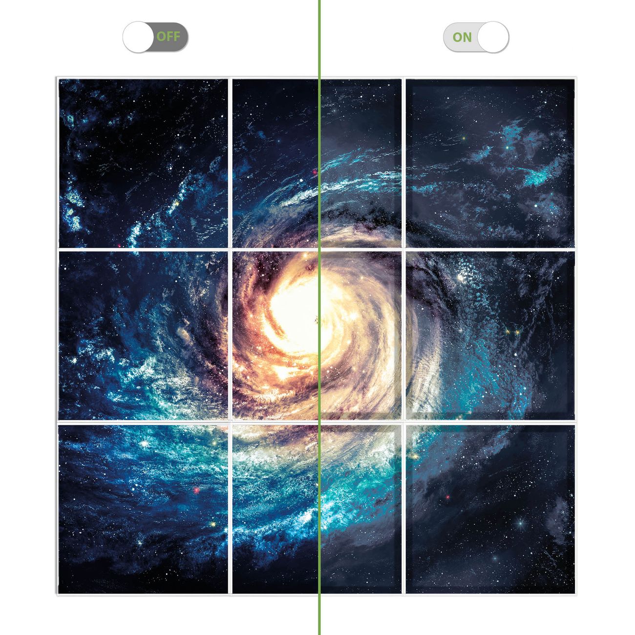 Entdecken Sie unsere vielseitigen Lichtdecken, hier in der Größe 186 x 186cm mit dem Motiv Motiv Sternenwirbel - Ihre Beleuchtungslösung für jede Umgebung Beleuchten Sie Ihren Raum nicht nur, sondern schaffen Sie Atmosphäre! Die banjado Lichtdecke verwandelt jeden Ort, ob zu Hause, in Praxen, Büros oder Studios in eine Wohlfühloase. Unsere einzelnen Elemente haben eine genormte Einheitsgröße von 62 x 62cm und können somit in jede gängige Rasterdecken verbaut werden. So finden Sie Ihre passende Ausführung: Gern helfen wir Ihnen, die passende Ausführung zu wählen. Hierfür muss die aktuelle Gegebenheit Ihrer Decke oder Wand beachtet werden. Haben Sie bereits eine Rasterdecke (auch Odenwalddecke genannt)? Hier bestellen Sie lediglich das Motiv + Beleuchtungspanel, denn beides wird in die bereits vorhandene Decke eingelegt. Haben Sie eine glatte Decke mit Lichtauslass oder möchten die Lichtdecke an der Wand befestigen? Hier bestellen Sie bitte Motiv + Beleuchtungspanel + Deckenbefestigung, eine Aufbauanleitung liegt immer bei. Die Lichtdecke kann sowohl an der Decke als auch an der Wand montiert werden, perfekt für kreative Lichtakzente oder alternative Beleuchtungslösungen. Haben Sie bereits eine Lichtdecke und möchten nur das Motiv wechseln? Hier bestellen Sie bitte nur Motiv, der Wechsel ist denkbar einfach. Der Aufbau Ihrer banjado Lichtdecke gestaltet sich unkompliziert, dank einer verständlichen Anleitung, die Ihnen Schritt für Schritt durch den Montageprozess hilft. Für die endgültige Installation und den sicheren Anschluss empfehlen wir die Hinzuziehung eines Fachmanns, um die optimale Funktion und Sicherheit Ihrer Beleuchtung zu gewährleisten. Falls Sie einen Fachmann für die Installation benötigen, geben Sie uns gern Bescheid, wir vermitteln Ihnen gern einen geeigneten Ansprechpartner aus Ihrer Nähe. Steuerung: Steigern Sie Ihr Beleuchtungserlebnis mit der nahtlosen Integration in Ihr Smart Home. Durch die Kompatibilität mit der SmartLife App, Alexa und Google Assistant wird Ihr Smartphone zur zentralen Steuerungseinheit. Ihr Handy fungiert hierbei sozusagen als Fernbedienung. Legen Sie individuelle Lichtszenen in der App fest, die bei Aktivierung über den Wand-Ein-/Ausschalter immer wieder abgerufen werden können ohne Handy. Mit der Szenenfunktion in der Smart App können Sie die Beleuchtung personalisieren und steuern, sodass sie auf Ihre individuellen Bedürfnisse, Tagesrhythmus und Stimmung zugeschnitten ist. Beispielsweise können Sie sich in der Morgendämmerung durch ein sanftes Licht wecken lassen oder das Licht der Praxis werktags um 7 Uhr automatisch einschalten lassen. Dieses kann dann natürlich auch zu einer bestimmten Zeit automatisch ausgeschaltet werden. Motivwahl: Diese einzigartige Lichtdecke zeichnet sich durch ihre Fähigkeit aus, die Lichtfarbe je nach gewähltem Motiv anzupassen - ein Baum wirft ein sanftes grünes Licht, während eine Wolkendecke Ihren Raum in ein beruhigendes blaues Leuchten hüllt. Berücksichtigen Sie dies bitte bei Ihrer Motivauswahl. Sie können das Motiv jederzeit ohne großen Aufwand austauschen, ob nach Jahreszeit oder anderem Anlass, unsere Auswahl lässt kaum Wünsche offen. Wir fertigen Ihnen gern eine personalisierte Lichtdecke mit einem eigenen Motiv oder Logo oder Foto, schreiben Sie uns jederzeit an. Technische Daten: Das Motiv ist auf einer 4mm starken Acrylglas Scheibe aufgebracht, das Gesamtgewicht Ihrer Ausführung beträgt 39,9kg. Die Farbtemperatur lässt sich frei einstellen von 3000 bis 6000 Kelvin, damit können Sie stufenlos zwischen warmweiß, neutralweiß und kaltweiß wählen. Die Gesamtleistung bei Ihrer gewählten Ausführung beträgt 360W. Der Lichtstrom beträgt 3600 Lumen, die Nennspannung 230 V. Die Lichtdecke ist mit Schutzart IP20 für den Innenbereich konzipiert und sollte nicht im Nassbereich verwendet werden.