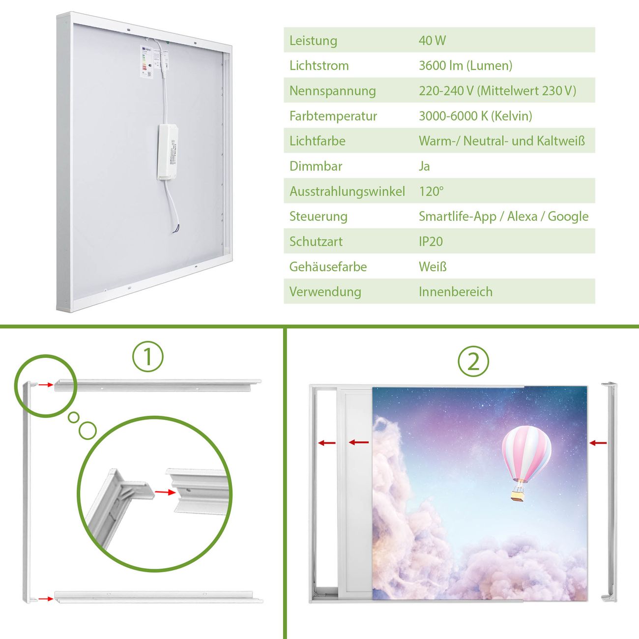 Entdecken Sie unsere vielseitigen Lichtdecken, hier in der Größe 186 x 62cm mit dem Motiv Motiv Über den Wolken - Ihre Beleuchtungslösung für jede Umgebung Beleuchten Sie Ihren Raum nicht nur, sondern schaffen Sie Atmosphäre! Die banjado Lichtdecke verwandelt jeden Ort, ob zu Hause, in Praxen, Büros oder Studios in eine Wohlfühloase. Unsere einzelnen Elemente haben eine genormte Einheitsgröße von 62 x 62cm und können somit in jede gängige Rasterdecken verbaut werden. So finden Sie Ihre passende Ausführung: Gern helfen wir Ihnen, die passende Ausführung zu wählen. Hierfür muss die aktuelle Gegebenheit Ihrer Decke oder Wand beachtet werden. Haben Sie bereits eine Rasterdecke (auch Odenwalddecke genannt)? Hier bestellen Sie lediglich das Motiv + Beleuchtungspanel, denn beides wird in die bereits vorhandene Decke eingelegt. Haben Sie eine glatte Decke mit Lichtauslass oder möchten die Lichtdecke an der Wand befestigen? Hier bestellen Sie bitte Motiv + Beleuchtungspanel + Deckenbefestigung, eine Aufbauanleitung liegt immer bei. Die Lichtdecke kann sowohl an der Decke als auch an der Wand montiert werden, perfekt für kreative Lichtakzente oder alternative Beleuchtungslösungen. Haben Sie bereits eine Lichtdecke und möchten nur das Motiv wechseln? Hier bestellen Sie bitte nur Motiv, der Wechsel ist denkbar einfach. Der Aufbau Ihrer banjado Lichtdecke gestaltet sich unkompliziert, dank einer verständlichen Anleitung, die Ihnen Schritt für Schritt durch den Montageprozess hilft. Für die endgültige Installation und den sicheren Anschluss empfehlen wir die Hinzuziehung eines Fachmanns, um die optimale Funktion und Sicherheit Ihrer Beleuchtung zu gewährleisten. Falls Sie einen Fachmann für die Installation benötigen, geben Sie uns gern Bescheid, wir vermitteln Ihnen gern einen geeigneten Ansprechpartner aus Ihrer Nähe. Steuerung: Steigern Sie Ihr Beleuchtungserlebnis mit der nahtlosen Integration in Ihr Smart Home. Durch die Kompatibilität mit der SmartLife App, Alexa und Google Assistant wird Ihr Smartphone zur zentralen Steuerungseinheit. Ihr Handy fungiert hierbei sozusagen als Fernbedienung. Legen Sie individuelle Lichtszenen in der App fest, die bei Aktivierung über den Wand-Ein-/Ausschalter immer wieder abgerufen werden können ohne Handy. Mit der Szenenfunktion in der Smart App können Sie die Beleuchtung personalisieren und steuern, sodass sie auf Ihre individuellen Bedürfnisse, Tagesrhythmus und Stimmung zugeschnitten ist. Beispielsweise können Sie sich in der Morgendämmerung durch ein sanftes Licht wecken lassen oder das Licht der Praxis werktags um 7 Uhr automatisch einschalten lassen. Dieses kann dann natürlich auch zu einer bestimmten Zeit automatisch ausgeschaltet werden. Motivwahl: Diese einzigartige Lichtdecke zeichnet sich durch ihre Fähigkeit aus, die Lichtfarbe je nach gewähltem Motiv anzupassen - ein Baum wirft ein sanftes grünes Licht, während eine Wolkendecke Ihren Raum in ein beruhigendes blaues Leuchten hüllt. Berücksichtigen Sie dies bitte bei Ihrer Motivauswahl. Sie können das Motiv jederzeit ohne großen Aufwand austauschen, ob nach Jahreszeit oder anderem Anlass, unsere Auswahl lässt kaum Wünsche offen. Wir fertigen Ihnen gern eine personalisierte Lichtdecke mit einem eigenen Motiv oder Logo oder Foto, schreiben Sie uns jederzeit an. Technische Daten: Das Motiv ist auf einer 4mm starken Acrylglas Scheibe aufgebracht, das Gesamtgewicht Ihrer Ausführung beträgt 6,8kg. Die Farbtemperatur lässt sich frei einstellen von 3000 bis 6000 Kelvin, damit können Sie stufenlos zwischen warmweiß, neutralweiß und kaltweiß wählen. Die Gesamtleistung bei Ihrer gewählten Ausführung beträgt 120W. Der Lichtstrom beträgt 3600 Lumen, die Nennspannung 230 V. Die Lichtdecke ist mit Schutzart IP20 für den Innenbereich konzipiert und sollte nicht im Nassbereich verwendet werden.