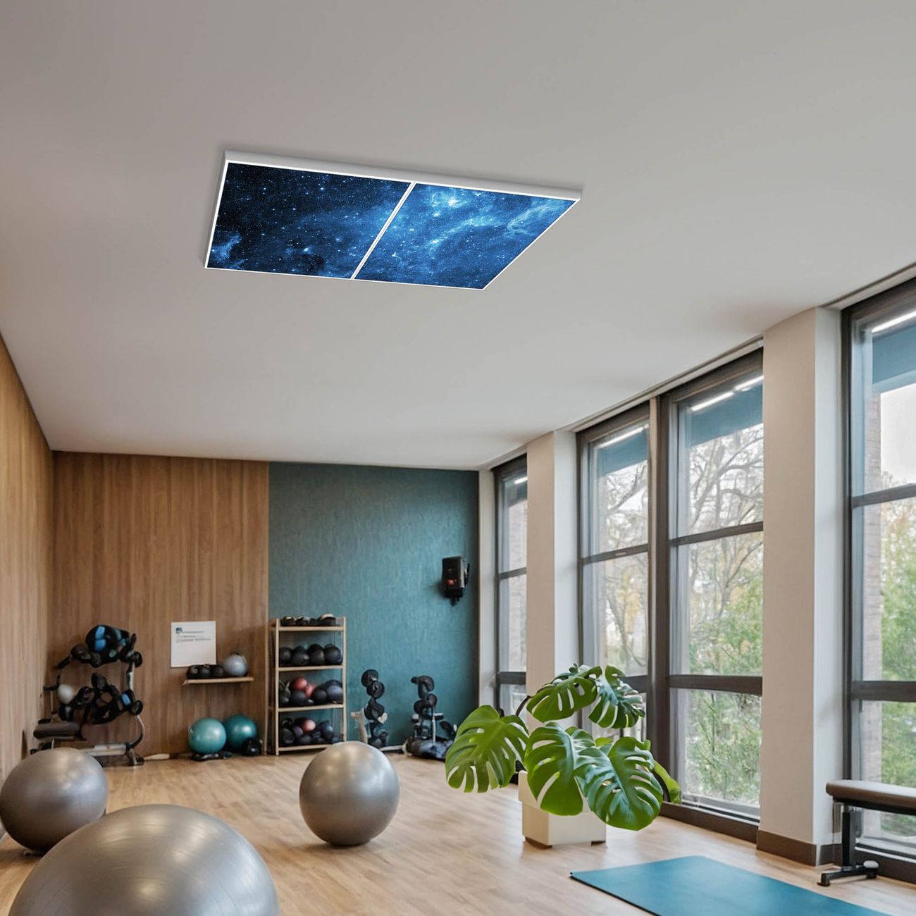 Entdecken Sie unsere vielseitigen Lichtdecken, hier in der Größe 124 x 62cm mit dem Motiv Motiv Universum - Ihre Beleuchtungslösung für jede Umgebung Beleuchten Sie Ihren Raum nicht nur, sondern schaffen Sie Atmosphäre! Die banjado Lichtdecke verwandelt jeden Ort, ob zu Hause, in Praxen, Büros oder Studios in eine Wohlfühloase. Unsere einzelnen Elemente haben eine genormte Einheitsgröße von 62 x 62cm und können somit in jede gängige Rasterdecken verbaut werden. So finden Sie Ihre passende Ausführung: Gern helfen wir Ihnen, die passende Ausführung zu wählen. Hierfür muss die aktuelle Gegebenheit Ihrer Decke oder Wand beachtet werden. Haben Sie bereits eine Rasterdecke (auch Odenwalddecke genannt)? Hier bestellen Sie lediglich das Motiv + Beleuchtungspanel, denn beides wird in die bereits vorhandene Decke eingelegt. Haben Sie eine glatte Decke mit Lichtauslass oder möchten die Lichtdecke an der Wand befestigen? Hier bestellen Sie bitte Motiv + Beleuchtungspanel + Deckenbefestigung, eine Aufbauanleitung liegt immer bei. Die Lichtdecke kann sowohl an der Decke als auch an der Wand montiert werden, perfekt für kreative Lichtakzente oder alternative Beleuchtungslösungen. Haben Sie bereits eine Lichtdecke und möchten nur das Motiv wechseln? Hier bestellen Sie bitte nur Motiv, der Wechsel ist denkbar einfach. Der Aufbau Ihrer banjado Lichtdecke gestaltet sich unkompliziert, dank einer verständlichen Anleitung, die Ihnen Schritt für Schritt durch den Montageprozess hilft. Für die endgültige Installation und den sicheren Anschluss empfehlen wir die Hinzuziehung eines Fachmanns, um die optimale Funktion und Sicherheit Ihrer Beleuchtung zu gewährleisten. Falls Sie einen Fachmann für die Installation benötigen, geben Sie uns gern Bescheid, wir vermitteln Ihnen gern einen geeigneten Ansprechpartner aus Ihrer Nähe. Steuerung: Steigern Sie Ihr Beleuchtungserlebnis mit der nahtlosen Integration in Ihr Smart Home. Durch die Kompatibilität mit der SmartLife App, Alexa und Google Assistant wird Ihr Smartphone zur zentralen Steuerungseinheit. Ihr Handy fungiert hierbei sozusagen als Fernbedienung. Legen Sie individuelle Lichtszenen in der App fest, die bei Aktivierung über den Wand-Ein-/Ausschalter immer wieder abgerufen werden können ohne Handy. Mit der Szenenfunktion in der Smart App können Sie die Beleuchtung personalisieren und steuern, sodass sie auf Ihre individuellen Bedürfnisse, Tagesrhythmus und Stimmung zugeschnitten ist. Beispielsweise können Sie sich in der Morgendämmerung durch ein sanftes Licht wecken lassen oder das Licht der Praxis werktags um 7 Uhr automatisch einschalten lassen. Dieses kann dann natürlich auch zu einer bestimmten Zeit automatisch ausgeschaltet werden. Motivwahl: Diese einzigartige Lichtdecke zeichnet sich durch ihre Fähigkeit aus, die Lichtfarbe je nach gewähltem Motiv anzupassen - ein Baum wirft ein sanftes grünes Licht, während eine Wolkendecke Ihren Raum in ein beruhigendes blaues Leuchten hüllt. Berücksichtigen Sie dies bitte bei Ihrer Motivauswahl. Sie können das Motiv jederzeit ohne großen Aufwand austauschen, ob nach Jahreszeit oder anderem Anlass, unsere Auswahl lässt kaum Wünsche offen. Wir fertigen Ihnen gern eine personalisierte Lichtdecke mit einem eigenen Motiv oder Logo oder Foto, schreiben Sie uns jederzeit an. Technische Daten: Das Motiv ist auf einer 4mm starken Acrylglas Scheibe aufgebracht, das Gesamtgewicht Ihrer Ausführung beträgt 9,9kg. Die Farbtemperatur lässt sich frei einstellen von 3000 bis 6000 Kelvin, damit können Sie stufenlos zwischen warmweiß, neutralweiß und kaltweiß wählen. Die Gesamtleistung bei Ihrer gewählten Ausführung beträgt 80W. Der Lichtstrom beträgt 3600 Lumen, die Nennspannung 230 V. Die Lichtdecke ist mit Schutzart IP20 für den Innenbereich konzipiert und sollte nicht im Nassbereich verwendet werden.