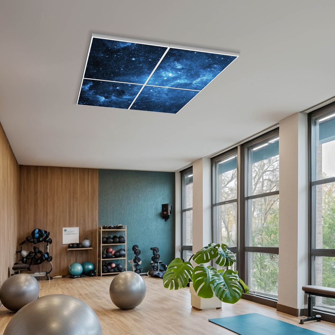 Entdecken Sie unsere vielseitigen Lichtdecken, hier in der Größe 124 x 124cm mit dem Motiv Motiv Universum - Ihre Beleuchtungslösung für jede Umgebung Beleuchten Sie Ihren Raum nicht nur, sondern schaffen Sie Atmosphäre! Die banjado Lichtdecke verwandelt jeden Ort, ob zu Hause, in Praxen, Büros oder Studios in eine Wohlfühloase. Unsere einzelnen Elemente haben eine genormte Einheitsgröße von 62 x 62cm und können somit in jede gängige Rasterdecken verbaut werden. So finden Sie Ihre passende Ausführung: Gern helfen wir Ihnen, die passende Ausführung zu wählen. Hierfür muss die aktuelle Gegebenheit Ihrer Decke oder Wand beachtet werden. Haben Sie bereits eine Rasterdecke (auch Odenwalddecke genannt)? Hier bestellen Sie lediglich das Motiv + Beleuchtungspanel, denn beides wird in die bereits vorhandene Decke eingelegt. Haben Sie eine glatte Decke mit Lichtauslass oder möchten die Lichtdecke an der Wand befestigen? Hier bestellen Sie bitte Motiv + Beleuchtungspanel + Deckenbefestigung, eine Aufbauanleitung liegt immer bei. Die Lichtdecke kann sowohl an der Decke als auch an der Wand montiert werden, perfekt für kreative Lichtakzente oder alternative Beleuchtungslösungen. Haben Sie bereits eine Lichtdecke und möchten nur das Motiv wechseln? Hier bestellen Sie bitte nur Motiv, der Wechsel ist denkbar einfach. Der Aufbau Ihrer banjado Lichtdecke gestaltet sich unkompliziert, dank einer verständlichen Anleitung, die Ihnen Schritt für Schritt durch den Montageprozess hilft. Für die endgültige Installation und den sicheren Anschluss empfehlen wir die Hinzuziehung eines Fachmanns, um die optimale Funktion und Sicherheit Ihrer Beleuchtung zu gewährleisten. Falls Sie einen Fachmann für die Installation benötigen, geben Sie uns gern Bescheid, wir vermitteln Ihnen gern einen geeigneten Ansprechpartner aus Ihrer Nähe. Steuerung: Steigern Sie Ihr Beleuchtungserlebnis mit der nahtlosen Integration in Ihr Smart Home. Durch die Kompatibilität mit der SmartLife App, Alexa und Google Assistant wird Ihr Smartphone zur zentralen Steuerungseinheit. Ihr Handy fungiert hierbei sozusagen als Fernbedienung. Legen Sie individuelle Lichtszenen in der App fest, die bei Aktivierung über den Wand-Ein-/Ausschalter immer wieder abgerufen werden können ohne Handy. Mit der Szenenfunktion in der Smart App können Sie die Beleuchtung personalisieren und steuern, sodass sie auf Ihre individuellen Bedürfnisse, Tagesrhythmus und Stimmung zugeschnitten ist. Beispielsweise können Sie sich in der Morgendämmerung durch ein sanftes Licht wecken lassen oder das Licht der Praxis werktags um 7 Uhr automatisch einschalten lassen. Dieses kann dann natürlich auch zu einer bestimmten Zeit automatisch ausgeschaltet werden. Motivwahl: Diese einzigartige Lichtdecke zeichnet sich durch ihre Fähigkeit aus, die Lichtfarbe je nach gewähltem Motiv anzupassen - ein Baum wirft ein sanftes grünes Licht, während eine Wolkendecke Ihren Raum in ein beruhigendes blaues Leuchten hüllt. Berücksichtigen Sie dies bitte bei Ihrer Motivauswahl. Sie können das Motiv jederzeit ohne großen Aufwand austauschen, ob nach Jahreszeit oder anderem Anlass, unsere Auswahl lässt kaum Wünsche offen. Wir fertigen Ihnen gern eine personalisierte Lichtdecke mit einem eigenen Motiv oder Logo oder Foto, schreiben Sie uns jederzeit an. Technische Daten: Das Motiv ist auf einer 4mm starken Acrylglas Scheibe aufgebracht, das Gesamtgewicht Ihrer Ausführung beträgt 19,7kg. Die Farbtemperatur lässt sich frei einstellen von 3000 bis 6000 Kelvin, damit können Sie stufenlos zwischen warmweiß, neutralweiß und kaltweiß wählen. Die Gesamtleistung bei Ihrer gewählten Ausführung beträgt 160W. Der Lichtstrom beträgt 3600 Lumen, die Nennspannung 230 V. Die Lichtdecke ist mit Schutzart IP20 für den Innenbereich konzipiert und sollte nicht im Nassbereich verwendet werden.