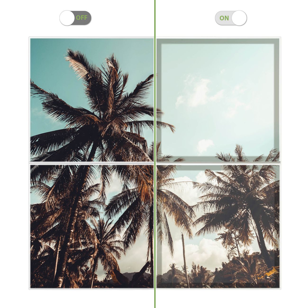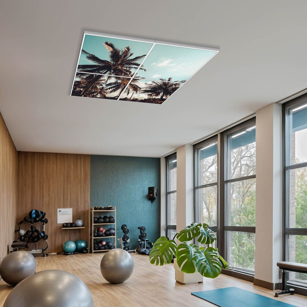 Entdecken Sie unsere vielseitigen Lichtdecken, hier in der Größe 124 x 124cm mit dem Motiv Motiv Unter Palmen - Ihre Beleuchtungslösung für jede Umgebung Beleuchten Sie Ihren Raum nicht nur, sondern schaffen Sie Atmosphäre! Die banjado Lichtdecke verwandelt jeden Ort, ob zu Hause, in Praxen, Büros oder Studios in eine Wohlfühloase. Unsere einzelnen Elemente haben eine genormte Einheitsgröße von 62 x 62cm und können somit in jede gängige Rasterdecken verbaut werden. So finden Sie Ihre passende Ausführung: Gern helfen wir Ihnen, die passende Ausführung zu wählen. Hierfür muss die aktuelle Gegebenheit Ihrer Decke oder Wand beachtet werden. Haben Sie bereits eine Rasterdecke (auch Odenwalddecke genannt)? Hier bestellen Sie lediglich das Motiv + Beleuchtungspanel, denn beides wird in die bereits vorhandene Decke eingelegt. Haben Sie eine glatte Decke mit Lichtauslass oder möchten die Lichtdecke an der Wand befestigen? Hier bestellen Sie bitte Motiv + Beleuchtungspanel + Deckenbefestigung, eine Aufbauanleitung liegt immer bei. Die Lichtdecke kann sowohl an der Decke als auch an der Wand montiert werden, perfekt für kreative Lichtakzente oder alternative Beleuchtungslösungen. Haben Sie bereits eine Lichtdecke und möchten nur das Motiv wechseln? Hier bestellen Sie bitte nur Motiv, der Wechsel ist denkbar einfach. Der Aufbau Ihrer banjado Lichtdecke gestaltet sich unkompliziert, dank einer verständlichen Anleitung, die Ihnen Schritt für Schritt durch den Montageprozess hilft. Für die endgültige Installation und den sicheren Anschluss empfehlen wir die Hinzuziehung eines Fachmanns, um die optimale Funktion und Sicherheit Ihrer Beleuchtung zu gewährleisten. Falls Sie einen Fachmann für die Installation benötigen, geben Sie uns gern Bescheid, wir vermitteln Ihnen gern einen geeigneten Ansprechpartner aus Ihrer Nähe. Steuerung: Steigern Sie Ihr Beleuchtungserlebnis mit der nahtlosen Integration in Ihr Smart Home. Durch die Kompatibilität mit der SmartLife App, Alexa und Google Assistant wird Ihr Smartphone zur zentralen Steuerungseinheit. Ihr Handy fungiert hierbei sozusagen als Fernbedienung. Legen Sie individuelle Lichtszenen in der App fest, die bei Aktivierung über den Wand-Ein-/Ausschalter immer wieder abgerufen werden können ohne Handy. Mit der Szenenfunktion in der Smart App können Sie die Beleuchtung personalisieren und steuern, sodass sie auf Ihre individuellen Bedürfnisse, Tagesrhythmus und Stimmung zugeschnitten ist. Beispielsweise können Sie sich in der Morgendämmerung durch ein sanftes Licht wecken lassen oder das Licht der Praxis werktags um 7 Uhr automatisch einschalten lassen. Dieses kann dann natürlich auch zu einer bestimmten Zeit automatisch ausgeschaltet werden. Motivwahl: Diese einzigartige Lichtdecke zeichnet sich durch ihre Fähigkeit aus, die Lichtfarbe je nach gewähltem Motiv anzupassen - ein Baum wirft ein sanftes grünes Licht, während eine Wolkendecke Ihren Raum in ein beruhigendes blaues Leuchten hüllt. Berücksichtigen Sie dies bitte bei Ihrer Motivauswahl. Sie können das Motiv jederzeit ohne großen Aufwand austauschen, ob nach Jahreszeit oder anderem Anlass, unsere Auswahl lässt kaum Wünsche offen. Wir fertigen Ihnen gern eine personalisierte Lichtdecke mit einem eigenen Motiv oder Logo oder Foto, schreiben Sie uns jederzeit an. Technische Daten: Das Motiv ist auf einer 4mm starken Acrylglas Scheibe aufgebracht, das Gesamtgewicht Ihrer Ausführung beträgt 19,7kg. Die Farbtemperatur lässt sich frei einstellen von 3000 bis 6000 Kelvin, damit können Sie stufenlos zwischen warmweiß, neutralweiß und kaltweiß wählen. Die Gesamtleistung bei Ihrer gewählten Ausführung beträgt 160W. Der Lichtstrom beträgt 3600 Lumen, die Nennspannung 230 V. Die Lichtdecke ist mit Schutzart IP20 für den Innenbereich konzipiert und sollte nicht im Nassbereich verwendet werden.
