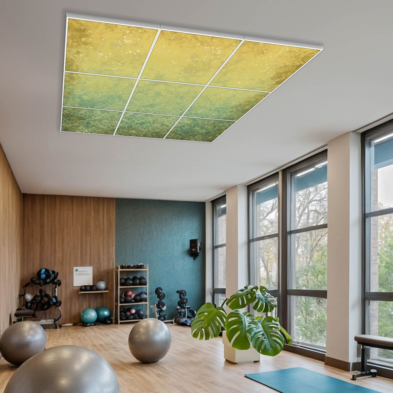 Entdecken Sie unsere vielseitigen Lichtdecken, hier in der Größe 186 x 186cm mit dem Motiv Motiv Vintage Messing - Ihre Beleuchtungslösung für jede Umgebung Beleuchten Sie Ihren Raum nicht nur, sondern schaffen Sie Atmosphäre! Die banjado Lichtdecke verwandelt jeden Ort, ob zu Hause, in Praxen, Büros oder Studios in eine Wohlfühloase. Unsere einzelnen Elemente haben eine genormte Einheitsgröße von 62 x 62cm und können somit in jede gängige Rasterdecken verbaut werden. So finden Sie Ihre passende Ausführung: Gern helfen wir Ihnen, die passende Ausführung zu wählen. Hierfür muss die aktuelle Gegebenheit Ihrer Decke oder Wand beachtet werden. Haben Sie bereits eine Rasterdecke (auch Odenwalddecke genannt)? Hier bestellen Sie lediglich das Motiv + Beleuchtungspanel, denn beides wird in die bereits vorhandene Decke eingelegt. Haben Sie eine glatte Decke mit Lichtauslass oder möchten die Lichtdecke an der Wand befestigen? Hier bestellen Sie bitte Motiv + Beleuchtungspanel + Deckenbefestigung, eine Aufbauanleitung liegt immer bei. Die Lichtdecke kann sowohl an der Decke als auch an der Wand montiert werden, perfekt für kreative Lichtakzente oder alternative Beleuchtungslösungen. Haben Sie bereits eine Lichtdecke und möchten nur das Motiv wechseln? Hier bestellen Sie bitte nur Motiv, der Wechsel ist denkbar einfach. Der Aufbau Ihrer banjado Lichtdecke gestaltet sich unkompliziert, dank einer verständlichen Anleitung, die Ihnen Schritt für Schritt durch den Montageprozess hilft. Für die endgültige Installation und den sicheren Anschluss empfehlen wir die Hinzuziehung eines Fachmanns, um die optimale Funktion und Sicherheit Ihrer Beleuchtung zu gewährleisten. Falls Sie einen Fachmann für die Installation benötigen, geben Sie uns gern Bescheid, wir vermitteln Ihnen gern einen geeigneten Ansprechpartner aus Ihrer Nähe. Steuerung: Steigern Sie Ihr Beleuchtungserlebnis mit der nahtlosen Integration in Ihr Smart Home. Durch die Kompatibilität mit der SmartLife App, Alexa und Google Assistant wird Ihr Smartphone zur zentralen Steuerungseinheit. Ihr Handy fungiert hierbei sozusagen als Fernbedienung. Legen Sie individuelle Lichtszenen in der App fest, die bei Aktivierung über den Wand-Ein-/Ausschalter immer wieder abgerufen werden können ohne Handy. Mit der Szenenfunktion in der Smart App können Sie die Beleuchtung personalisieren und steuern, sodass sie auf Ihre individuellen Bedürfnisse, Tagesrhythmus und Stimmung zugeschnitten ist. Beispielsweise können Sie sich in der Morgendämmerung durch ein sanftes Licht wecken lassen oder das Licht der Praxis werktags um 7 Uhr automatisch einschalten lassen. Dieses kann dann natürlich auch zu einer bestimmten Zeit automatisch ausgeschaltet werden. Motivwahl: Diese einzigartige Lichtdecke zeichnet sich durch ihre Fähigkeit aus, die Lichtfarbe je nach gewähltem Motiv anzupassen - ein Baum wirft ein sanftes grünes Licht, während eine Wolkendecke Ihren Raum in ein beruhigendes blaues Leuchten hüllt. Berücksichtigen Sie dies bitte bei Ihrer Motivauswahl. Sie können das Motiv jederzeit ohne großen Aufwand austauschen, ob nach Jahreszeit oder anderem Anlass, unsere Auswahl lässt kaum Wünsche offen. Wir fertigen Ihnen gern eine personalisierte Lichtdecke mit einem eigenen Motiv oder Logo oder Foto, schreiben Sie uns jederzeit an. Technische Daten: Das Motiv ist auf einer 4mm starken Acrylglas Scheibe aufgebracht, das Gesamtgewicht Ihrer Ausführung beträgt 44,4kg. Die Farbtemperatur lässt sich frei einstellen von 3000 bis 6000 Kelvin, damit können Sie stufenlos zwischen warmweiß, neutralweiß und kaltweiß wählen. Die Gesamtleistung bei Ihrer gewählten Ausführung beträgt 360W. Der Lichtstrom beträgt 3600 Lumen, die Nennspannung 230 V. Die Lichtdecke ist mit Schutzart IP20 für den Innenbereich konzipiert und sollte nicht im Nassbereich verwendet werden.