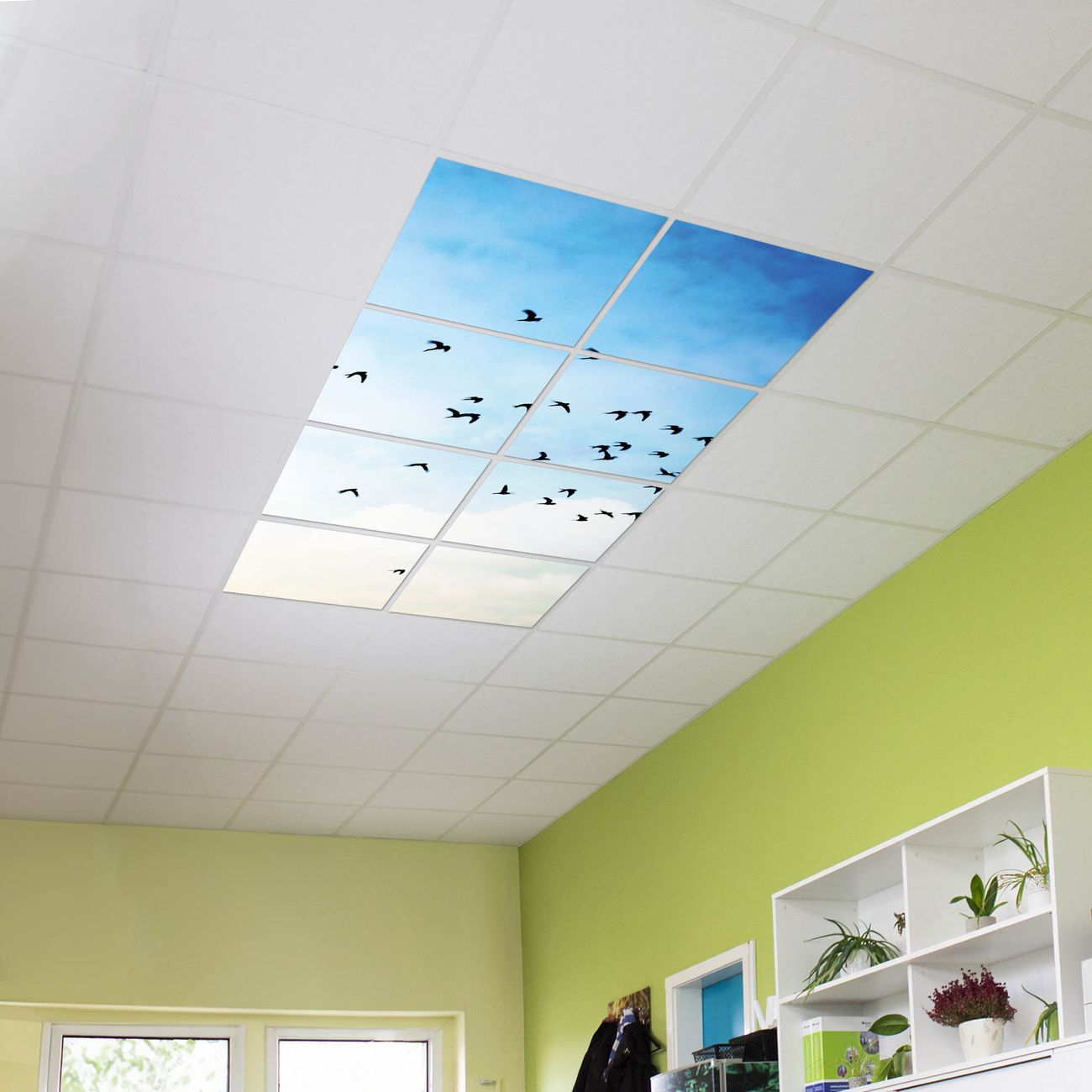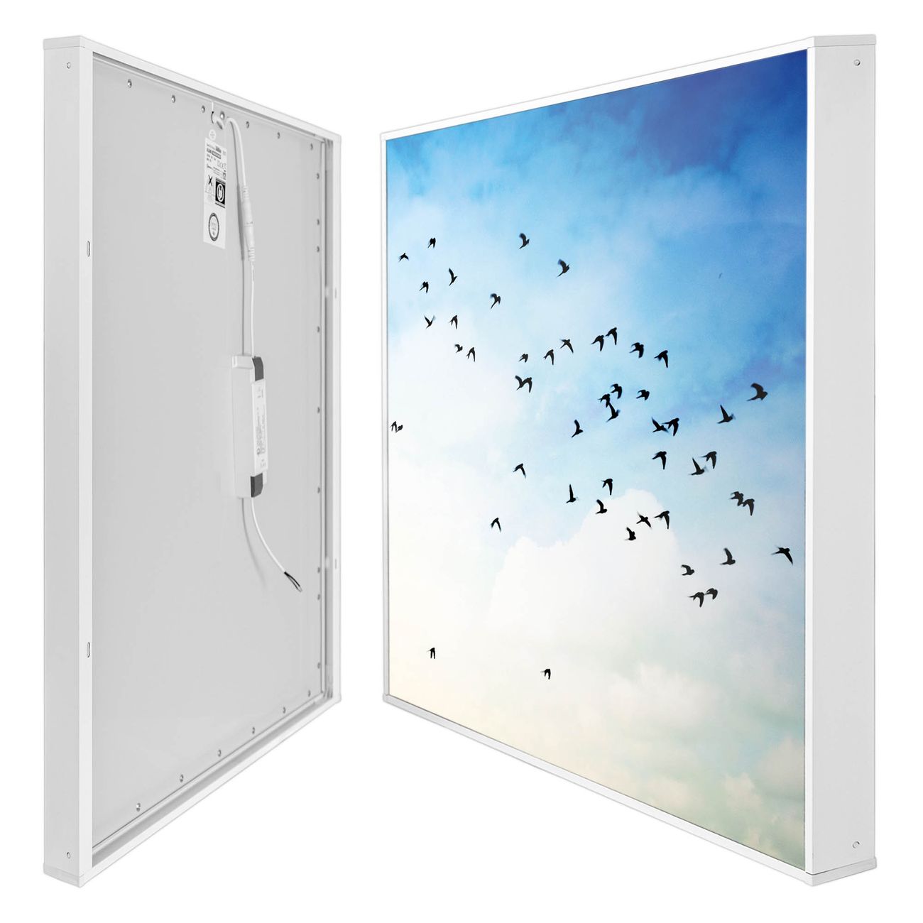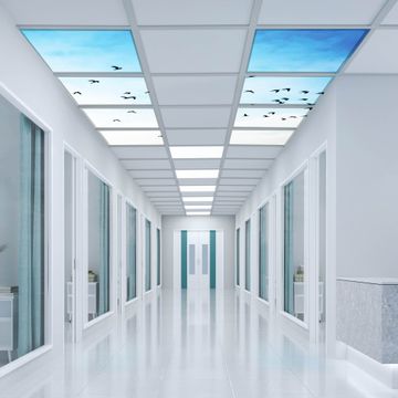 Entdecken Sie unsere vielseitigen Lichtdecken, hier in der Größe 124 x 248cm mit dem Motiv Motiv Vögel am Himmel 2 - Ihre Beleuchtungslösung für jede Umgebung Beleuchten Sie Ihren Raum nicht nur, sondern schaffen Sie Atmosphäre! Die banjado Lichtdecke verwandelt jeden Ort, ob zu Hause, in Praxen, Büros oder Studios in eine Wohlfühloase. Unsere einzelnen Elemente haben eine genormte Einheitsgröße von 62 x 62cm und können somit in jede gängige Rasterdecken verbaut werden. So finden Sie Ihre passende Ausführung: Gern helfen wir Ihnen, die passende Ausführung zu wählen. Hierfür muss die aktuelle Gegebenheit Ihrer Decke oder Wand beachtet werden. Haben Sie bereits eine Rasterdecke (auch Odenwalddecke genannt)? Hier bestellen Sie lediglich das Motiv + Beleuchtungspanel, denn beides wird in die bereits vorhandene Decke eingelegt. Haben Sie eine glatte Decke mit Lichtauslass oder möchten die Lichtdecke an der Wand befestigen? Hier bestellen Sie bitte Motiv + Beleuchtungspanel + Deckenbefestigung, eine Aufbauanleitung liegt immer bei. Die Lichtdecke kann sowohl an der Decke als auch an der Wand montiert werden, perfekt für kreative Lichtakzente oder alternative Beleuchtungslösungen. Haben Sie bereits eine Lichtdecke und möchten nur das Motiv wechseln? Hier bestellen Sie bitte nur Motiv, der Wechsel ist denkbar einfach. Der Aufbau Ihrer banjado Lichtdecke gestaltet sich unkompliziert, dank einer verständlichen Anleitung, die Ihnen Schritt für Schritt durch den Montageprozess hilft. Für die endgültige Installation und den sicheren Anschluss empfehlen wir die Hinzuziehung eines Fachmanns, um die optimale Funktion und Sicherheit Ihrer Beleuchtung zu gewährleisten. Falls Sie einen Fachmann für die Installation benötigen, geben Sie uns gern Bescheid, wir vermitteln Ihnen gern einen geeigneten Ansprechpartner aus Ihrer Nähe. Steuerung: Steigern Sie Ihr Beleuchtungserlebnis mit der nahtlosen Integration in Ihr Smart Home. Durch die Kompatibilität mit der SmartLife App, Alexa und Google Assistant wird Ihr Smartphone zur zentralen Steuerungseinheit. Ihr Handy fungiert hierbei sozusagen als Fernbedienung. Legen Sie individuelle Lichtszenen in der App fest, die bei Aktivierung über den Wand-Ein-/Ausschalter immer wieder abgerufen werden können ohne Handy. Mit der Szenenfunktion in der Smart App können Sie die Beleuchtung personalisieren und steuern, sodass sie auf Ihre individuellen Bedürfnisse, Tagesrhythmus und Stimmung zugeschnitten ist. Beispielsweise können Sie sich in der Morgendämmerung durch ein sanftes Licht wecken lassen oder das Licht der Praxis werktags um 7 Uhr automatisch einschalten lassen. Dieses kann dann natürlich auch zu einer bestimmten Zeit automatisch ausgeschaltet werden. Motivwahl: Diese einzigartige Lichtdecke zeichnet sich durch ihre Fähigkeit aus, die Lichtfarbe je nach gewähltem Motiv anzupassen - ein Baum wirft ein sanftes grünes Licht, während eine Wolkendecke Ihren Raum in ein beruhigendes blaues Leuchten hüllt. Berücksichtigen Sie dies bitte bei Ihrer Motivauswahl. Sie können das Motiv jederzeit ohne großen Aufwand austauschen, ob nach Jahreszeit oder anderem Anlass, unsere Auswahl lässt kaum Wünsche offen. Wir fertigen Ihnen gern eine personalisierte Lichtdecke mit einem eigenen Motiv oder Logo oder Foto, schreiben Sie uns jederzeit an. Technische Daten: Das Motiv ist auf einer 4mm starken Acrylglas Scheibe aufgebracht, das Gesamtgewicht Ihrer Ausführung beträgt 18,1kg. Die Farbtemperatur lässt sich frei einstellen von 3000 bis 6000 Kelvin, damit können Sie stufenlos zwischen warmweiß, neutralweiß und kaltweiß wählen. Die Gesamtleistung bei Ihrer gewählten Ausführung beträgt 320W. Der Lichtstrom beträgt 3600 Lumen, die Nennspannung 230 V. Die Lichtdecke ist mit Schutzart IP20 für den Innenbereich konzipiert und sollte nicht im Nassbereich verwendet werden.