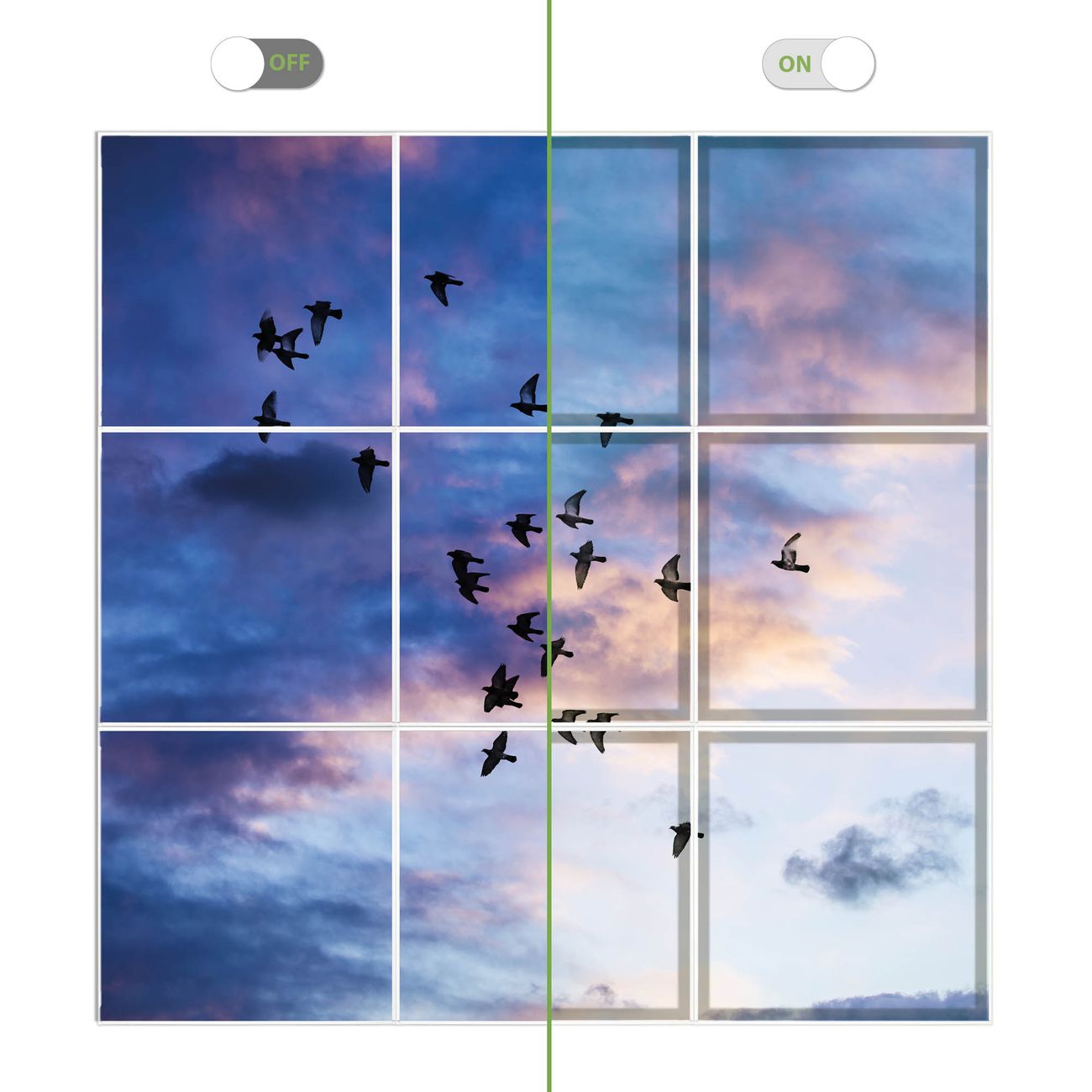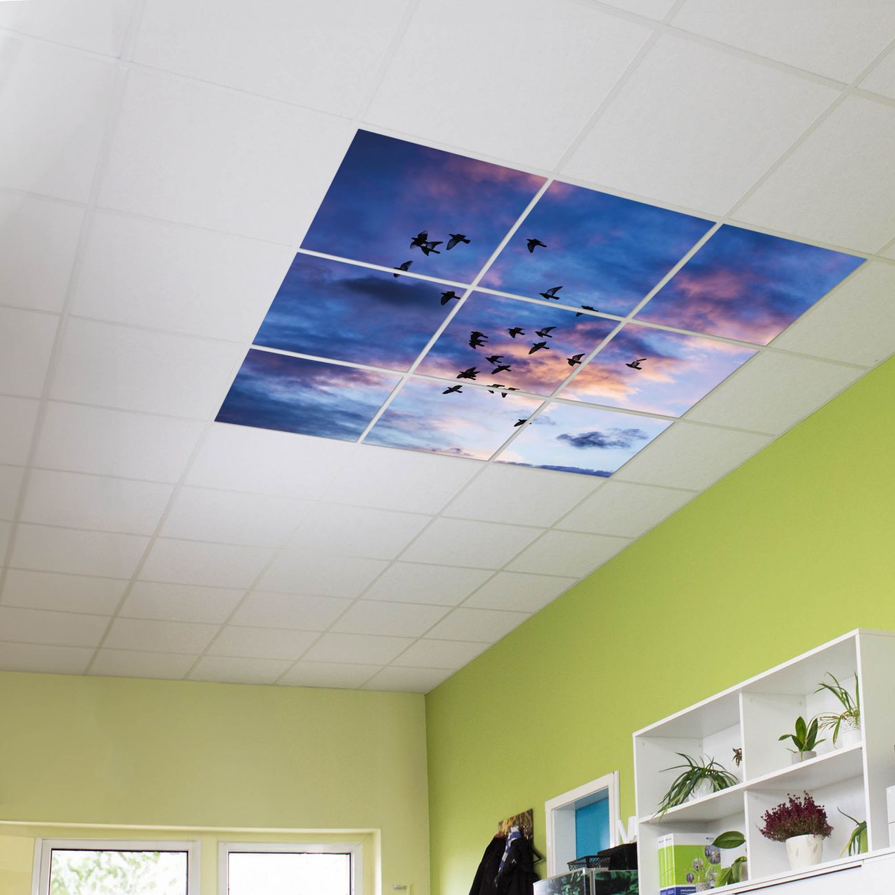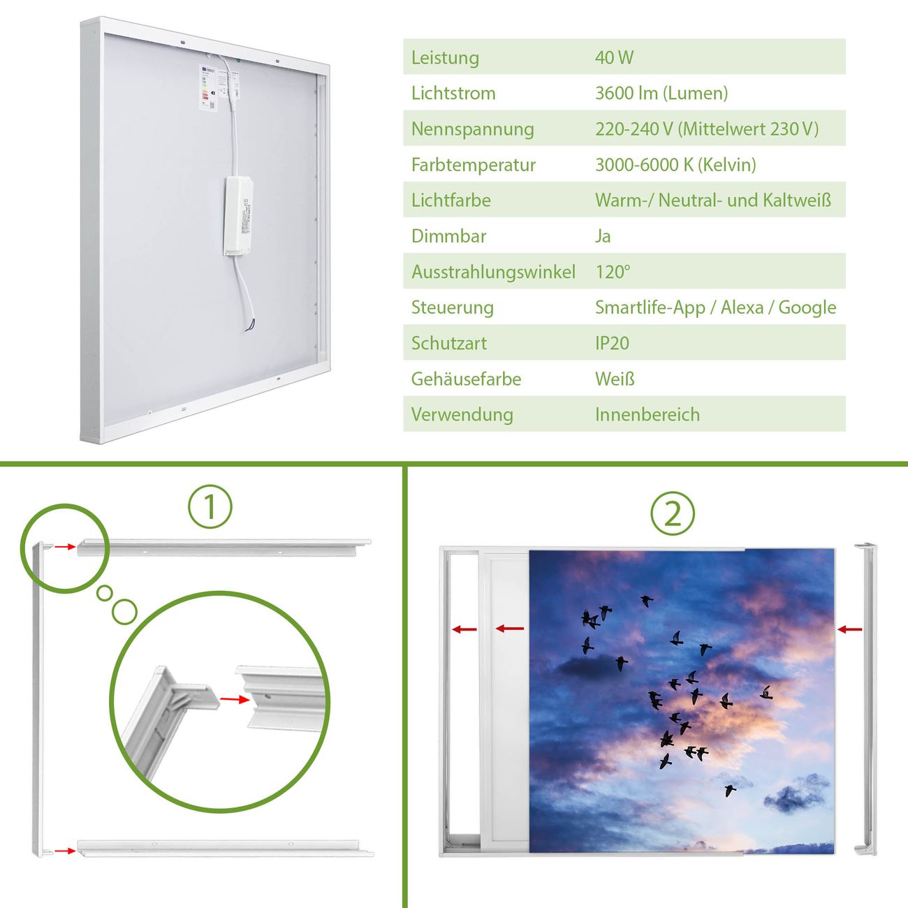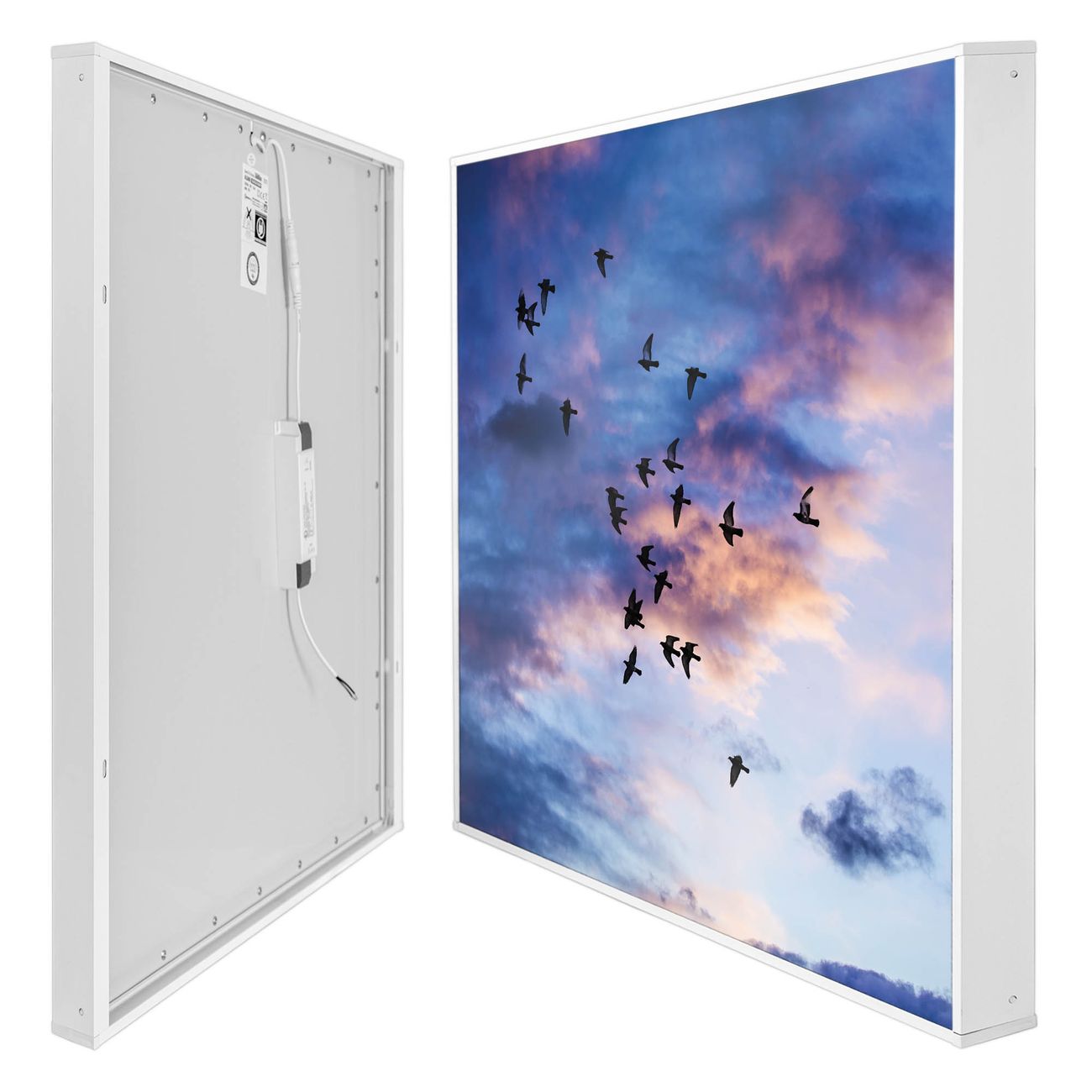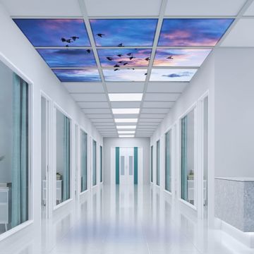 Entdecken Sie unsere vielseitigen Lichtdecken, hier in der Größe 186 x 186cm mit dem Motiv Motiv Vögel am Himmel 3 - Ihre Beleuchtungslösung für jede Umgebung Beleuchten Sie Ihren Raum nicht nur, sondern schaffen Sie Atmosphäre! Die banjado Lichtdecke verwandelt jeden Ort, ob zu Hause, in Praxen, Büros oder Studios in eine Wohlfühloase. Unsere einzelnen Elemente haben eine genormte Einheitsgröße von 62 x 62cm und können somit in jede gängige Rasterdecken verbaut werden. So finden Sie Ihre passende Ausführung: Gern helfen wir Ihnen, die passende Ausführung zu wählen. Hierfür muss die aktuelle Gegebenheit Ihrer Decke oder Wand beachtet werden. Haben Sie bereits eine Rasterdecke (auch Odenwalddecke genannt)? Hier bestellen Sie lediglich das Motiv + Beleuchtungspanel, denn beides wird in die bereits vorhandene Decke eingelegt. Haben Sie eine glatte Decke mit Lichtauslass oder möchten die Lichtdecke an der Wand befestigen? Hier bestellen Sie bitte Motiv + Beleuchtungspanel + Deckenbefestigung, eine Aufbauanleitung liegt immer bei. Die Lichtdecke kann sowohl an der Decke als auch an der Wand montiert werden, perfekt für kreative Lichtakzente oder alternative Beleuchtungslösungen. Haben Sie bereits eine Lichtdecke und möchten nur das Motiv wechseln? Hier bestellen Sie bitte nur Motiv, der Wechsel ist denkbar einfach. Der Aufbau Ihrer banjado Lichtdecke gestaltet sich unkompliziert, dank einer verständlichen Anleitung, die Ihnen Schritt für Schritt durch den Montageprozess hilft. Für die endgültige Installation und den sicheren Anschluss empfehlen wir die Hinzuziehung eines Fachmanns, um die optimale Funktion und Sicherheit Ihrer Beleuchtung zu gewährleisten. Falls Sie einen Fachmann für die Installation benötigen, geben Sie uns gern Bescheid, wir vermitteln Ihnen gern einen geeigneten Ansprechpartner aus Ihrer Nähe. Steuerung: Steigern Sie Ihr Beleuchtungserlebnis mit der nahtlosen Integration in Ihr Smart Home. Durch die Kompatibilität mit der SmartLife App, Alexa und Google Assistant wird Ihr Smartphone zur zentralen Steuerungseinheit. Ihr Handy fungiert hierbei sozusagen als Fernbedienung. Legen Sie individuelle Lichtszenen in der App fest, die bei Aktivierung über den Wand-Ein-/Ausschalter immer wieder abgerufen werden können ohne Handy. Mit der Szenenfunktion in der Smart App können Sie die Beleuchtung personalisieren und steuern, sodass sie auf Ihre individuellen Bedürfnisse, Tagesrhythmus und Stimmung zugeschnitten ist. Beispielsweise können Sie sich in der Morgendämmerung durch ein sanftes Licht wecken lassen oder das Licht der Praxis werktags um 7 Uhr automatisch einschalten lassen. Dieses kann dann natürlich auch zu einer bestimmten Zeit automatisch ausgeschaltet werden. Motivwahl: Diese einzigartige Lichtdecke zeichnet sich durch ihre Fähigkeit aus, die Lichtfarbe je nach gewähltem Motiv anzupassen - ein Baum wirft ein sanftes grünes Licht, während eine Wolkendecke Ihren Raum in ein beruhigendes blaues Leuchten hüllt. Berücksichtigen Sie dies bitte bei Ihrer Motivauswahl. Sie können das Motiv jederzeit ohne großen Aufwand austauschen, ob nach Jahreszeit oder anderem Anlass, unsere Auswahl lässt kaum Wünsche offen. Wir fertigen Ihnen gern eine personalisierte Lichtdecke mit einem eigenen Motiv oder Logo oder Foto, schreiben Sie uns jederzeit an. Technische Daten: Das Motiv ist auf einer 4mm starken Acrylglas Scheibe aufgebracht, das Gesamtgewicht Ihrer Ausführung beträgt 20,4kg. Die Farbtemperatur lässt sich frei einstellen von 3000 bis 6000 Kelvin, damit können Sie stufenlos zwischen warmweiß, neutralweiß und kaltweiß wählen. Die Gesamtleistung bei Ihrer gewählten Ausführung beträgt 360W. Der Lichtstrom beträgt 3600 Lumen, die Nennspannung 230 V. Die Lichtdecke ist mit Schutzart IP20 für den Innenbereich konzipiert und sollte nicht im Nassbereich verwendet werden.