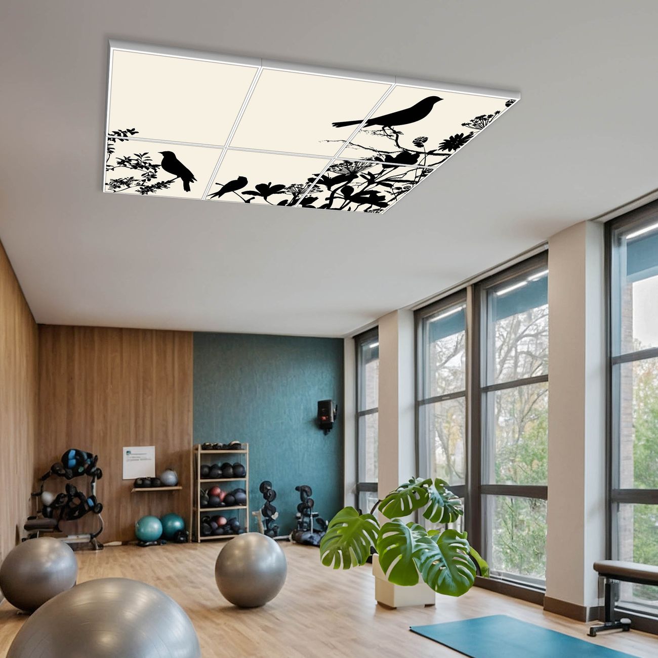 Entdecken Sie unsere vielseitigen Lichtdecken, hier in der Größe 186 x 124cm mit dem Motiv Motiv Vögel Schattenriß - Ihre Beleuchtungslösung für jede Umgebung Beleuchten Sie Ihren Raum nicht nur, sondern schaffen Sie Atmosphäre! Die banjado Lichtdecke verwandelt jeden Ort, ob zu Hause, in Praxen, Büros oder Studios in eine Wohlfühloase. Unsere einzelnen Elemente haben eine genormte Einheitsgröße von 62 x 62cm und können somit in jede gängige Rasterdecken verbaut werden. So finden Sie Ihre passende Ausführung: Gern helfen wir Ihnen, die passende Ausführung zu wählen. Hierfür muss die aktuelle Gegebenheit Ihrer Decke oder Wand beachtet werden. Haben Sie bereits eine Rasterdecke (auch Odenwalddecke genannt)? Hier bestellen Sie lediglich das Motiv + Beleuchtungspanel, denn beides wird in die bereits vorhandene Decke eingelegt. Haben Sie eine glatte Decke mit Lichtauslass oder möchten die Lichtdecke an der Wand befestigen? Hier bestellen Sie bitte Motiv + Beleuchtungspanel + Deckenbefestigung, eine Aufbauanleitung liegt immer bei. Die Lichtdecke kann sowohl an der Decke als auch an der Wand montiert werden, perfekt für kreative Lichtakzente oder alternative Beleuchtungslösungen. Haben Sie bereits eine Lichtdecke und möchten nur das Motiv wechseln? Hier bestellen Sie bitte nur Motiv, der Wechsel ist denkbar einfach. Der Aufbau Ihrer banjado Lichtdecke gestaltet sich unkompliziert, dank einer verständlichen Anleitung, die Ihnen Schritt für Schritt durch den Montageprozess hilft. Für die endgültige Installation und den sicheren Anschluss empfehlen wir die Hinzuziehung eines Fachmanns, um die optimale Funktion und Sicherheit Ihrer Beleuchtung zu gewährleisten. Falls Sie einen Fachmann für die Installation benötigen, geben Sie uns gern Bescheid, wir vermitteln Ihnen gern einen geeigneten Ansprechpartner aus Ihrer Nähe. Steuerung: Steigern Sie Ihr Beleuchtungserlebnis mit der nahtlosen Integration in Ihr Smart Home. Durch die Kompatibilität mit der SmartLife App, Alexa und Google Assistant wird Ihr Smartphone zur zentralen Steuerungseinheit. Ihr Handy fungiert hierbei sozusagen als Fernbedienung. Legen Sie individuelle Lichtszenen in der App fest, die bei Aktivierung über den Wand-Ein-/Ausschalter immer wieder abgerufen werden können ohne Handy. Mit der Szenenfunktion in der Smart App können Sie die Beleuchtung personalisieren und steuern, sodass sie auf Ihre individuellen Bedürfnisse, Tagesrhythmus und Stimmung zugeschnitten ist. Beispielsweise können Sie sich in der Morgendämmerung durch ein sanftes Licht wecken lassen oder das Licht der Praxis werktags um 7 Uhr automatisch einschalten lassen. Dieses kann dann natürlich auch zu einer bestimmten Zeit automatisch ausgeschaltet werden. Motivwahl: Diese einzigartige Lichtdecke zeichnet sich durch ihre Fähigkeit aus, die Lichtfarbe je nach gewähltem Motiv anzupassen - ein Baum wirft ein sanftes grünes Licht, während eine Wolkendecke Ihren Raum in ein beruhigendes blaues Leuchten hüllt. Berücksichtigen Sie dies bitte bei Ihrer Motivauswahl. Sie können das Motiv jederzeit ohne großen Aufwand austauschen, ob nach Jahreszeit oder anderem Anlass, unsere Auswahl lässt kaum Wünsche offen. Wir fertigen Ihnen gern eine personalisierte Lichtdecke mit einem eigenen Motiv oder Logo oder Foto, schreiben Sie uns jederzeit an. Technische Daten: Das Motiv ist auf einer 4mm starken Acrylglas Scheibe aufgebracht, das Gesamtgewicht Ihrer Ausführung beträgt 29,6kg. Die Farbtemperatur lässt sich frei einstellen von 3000 bis 6000 Kelvin, damit können Sie stufenlos zwischen warmweiß, neutralweiß und kaltweiß wählen. Die Gesamtleistung bei Ihrer gewählten Ausführung beträgt 240W. Der Lichtstrom beträgt 3600 Lumen, die Nennspannung 230 V. Die Lichtdecke ist mit Schutzart IP20 für den Innenbereich konzipiert und sollte nicht im Nassbereich verwendet werden.