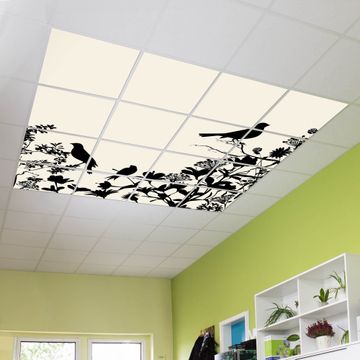 Entdecken Sie unsere vielseitigen Lichtdecken, hier in der Größe 248 x 248cm mit dem Motiv Motiv Vögel Schattenriß - Ihre Beleuchtungslösung für jede Umgebung Beleuchten Sie Ihren Raum nicht nur, sondern schaffen Sie Atmosphäre! Die banjado Lichtdecke verwandelt jeden Ort, ob zu Hause, in Praxen, Büros oder Studios in eine Wohlfühloase. Unsere einzelnen Elemente haben eine genormte Einheitsgröße von 62 x 62cm und können somit in jede gängige Rasterdecken verbaut werden. So finden Sie Ihre passende Ausführung: Gern helfen wir Ihnen, die passende Ausführung zu wählen. Hierfür muss die aktuelle Gegebenheit Ihrer Decke oder Wand beachtet werden. Haben Sie bereits eine Rasterdecke (auch Odenwalddecke genannt)? Hier bestellen Sie lediglich das Motiv + Beleuchtungspanel, denn beides wird in die bereits vorhandene Decke eingelegt. Haben Sie eine glatte Decke mit Lichtauslass oder möchten die Lichtdecke an der Wand befestigen? Hier bestellen Sie bitte Motiv + Beleuchtungspanel + Deckenbefestigung, eine Aufbauanleitung liegt immer bei. Die Lichtdecke kann sowohl an der Decke als auch an der Wand montiert werden, perfekt für kreative Lichtakzente oder alternative Beleuchtungslösungen. Haben Sie bereits eine Lichtdecke und möchten nur das Motiv wechseln? Hier bestellen Sie bitte nur Motiv, der Wechsel ist denkbar einfach. Der Aufbau Ihrer banjado Lichtdecke gestaltet sich unkompliziert, dank einer verständlichen Anleitung, die Ihnen Schritt für Schritt durch den Montageprozess hilft. Für die endgültige Installation und den sicheren Anschluss empfehlen wir die Hinzuziehung eines Fachmanns, um die optimale Funktion und Sicherheit Ihrer Beleuchtung zu gewährleisten. Falls Sie einen Fachmann für die Installation benötigen, geben Sie uns gern Bescheid, wir vermitteln Ihnen gern einen geeigneten Ansprechpartner aus Ihrer Nähe. Steuerung: Steigern Sie Ihr Beleuchtungserlebnis mit der nahtlosen Integration in Ihr Smart Home. Durch die Kompatibilität mit der SmartLife App, Alexa und Google Assistant wird Ihr Smartphone zur zentralen Steuerungseinheit. Ihr Handy fungiert hierbei sozusagen als Fernbedienung. Legen Sie individuelle Lichtszenen in der App fest, die bei Aktivierung über den Wand-Ein-/Ausschalter immer wieder abgerufen werden können ohne Handy. Mit der Szenenfunktion in der Smart App können Sie die Beleuchtung personalisieren und steuern, sodass sie auf Ihre individuellen Bedürfnisse, Tagesrhythmus und Stimmung zugeschnitten ist. Beispielsweise können Sie sich in der Morgendämmerung durch ein sanftes Licht wecken lassen oder das Licht der Praxis werktags um 7 Uhr automatisch einschalten lassen. Dieses kann dann natürlich auch zu einer bestimmten Zeit automatisch ausgeschaltet werden. Motivwahl: Diese einzigartige Lichtdecke zeichnet sich durch ihre Fähigkeit aus, die Lichtfarbe je nach gewähltem Motiv anzupassen - ein Baum wirft ein sanftes grünes Licht, während eine Wolkendecke Ihren Raum in ein beruhigendes blaues Leuchten hüllt. Berücksichtigen Sie dies bitte bei Ihrer Motivauswahl. Sie können das Motiv jederzeit ohne großen Aufwand austauschen, ob nach Jahreszeit oder anderem Anlass, unsere Auswahl lässt kaum Wünsche offen. Wir fertigen Ihnen gern eine personalisierte Lichtdecke mit einem eigenen Motiv oder Logo oder Foto, schreiben Sie uns jederzeit an. Technische Daten: Das Motiv ist auf einer 4mm starken Acrylglas Scheibe aufgebracht, das Gesamtgewicht Ihrer Ausführung beträgt 70,9kg. Die Farbtemperatur lässt sich frei einstellen von 3000 bis 6000 Kelvin, damit können Sie stufenlos zwischen warmweiß, neutralweiß und kaltweiß wählen. Die Gesamtleistung bei Ihrer gewählten Ausführung beträgt 640W. Der Lichtstrom beträgt 3600 Lumen, die Nennspannung 230 V. Die Lichtdecke ist mit Schutzart IP20 für den Innenbereich konzipiert und sollte nicht im Nassbereich verwendet werden.