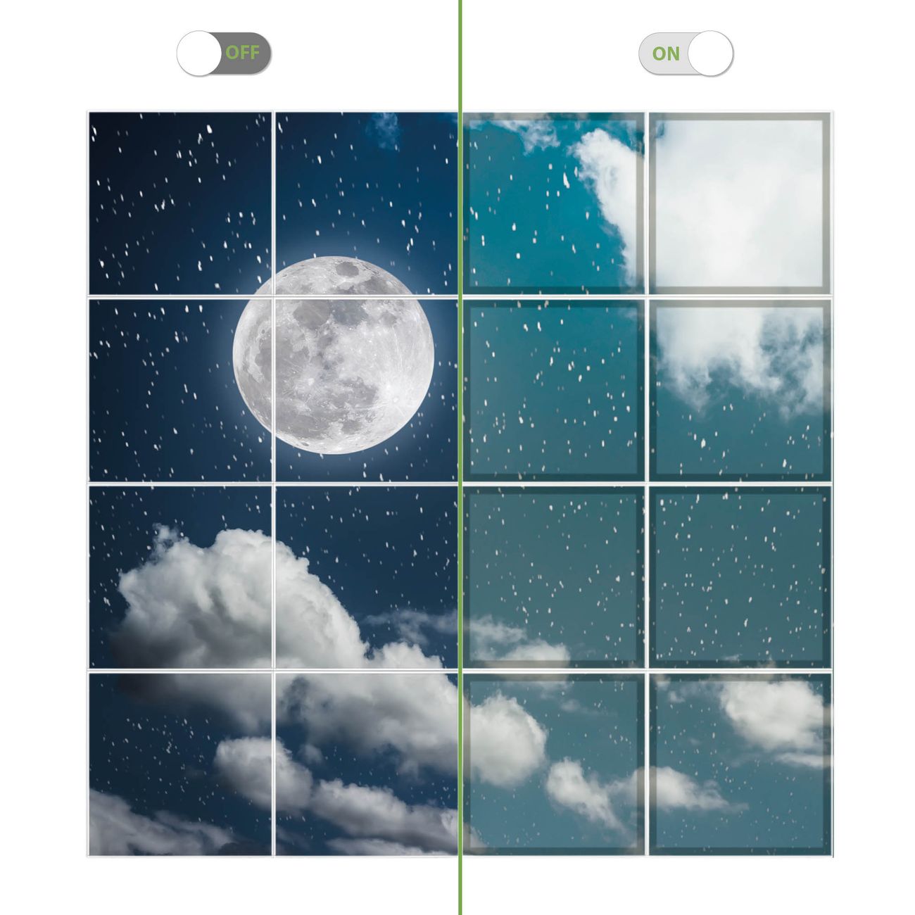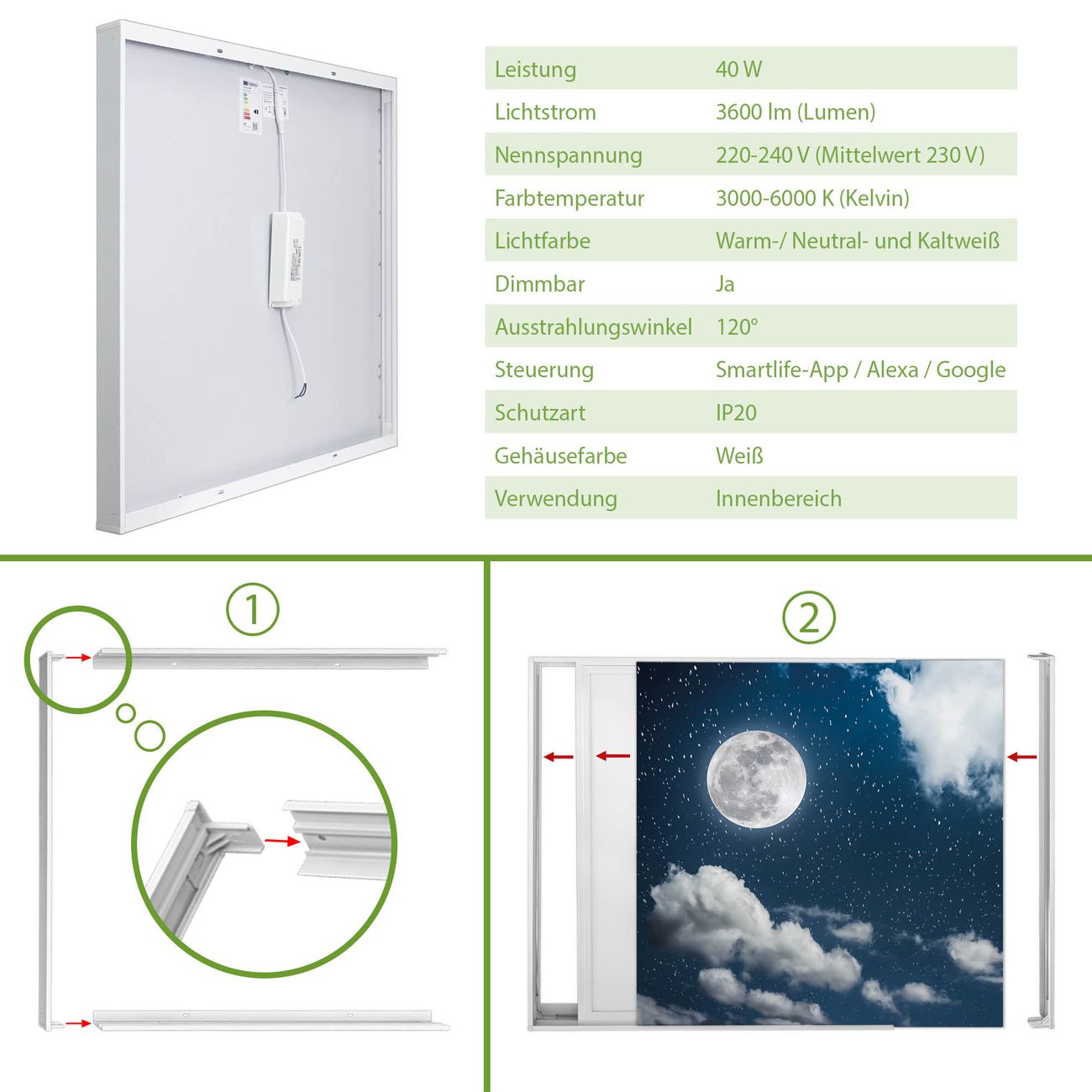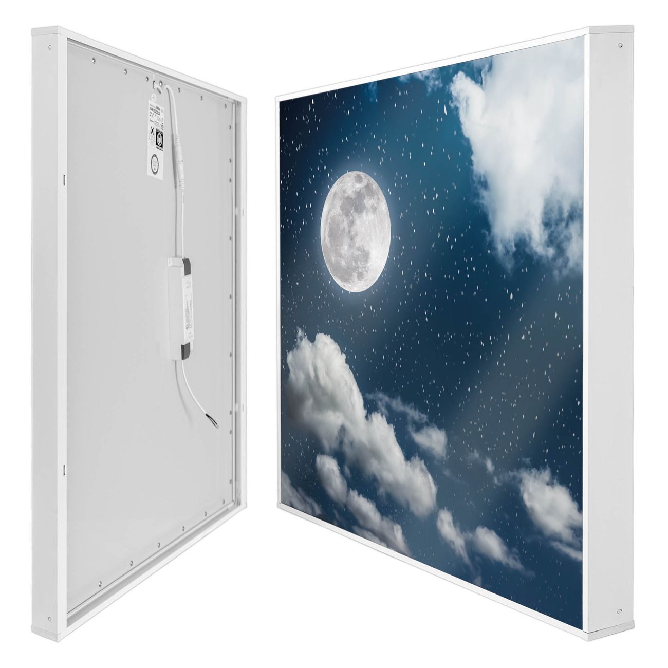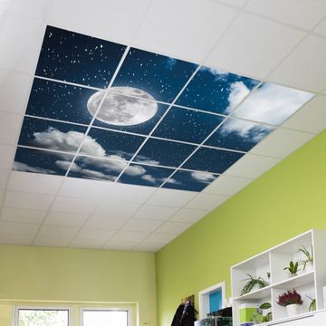 Entdecken Sie unsere vielseitigen Lichtdecken, hier in der Größe 248 x 248cm mit dem Motiv Motiv Vollmond 3 - Ihre Beleuchtungslösung für jede Umgebung Beleuchten Sie Ihren Raum nicht nur, sondern schaffen Sie Atmosphäre! Die banjado Lichtdecke verwandelt jeden Ort, ob zu Hause, in Praxen, Büros oder Studios in eine Wohlfühloase. Unsere einzelnen Elemente haben eine genormte Einheitsgröße von 62 x 62cm und können somit in jede gängige Rasterdecken verbaut werden. So finden Sie Ihre passende Ausführung: Gern helfen wir Ihnen, die passende Ausführung zu wählen. Hierfür muss die aktuelle Gegebenheit Ihrer Decke oder Wand beachtet werden. Haben Sie bereits eine Rasterdecke (auch Odenwalddecke genannt)? Hier bestellen Sie lediglich das Motiv + Beleuchtungspanel, denn beides wird in die bereits vorhandene Decke eingelegt. Haben Sie eine glatte Decke mit Lichtauslass oder möchten die Lichtdecke an der Wand befestigen? Hier bestellen Sie bitte Motiv + Beleuchtungspanel + Deckenbefestigung, eine Aufbauanleitung liegt immer bei. Die Lichtdecke kann sowohl an der Decke als auch an der Wand montiert werden, perfekt für kreative Lichtakzente oder alternative Beleuchtungslösungen. Haben Sie bereits eine Lichtdecke und möchten nur das Motiv wechseln? Hier bestellen Sie bitte nur Motiv, der Wechsel ist denkbar einfach. Der Aufbau Ihrer banjado Lichtdecke gestaltet sich unkompliziert, dank einer verständlichen Anleitung, die Ihnen Schritt für Schritt durch den Montageprozess hilft. Für die endgültige Installation und den sicheren Anschluss empfehlen wir die Hinzuziehung eines Fachmanns, um die optimale Funktion und Sicherheit Ihrer Beleuchtung zu gewährleisten. Falls Sie einen Fachmann für die Installation benötigen, geben Sie uns gern Bescheid, wir vermitteln Ihnen gern einen geeigneten Ansprechpartner aus Ihrer Nähe. Steuerung: Steigern Sie Ihr Beleuchtungserlebnis mit der nahtlosen Integration in Ihr Smart Home. Durch die Kompatibilität mit der SmartLife App, Alexa und Google Assistant wird Ihr Smartphone zur zentralen Steuerungseinheit. Ihr Handy fungiert hierbei sozusagen als Fernbedienung. Legen Sie individuelle Lichtszenen in der App fest, die bei Aktivierung über den Wand-Ein-/Ausschalter immer wieder abgerufen werden können ohne Handy. Mit der Szenenfunktion in der Smart App können Sie die Beleuchtung personalisieren und steuern, sodass sie auf Ihre individuellen Bedürfnisse, Tagesrhythmus und Stimmung zugeschnitten ist. Beispielsweise können Sie sich in der Morgendämmerung durch ein sanftes Licht wecken lassen oder das Licht der Praxis werktags um 7 Uhr automatisch einschalten lassen. Dieses kann dann natürlich auch zu einer bestimmten Zeit automatisch ausgeschaltet werden. Motivwahl: Diese einzigartige Lichtdecke zeichnet sich durch ihre Fähigkeit aus, die Lichtfarbe je nach gewähltem Motiv anzupassen - ein Baum wirft ein sanftes grünes Licht, während eine Wolkendecke Ihren Raum in ein beruhigendes blaues Leuchten hüllt. Berücksichtigen Sie dies bitte bei Ihrer Motivauswahl. Sie können das Motiv jederzeit ohne großen Aufwand austauschen, ob nach Jahreszeit oder anderem Anlass, unsere Auswahl lässt kaum Wünsche offen. Wir fertigen Ihnen gern eine personalisierte Lichtdecke mit einem eigenen Motiv oder Logo oder Foto, schreiben Sie uns jederzeit an. Technische Daten: Das Motiv ist auf einer 4mm starken Acrylglas Scheibe aufgebracht, das Gesamtgewicht Ihrer Ausführung beträgt 70,9kg. Die Farbtemperatur lässt sich frei einstellen von 3000 bis 6000 Kelvin, damit können Sie stufenlos zwischen warmweiß, neutralweiß und kaltweiß wählen. Die Gesamtleistung bei Ihrer gewählten Ausführung beträgt 640W. Der Lichtstrom beträgt 3600 Lumen, die Nennspannung 230 V. Die Lichtdecke ist mit Schutzart IP20 für den Innenbereich konzipiert und sollte nicht im Nassbereich verwendet werden.