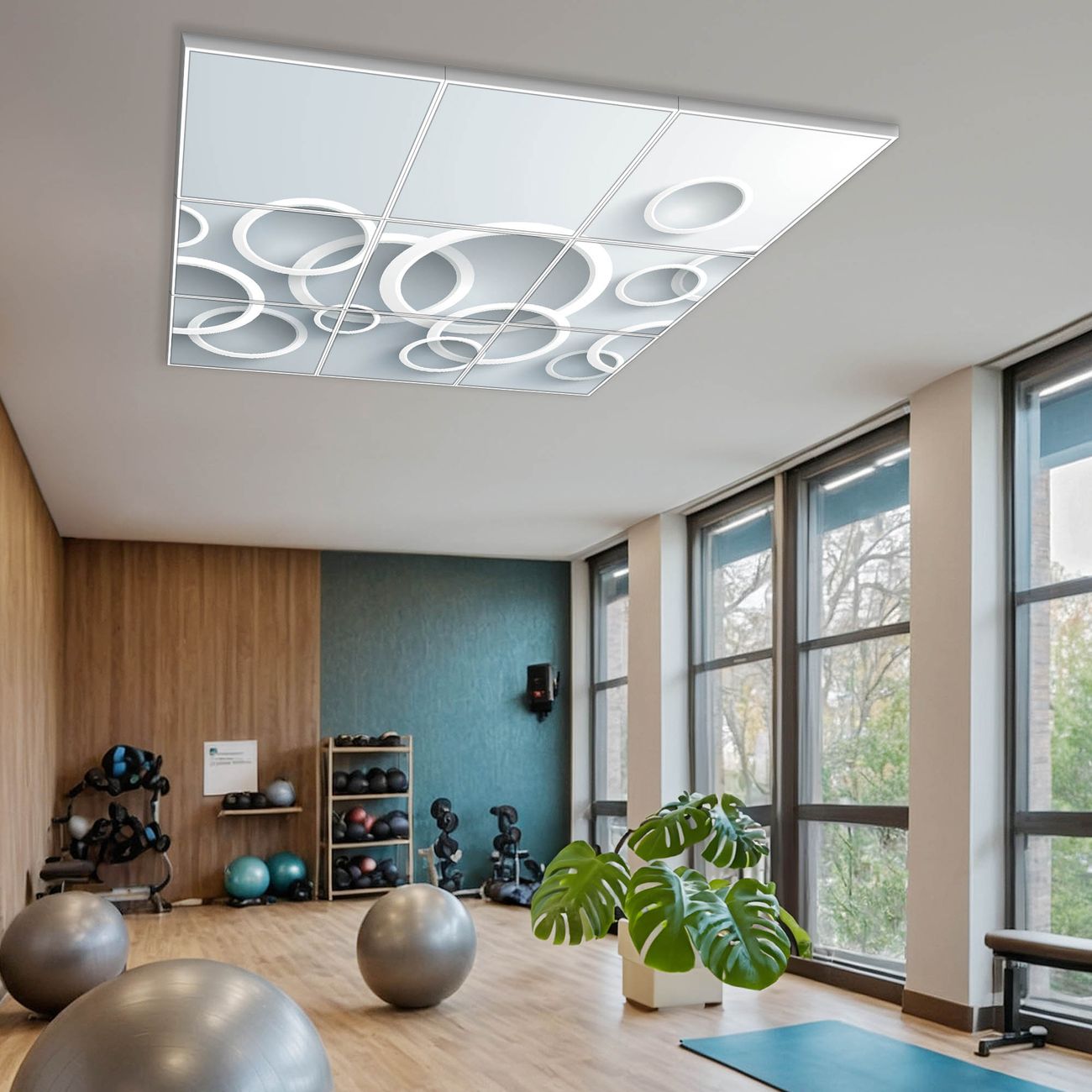 Entdecken Sie unsere vielseitigen Lichtdecken, hier in der Größe 186 x 186cm mit dem Motiv Motiv Weiße Ringe - Ihre Beleuchtungslösung für jede Umgebung Beleuchten Sie Ihren Raum nicht nur, sondern schaffen Sie Atmosphäre! Die banjado Lichtdecke verwandelt jeden Ort, ob zu Hause, in Praxen, Büros oder Studios in eine Wohlfühloase. Unsere einzelnen Elemente haben eine genormte Einheitsgröße von 62 x 62cm und können somit in jede gängige Rasterdecken verbaut werden. So finden Sie Ihre passende Ausführung: Gern helfen wir Ihnen, die passende Ausführung zu wählen. Hierfür muss die aktuelle Gegebenheit Ihrer Decke oder Wand beachtet werden. Haben Sie bereits eine Rasterdecke (auch Odenwalddecke genannt)? Hier bestellen Sie lediglich das Motiv + Beleuchtungspanel, denn beides wird in die bereits vorhandene Decke eingelegt. Haben Sie eine glatte Decke mit Lichtauslass oder möchten die Lichtdecke an der Wand befestigen? Hier bestellen Sie bitte Motiv + Beleuchtungspanel + Deckenbefestigung, eine Aufbauanleitung liegt immer bei. Die Lichtdecke kann sowohl an der Decke als auch an der Wand montiert werden, perfekt für kreative Lichtakzente oder alternative Beleuchtungslösungen. Haben Sie bereits eine Lichtdecke und möchten nur das Motiv wechseln? Hier bestellen Sie bitte nur Motiv, der Wechsel ist denkbar einfach. Der Aufbau Ihrer banjado Lichtdecke gestaltet sich unkompliziert, dank einer verständlichen Anleitung, die Ihnen Schritt für Schritt durch den Montageprozess hilft. Für die endgültige Installation und den sicheren Anschluss empfehlen wir die Hinzuziehung eines Fachmanns, um die optimale Funktion und Sicherheit Ihrer Beleuchtung zu gewährleisten. Falls Sie einen Fachmann für die Installation benötigen, geben Sie uns gern Bescheid, wir vermitteln Ihnen gern einen geeigneten Ansprechpartner aus Ihrer Nähe. Steuerung: Steigern Sie Ihr Beleuchtungserlebnis mit der nahtlosen Integration in Ihr Smart Home. Durch die Kompatibilität mit der SmartLife App, Alexa und Google Assistant wird Ihr Smartphone zur zentralen Steuerungseinheit. Ihr Handy fungiert hierbei sozusagen als Fernbedienung. Legen Sie individuelle Lichtszenen in der App fest, die bei Aktivierung über den Wand-Ein-/Ausschalter immer wieder abgerufen werden können ohne Handy. Mit der Szenenfunktion in der Smart App können Sie die Beleuchtung personalisieren und steuern, sodass sie auf Ihre individuellen Bedürfnisse, Tagesrhythmus und Stimmung zugeschnitten ist. Beispielsweise können Sie sich in der Morgendämmerung durch ein sanftes Licht wecken lassen oder das Licht der Praxis werktags um 7 Uhr automatisch einschalten lassen. Dieses kann dann natürlich auch zu einer bestimmten Zeit automatisch ausgeschaltet werden. Motivwahl: Diese einzigartige Lichtdecke zeichnet sich durch ihre Fähigkeit aus, die Lichtfarbe je nach gewähltem Motiv anzupassen - ein Baum wirft ein sanftes grünes Licht, während eine Wolkendecke Ihren Raum in ein beruhigendes blaues Leuchten hüllt. Berücksichtigen Sie dies bitte bei Ihrer Motivauswahl. Sie können das Motiv jederzeit ohne großen Aufwand austauschen, ob nach Jahreszeit oder anderem Anlass, unsere Auswahl lässt kaum Wünsche offen. Wir fertigen Ihnen gern eine personalisierte Lichtdecke mit einem eigenen Motiv oder Logo oder Foto, schreiben Sie uns jederzeit an. Technische Daten: Das Motiv ist auf einer 4mm starken Acrylglas Scheibe aufgebracht, das Gesamtgewicht Ihrer Ausführung beträgt 44,4kg. Die Farbtemperatur lässt sich frei einstellen von 3000 bis 6000 Kelvin, damit können Sie stufenlos zwischen warmweiß, neutralweiß und kaltweiß wählen. Die Gesamtleistung bei Ihrer gewählten Ausführung beträgt 360W. Der Lichtstrom beträgt 3600 Lumen, die Nennspannung 230 V. Die Lichtdecke ist mit Schutzart IP20 für den Innenbereich konzipiert und sollte nicht im Nassbereich verwendet werden.