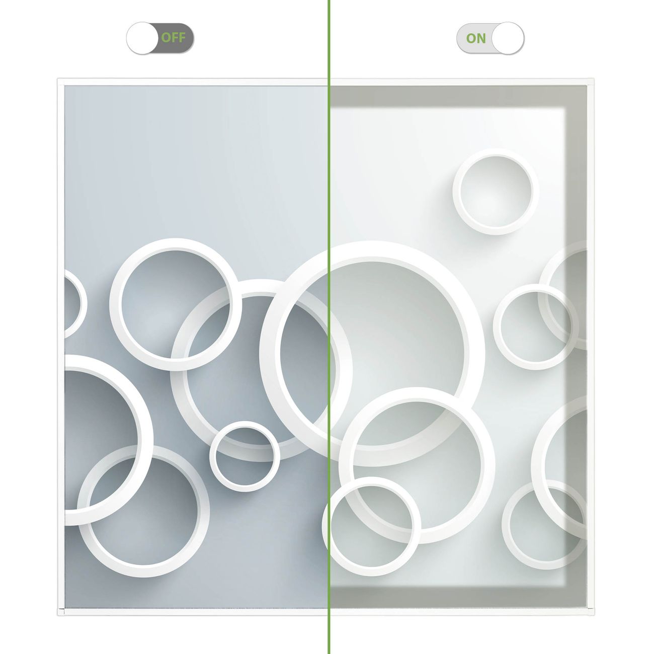 Entdecken Sie unsere vielseitigen Lichtdecken, hier in der Größe 62 x 62cm mit dem Motiv Motiv Weiße Ringe - Ihre Beleuchtungslösung für jede Umgebung Beleuchten Sie Ihren Raum nicht nur, sondern schaffen Sie Atmosphäre! Die banjado Lichtdecke verwandelt jeden Ort, ob zu Hause, in Praxen, Büros oder Studios in eine Wohlfühloase. Unsere einzelnen Elemente haben eine genormte Einheitsgröße von 62 x 62cm und können somit in jede gängige Rasterdecken verbaut werden. So finden Sie Ihre passende Ausführung: Gern helfen wir Ihnen, die passende Ausführung zu wählen. Hierfür muss die aktuelle Gegebenheit Ihrer Decke oder Wand beachtet werden. Haben Sie bereits eine Rasterdecke (auch Odenwalddecke genannt)? Hier bestellen Sie lediglich das Motiv + Beleuchtungspanel, denn beides wird in die bereits vorhandene Decke eingelegt. Haben Sie eine glatte Decke mit Lichtauslass oder möchten die Lichtdecke an der Wand befestigen? Hier bestellen Sie bitte Motiv + Beleuchtungspanel + Deckenbefestigung, eine Aufbauanleitung liegt immer bei. Die Lichtdecke kann sowohl an der Decke als auch an der Wand montiert werden, perfekt für kreative Lichtakzente oder alternative Beleuchtungslösungen. Haben Sie bereits eine Lichtdecke und möchten nur das Motiv wechseln? Hier bestellen Sie bitte nur Motiv, der Wechsel ist denkbar einfach. Der Aufbau Ihrer banjado Lichtdecke gestaltet sich unkompliziert, dank einer verständlichen Anleitung, die Ihnen Schritt für Schritt durch den Montageprozess hilft. Für die endgültige Installation und den sicheren Anschluss empfehlen wir die Hinzuziehung eines Fachmanns, um die optimale Funktion und Sicherheit Ihrer Beleuchtung zu gewährleisten. Falls Sie einen Fachmann für die Installation benötigen, geben Sie uns gern Bescheid, wir vermitteln Ihnen gern einen geeigneten Ansprechpartner aus Ihrer Nähe. Steuerung: Steigern Sie Ihr Beleuchtungserlebnis mit der nahtlosen Integration in Ihr Smart Home. Durch die Kompatibilität mit der SmartLife App, Alexa und Google Assistant wird Ihr Smartphone zur zentralen Steuerungseinheit. Ihr Handy fungiert hierbei sozusagen als Fernbedienung. Legen Sie individuelle Lichtszenen in der App fest, die bei Aktivierung über den Wand-Ein-/Ausschalter immer wieder abgerufen werden können ohne Handy. Mit der Szenenfunktion in der Smart App können Sie die Beleuchtung personalisieren und steuern, sodass sie auf Ihre individuellen Bedürfnisse, Tagesrhythmus und Stimmung zugeschnitten ist. Beispielsweise können Sie sich in der Morgendämmerung durch ein sanftes Licht wecken lassen oder das Licht der Praxis werktags um 7 Uhr automatisch einschalten lassen. Dieses kann dann natürlich auch zu einer bestimmten Zeit automatisch ausgeschaltet werden. Motivwahl: Diese einzigartige Lichtdecke zeichnet sich durch ihre Fähigkeit aus, die Lichtfarbe je nach gewähltem Motiv anzupassen - ein Baum wirft ein sanftes grünes Licht, während eine Wolkendecke Ihren Raum in ein beruhigendes blaues Leuchten hüllt. Berücksichtigen Sie dies bitte bei Ihrer Motivauswahl. Sie können das Motiv jederzeit ohne großen Aufwand austauschen, ob nach Jahreszeit oder anderem Anlass, unsere Auswahl lässt kaum Wünsche offen. Wir fertigen Ihnen gern eine personalisierte Lichtdecke mit einem eigenen Motiv oder Logo oder Foto, schreiben Sie uns jederzeit an. Technische Daten: Das Motiv ist auf einer 4mm starken Acrylglas Scheibe aufgebracht, das Gesamtgewicht Ihrer Ausführung beträgt 2,3kg. Die Farbtemperatur lässt sich frei einstellen von 3000 bis 6000 Kelvin, damit können Sie stufenlos zwischen warmweiß, neutralweiß und kaltweiß wählen. Die Gesamtleistung bei Ihrer gewählten Ausführung beträgt 40W. Der Lichtstrom beträgt 3600 Lumen, die Nennspannung 230 V. Die Lichtdecke ist mit Schutzart IP20 für den Innenbereich konzipiert und sollte nicht im Nassbereich verwendet werden.