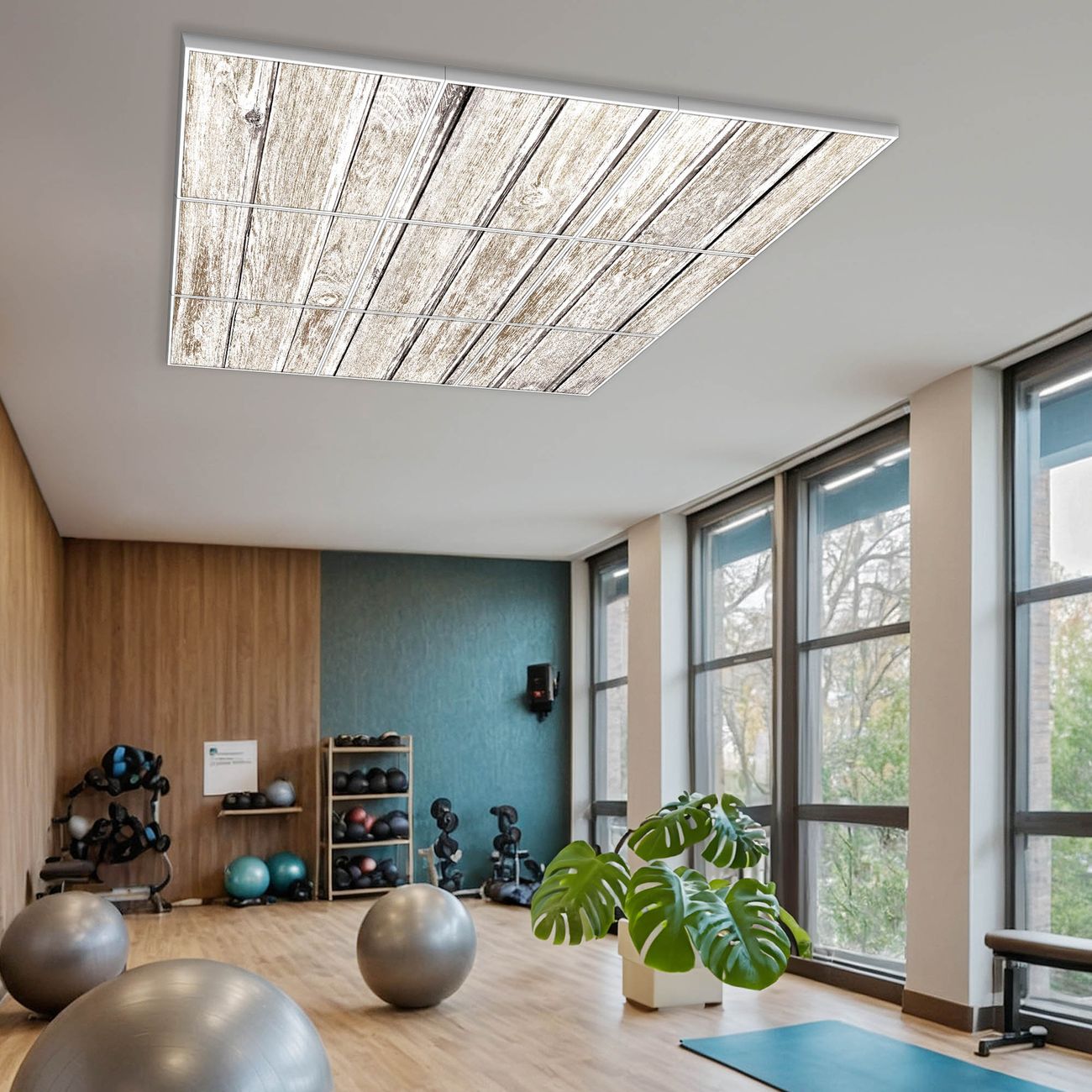 Entdecken Sie unsere vielseitigen Lichtdecken, hier in der Größe 186 x 186cm mit dem Motiv Motiv Weißes Holz - Ihre Beleuchtungslösung für jede Umgebung Beleuchten Sie Ihren Raum nicht nur, sondern schaffen Sie Atmosphäre! Die banjado Lichtdecke verwandelt jeden Ort, ob zu Hause, in Praxen, Büros oder Studios in eine Wohlfühloase. Unsere einzelnen Elemente haben eine genormte Einheitsgröße von 62 x 62cm und können somit in jede gängige Rasterdecken verbaut werden. So finden Sie Ihre passende Ausführung: Gern helfen wir Ihnen, die passende Ausführung zu wählen. Hierfür muss die aktuelle Gegebenheit Ihrer Decke oder Wand beachtet werden. Haben Sie bereits eine Rasterdecke (auch Odenwalddecke genannt)? Hier bestellen Sie lediglich das Motiv + Beleuchtungspanel, denn beides wird in die bereits vorhandene Decke eingelegt. Haben Sie eine glatte Decke mit Lichtauslass oder möchten die Lichtdecke an der Wand befestigen? Hier bestellen Sie bitte Motiv + Beleuchtungspanel + Deckenbefestigung, eine Aufbauanleitung liegt immer bei. Die Lichtdecke kann sowohl an der Decke als auch an der Wand montiert werden, perfekt für kreative Lichtakzente oder alternative Beleuchtungslösungen. Haben Sie bereits eine Lichtdecke und möchten nur das Motiv wechseln? Hier bestellen Sie bitte nur Motiv, der Wechsel ist denkbar einfach. Der Aufbau Ihrer banjado Lichtdecke gestaltet sich unkompliziert, dank einer verständlichen Anleitung, die Ihnen Schritt für Schritt durch den Montageprozess hilft. Für die endgültige Installation und den sicheren Anschluss empfehlen wir die Hinzuziehung eines Fachmanns, um die optimale Funktion und Sicherheit Ihrer Beleuchtung zu gewährleisten. Falls Sie einen Fachmann für die Installation benötigen, geben Sie uns gern Bescheid, wir vermitteln Ihnen gern einen geeigneten Ansprechpartner aus Ihrer Nähe. Steuerung: Steigern Sie Ihr Beleuchtungserlebnis mit der nahtlosen Integration in Ihr Smart Home. Durch die Kompatibilität mit der SmartLife App, Alexa und Google Assistant wird Ihr Smartphone zur zentralen Steuerungseinheit. Ihr Handy fungiert hierbei sozusagen als Fernbedienung. Legen Sie individuelle Lichtszenen in der App fest, die bei Aktivierung über den Wand-Ein-/Ausschalter immer wieder abgerufen werden können ohne Handy. Mit der Szenenfunktion in der Smart App können Sie die Beleuchtung personalisieren und steuern, sodass sie auf Ihre individuellen Bedürfnisse, Tagesrhythmus und Stimmung zugeschnitten ist. Beispielsweise können Sie sich in der Morgendämmerung durch ein sanftes Licht wecken lassen oder das Licht der Praxis werktags um 7 Uhr automatisch einschalten lassen. Dieses kann dann natürlich auch zu einer bestimmten Zeit automatisch ausgeschaltet werden. Motivwahl: Diese einzigartige Lichtdecke zeichnet sich durch ihre Fähigkeit aus, die Lichtfarbe je nach gewähltem Motiv anzupassen - ein Baum wirft ein sanftes grünes Licht, während eine Wolkendecke Ihren Raum in ein beruhigendes blaues Leuchten hüllt. Berücksichtigen Sie dies bitte bei Ihrer Motivauswahl. Sie können das Motiv jederzeit ohne großen Aufwand austauschen, ob nach Jahreszeit oder anderem Anlass, unsere Auswahl lässt kaum Wünsche offen. Wir fertigen Ihnen gern eine personalisierte Lichtdecke mit einem eigenen Motiv oder Logo oder Foto, schreiben Sie uns jederzeit an. Technische Daten: Das Motiv ist auf einer 4mm starken Acrylglas Scheibe aufgebracht, das Gesamtgewicht Ihrer Ausführung beträgt 44,4kg. Die Farbtemperatur lässt sich frei einstellen von 3000 bis 6000 Kelvin, damit können Sie stufenlos zwischen warmweiß, neutralweiß und kaltweiß wählen. Die Gesamtleistung bei Ihrer gewählten Ausführung beträgt 360W. Der Lichtstrom beträgt 3600 Lumen, die Nennspannung 230 V. Die Lichtdecke ist mit Schutzart IP20 für den Innenbereich konzipiert und sollte nicht im Nassbereich verwendet werden.