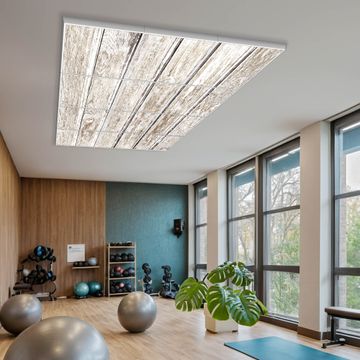 Entdecken Sie unsere vielseitigen Lichtdecken, hier in der Größe 186 x 248cm mit dem Motiv Motiv Weißes Holz - Ihre Beleuchtungslösung für jede Umgebung Beleuchten Sie Ihren Raum nicht nur, sondern schaffen Sie Atmosphäre! Die banjado Lichtdecke verwandelt jeden Ort, ob zu Hause, in Praxen, Büros oder Studios in eine Wohlfühloase. Unsere einzelnen Elemente haben eine genormte Einheitsgröße von 62 x 62cm und können somit in jede gängige Rasterdecken verbaut werden. So finden Sie Ihre passende Ausführung: Gern helfen wir Ihnen, die passende Ausführung zu wählen. Hierfür muss die aktuelle Gegebenheit Ihrer Decke oder Wand beachtet werden. Haben Sie bereits eine Rasterdecke (auch Odenwalddecke genannt)? Hier bestellen Sie lediglich das Motiv + Beleuchtungspanel, denn beides wird in die bereits vorhandene Decke eingelegt. Haben Sie eine glatte Decke mit Lichtauslass oder möchten die Lichtdecke an der Wand befestigen? Hier bestellen Sie bitte Motiv + Beleuchtungspanel + Deckenbefestigung, eine Aufbauanleitung liegt immer bei. Die Lichtdecke kann sowohl an der Decke als auch an der Wand montiert werden, perfekt für kreative Lichtakzente oder alternative Beleuchtungslösungen. Haben Sie bereits eine Lichtdecke und möchten nur das Motiv wechseln? Hier bestellen Sie bitte nur Motiv, der Wechsel ist denkbar einfach. Der Aufbau Ihrer banjado Lichtdecke gestaltet sich unkompliziert, dank einer verständlichen Anleitung, die Ihnen Schritt für Schritt durch den Montageprozess hilft. Für die endgültige Installation und den sicheren Anschluss empfehlen wir die Hinzuziehung eines Fachmanns, um die optimale Funktion und Sicherheit Ihrer Beleuchtung zu gewährleisten. Falls Sie einen Fachmann für die Installation benötigen, geben Sie uns gern Bescheid, wir vermitteln Ihnen gern einen geeigneten Ansprechpartner aus Ihrer Nähe. Steuerung: Steigern Sie Ihr Beleuchtungserlebnis mit der nahtlosen Integration in Ihr Smart Home. Durch die Kompatibilität mit der SmartLife App, Alexa und Google Assistant wird Ihr Smartphone zur zentralen Steuerungseinheit. Ihr Handy fungiert hierbei sozusagen als Fernbedienung. Legen Sie individuelle Lichtszenen in der App fest, die bei Aktivierung über den Wand-Ein-/Ausschalter immer wieder abgerufen werden können ohne Handy. Mit der Szenenfunktion in der Smart App können Sie die Beleuchtung personalisieren und steuern, sodass sie auf Ihre individuellen Bedürfnisse, Tagesrhythmus und Stimmung zugeschnitten ist. Beispielsweise können Sie sich in der Morgendämmerung durch ein sanftes Licht wecken lassen oder das Licht der Praxis werktags um 7 Uhr automatisch einschalten lassen. Dieses kann dann natürlich auch zu einer bestimmten Zeit automatisch ausgeschaltet werden. Motivwahl: Diese einzigartige Lichtdecke zeichnet sich durch ihre Fähigkeit aus, die Lichtfarbe je nach gewähltem Motiv anzupassen - ein Baum wirft ein sanftes grünes Licht, während eine Wolkendecke Ihren Raum in ein beruhigendes blaues Leuchten hüllt. Berücksichtigen Sie dies bitte bei Ihrer Motivauswahl. Sie können das Motiv jederzeit ohne großen Aufwand austauschen, ob nach Jahreszeit oder anderem Anlass, unsere Auswahl lässt kaum Wünsche offen. Wir fertigen Ihnen gern eine personalisierte Lichtdecke mit einem eigenen Motiv oder Logo oder Foto, schreiben Sie uns jederzeit an. Technische Daten: Das Motiv ist auf einer 4mm starken Acrylglas Scheibe aufgebracht, das Gesamtgewicht Ihrer Ausführung beträgt 59,1kg. Die Farbtemperatur lässt sich frei einstellen von 3000 bis 6000 Kelvin, damit können Sie stufenlos zwischen warmweiß, neutralweiß und kaltweiß wählen. Die Gesamtleistung bei Ihrer gewählten Ausführung beträgt 480W. Der Lichtstrom beträgt 3600 Lumen, die Nennspannung 230 V. Die Lichtdecke ist mit Schutzart IP20 für den Innenbereich konzipiert und sollte nicht im Nassbereich verwendet werden.