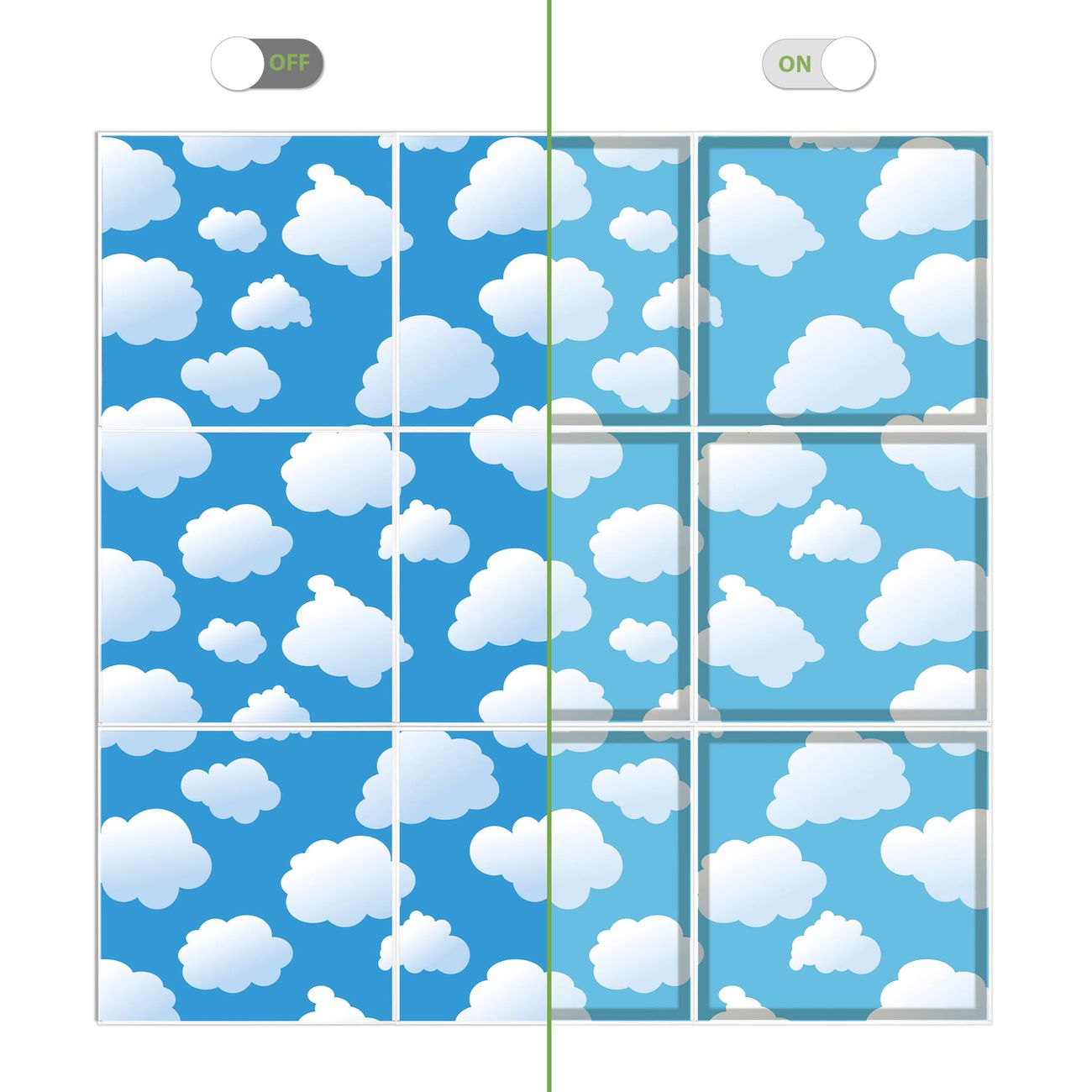 Entdecken Sie unsere vielseitigen Lichtdecken, hier in der Größe 186 x 186cm mit dem Motiv Motiv Wölkchen - Ihre Beleuchtungslösung für jede Umgebung Beleuchten Sie Ihren Raum nicht nur, sondern schaffen Sie Atmosphäre! Die banjado Lichtdecke verwandelt jeden Ort, ob zu Hause, in Praxen, Büros oder Studios in eine Wohlfühloase. Unsere einzelnen Elemente haben eine genormte Einheitsgröße von 62 x 62cm und können somit in jede gängige Rasterdecken verbaut werden. So finden Sie Ihre passende Ausführung: Gern helfen wir Ihnen, die passende Ausführung zu wählen. Hierfür muss die aktuelle Gegebenheit Ihrer Decke oder Wand beachtet werden. Haben Sie bereits eine Rasterdecke (auch Odenwalddecke genannt)? Hier bestellen Sie lediglich das Motiv + Beleuchtungspanel, denn beides wird in die bereits vorhandene Decke eingelegt. Haben Sie eine glatte Decke mit Lichtauslass oder möchten die Lichtdecke an der Wand befestigen? Hier bestellen Sie bitte Motiv + Beleuchtungspanel + Deckenbefestigung, eine Aufbauanleitung liegt immer bei. Die Lichtdecke kann sowohl an der Decke als auch an der Wand montiert werden, perfekt für kreative Lichtakzente oder alternative Beleuchtungslösungen. Haben Sie bereits eine Lichtdecke und möchten nur das Motiv wechseln? Hier bestellen Sie bitte nur Motiv, der Wechsel ist denkbar einfach. Der Aufbau Ihrer banjado Lichtdecke gestaltet sich unkompliziert, dank einer verständlichen Anleitung, die Ihnen Schritt für Schritt durch den Montageprozess hilft. Für die endgültige Installation und den sicheren Anschluss empfehlen wir die Hinzuziehung eines Fachmanns, um die optimale Funktion und Sicherheit Ihrer Beleuchtung zu gewährleisten. Falls Sie einen Fachmann für die Installation benötigen, geben Sie uns gern Bescheid, wir vermitteln Ihnen gern einen geeigneten Ansprechpartner aus Ihrer Nähe. Steuerung: Steigern Sie Ihr Beleuchtungserlebnis mit der nahtlosen Integration in Ihr Smart Home. Durch die Kompatibilität mit der SmartLife App, Alexa und Google Assistant wird Ihr Smartphone zur zentralen Steuerungseinheit. Ihr Handy fungiert hierbei sozusagen als Fernbedienung. Legen Sie individuelle Lichtszenen in der App fest, die bei Aktivierung über den Wand-Ein-/Ausschalter immer wieder abgerufen werden können ohne Handy. Mit der Szenenfunktion in der Smart App können Sie die Beleuchtung personalisieren und steuern, sodass sie auf Ihre individuellen Bedürfnisse, Tagesrhythmus und Stimmung zugeschnitten ist. Beispielsweise können Sie sich in der Morgendämmerung durch ein sanftes Licht wecken lassen oder das Licht der Praxis werktags um 7 Uhr automatisch einschalten lassen. Dieses kann dann natürlich auch zu einer bestimmten Zeit automatisch ausgeschaltet werden. Motivwahl: Diese einzigartige Lichtdecke zeichnet sich durch ihre Fähigkeit aus, die Lichtfarbe je nach gewähltem Motiv anzupassen - ein Baum wirft ein sanftes grünes Licht, während eine Wolkendecke Ihren Raum in ein beruhigendes blaues Leuchten hüllt. Berücksichtigen Sie dies bitte bei Ihrer Motivauswahl. Sie können das Motiv jederzeit ohne großen Aufwand austauschen, ob nach Jahreszeit oder anderem Anlass, unsere Auswahl lässt kaum Wünsche offen. Wir fertigen Ihnen gern eine personalisierte Lichtdecke mit einem eigenen Motiv oder Logo oder Foto, schreiben Sie uns jederzeit an. Technische Daten: Das Motiv ist auf einer 4mm starken Acrylglas Scheibe aufgebracht, das Gesamtgewicht Ihrer Ausführung beträgt 39,9kg. Die Farbtemperatur lässt sich frei einstellen von 3000 bis 6000 Kelvin, damit können Sie stufenlos zwischen warmweiß, neutralweiß und kaltweiß wählen. Die Gesamtleistung bei Ihrer gewählten Ausführung beträgt 360W. Der Lichtstrom beträgt 3600 Lumen, die Nennspannung 230 V. Die Lichtdecke ist mit Schutzart IP20 für den Innenbereich konzipiert und sollte nicht im Nassbereich verwendet werden.
