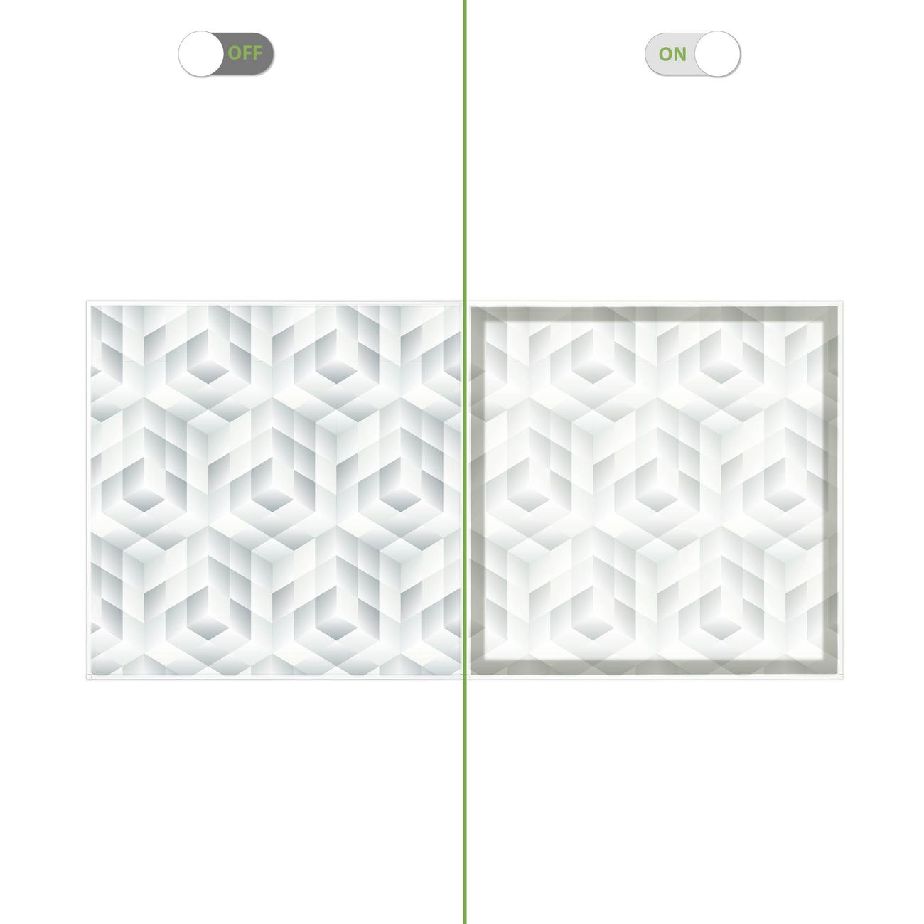 Entdecken Sie unsere vielseitigen Lichtdecken, hier in der Größe 124 x 62cm mit dem Motiv Motiv Würfel Grau - Ihre Beleuchtungslösung für jede Umgebung Beleuchten Sie Ihren Raum nicht nur, sondern schaffen Sie Atmosphäre! Die banjado Lichtdecke verwandelt jeden Ort, ob zu Hause, in Praxen, Büros oder Studios in eine Wohlfühloase. Unsere einzelnen Elemente haben eine genormte Einheitsgröße von 62 x 62cm und können somit in jede gängige Rasterdecken verbaut werden. So finden Sie Ihre passende Ausführung: Gern helfen wir Ihnen, die passende Ausführung zu wählen. Hierfür muss die aktuelle Gegebenheit Ihrer Decke oder Wand beachtet werden. Haben Sie bereits eine Rasterdecke (auch Odenwalddecke genannt)? Hier bestellen Sie lediglich das Motiv + Beleuchtungspanel, denn beides wird in die bereits vorhandene Decke eingelegt. Haben Sie eine glatte Decke mit Lichtauslass oder möchten die Lichtdecke an der Wand befestigen? Hier bestellen Sie bitte Motiv + Beleuchtungspanel + Deckenbefestigung, eine Aufbauanleitung liegt immer bei. Die Lichtdecke kann sowohl an der Decke als auch an der Wand montiert werden, perfekt für kreative Lichtakzente oder alternative Beleuchtungslösungen. Haben Sie bereits eine Lichtdecke und möchten nur das Motiv wechseln? Hier bestellen Sie bitte nur Motiv, der Wechsel ist denkbar einfach. Der Aufbau Ihrer banjado Lichtdecke gestaltet sich unkompliziert, dank einer verständlichen Anleitung, die Ihnen Schritt für Schritt durch den Montageprozess hilft. Für die endgültige Installation und den sicheren Anschluss empfehlen wir die Hinzuziehung eines Fachmanns, um die optimale Funktion und Sicherheit Ihrer Beleuchtung zu gewährleisten. Falls Sie einen Fachmann für die Installation benötigen, geben Sie uns gern Bescheid, wir vermitteln Ihnen gern einen geeigneten Ansprechpartner aus Ihrer Nähe. Steuerung: Steigern Sie Ihr Beleuchtungserlebnis mit der nahtlosen Integration in Ihr Smart Home. Durch die Kompatibilität mit der SmartLife App, Alexa und Google Assistant wird Ihr Smartphone zur zentralen Steuerungseinheit. Ihr Handy fungiert hierbei sozusagen als Fernbedienung. Legen Sie individuelle Lichtszenen in der App fest, die bei Aktivierung über den Wand-Ein-/Ausschalter immer wieder abgerufen werden können ohne Handy. Mit der Szenenfunktion in der Smart App können Sie die Beleuchtung personalisieren und steuern, sodass sie auf Ihre individuellen Bedürfnisse, Tagesrhythmus und Stimmung zugeschnitten ist. Beispielsweise können Sie sich in der Morgendämmerung durch ein sanftes Licht wecken lassen oder das Licht der Praxis werktags um 7 Uhr automatisch einschalten lassen. Dieses kann dann natürlich auch zu einer bestimmten Zeit automatisch ausgeschaltet werden. Motivwahl: Diese einzigartige Lichtdecke zeichnet sich durch ihre Fähigkeit aus, die Lichtfarbe je nach gewähltem Motiv anzupassen - ein Baum wirft ein sanftes grünes Licht, während eine Wolkendecke Ihren Raum in ein beruhigendes blaues Leuchten hüllt. Berücksichtigen Sie dies bitte bei Ihrer Motivauswahl. Sie können das Motiv jederzeit ohne großen Aufwand austauschen, ob nach Jahreszeit oder anderem Anlass, unsere Auswahl lässt kaum Wünsche offen. Wir fertigen Ihnen gern eine personalisierte Lichtdecke mit einem eigenen Motiv oder Logo oder Foto, schreiben Sie uns jederzeit an. Technische Daten: Das Motiv ist auf einer 4mm starken Acrylglas Scheibe aufgebracht, das Gesamtgewicht Ihrer Ausführung beträgt 4,5kg. Die Farbtemperatur lässt sich frei einstellen von 3000 bis 6000 Kelvin, damit können Sie stufenlos zwischen warmweiß, neutralweiß und kaltweiß wählen. Die Gesamtleistung bei Ihrer gewählten Ausführung beträgt 80W. Der Lichtstrom beträgt 3600 Lumen, die Nennspannung 230 V. Die Lichtdecke ist mit Schutzart IP20 für den Innenbereich konzipiert und sollte nicht im Nassbereich verwendet werden.