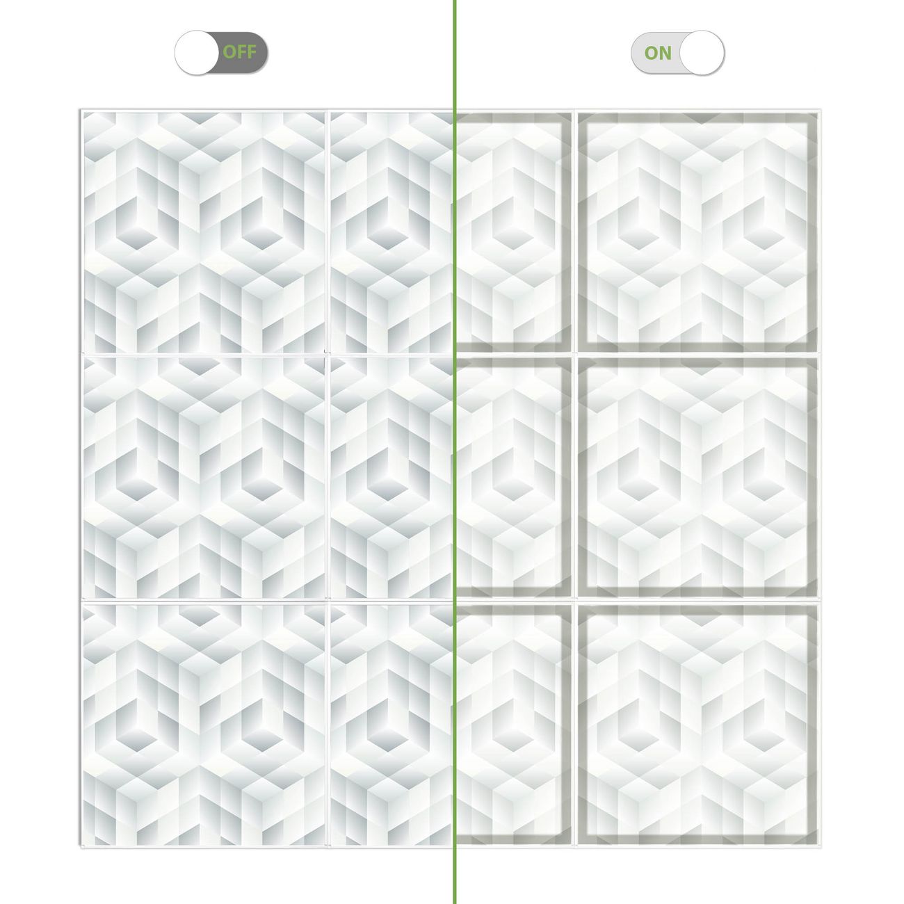 Motiv Würfel Grau Nr. 11634 Größe: 187,5x187,5x4,5cm BxHxT Gewicht: ca. 43,65 kg Material: Acylglas, Metall, hochwertig bedruckte Premiumfolie Druck: farbbrilliant, hochauflösend Stärke Glas: 4mm Acylglas Einzelelement: 62,5x62,5cm groß (mit Rahmen) Dimmbar: JA LED Paneel: 40W, 230V, 3600lm, 4000K neutralweiß Steuerung: SmartApp / Alexa / Google Assistent oder ähnliche