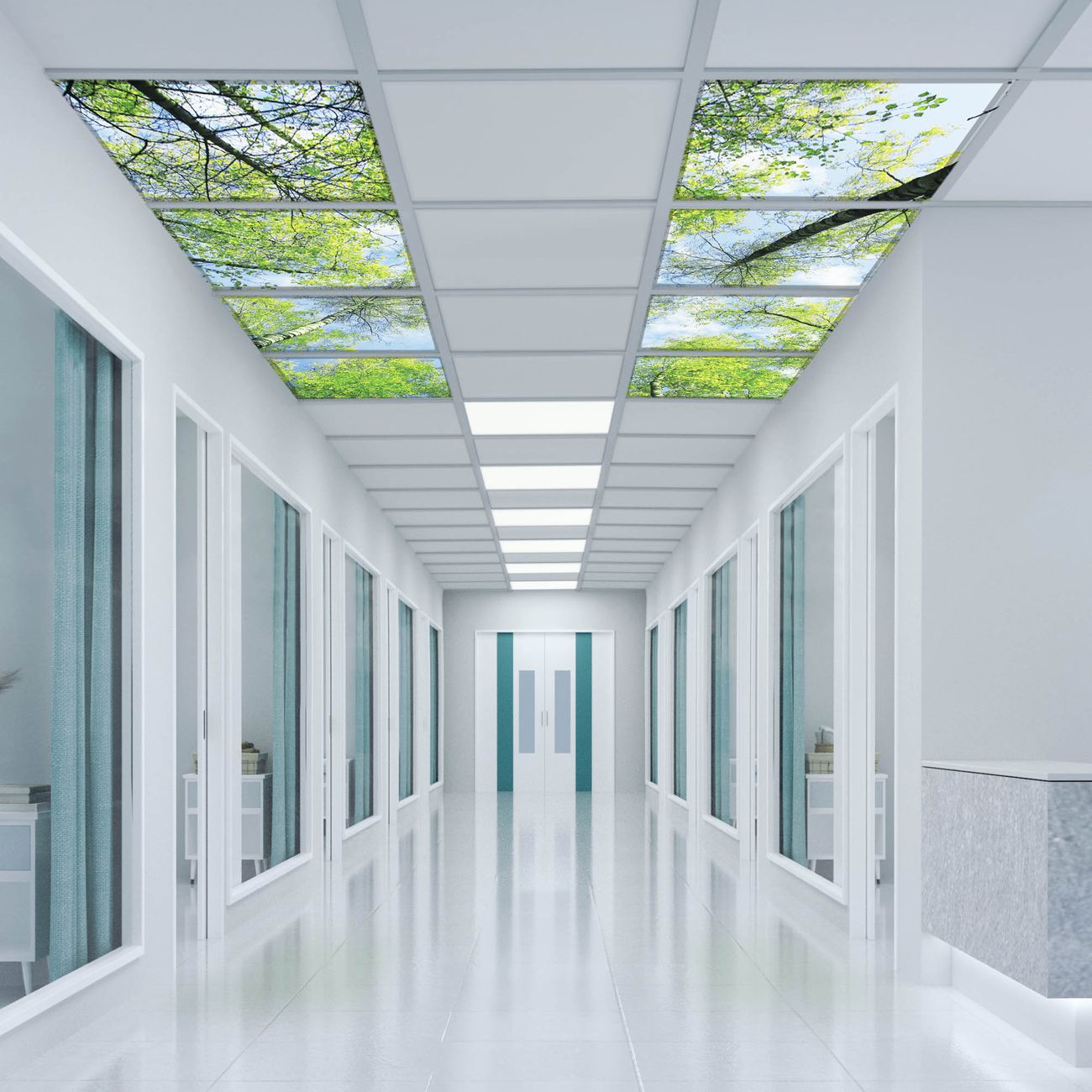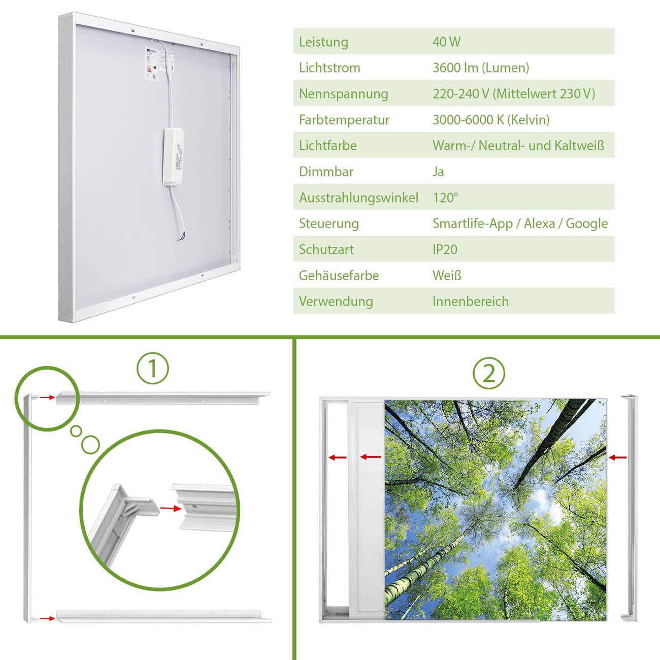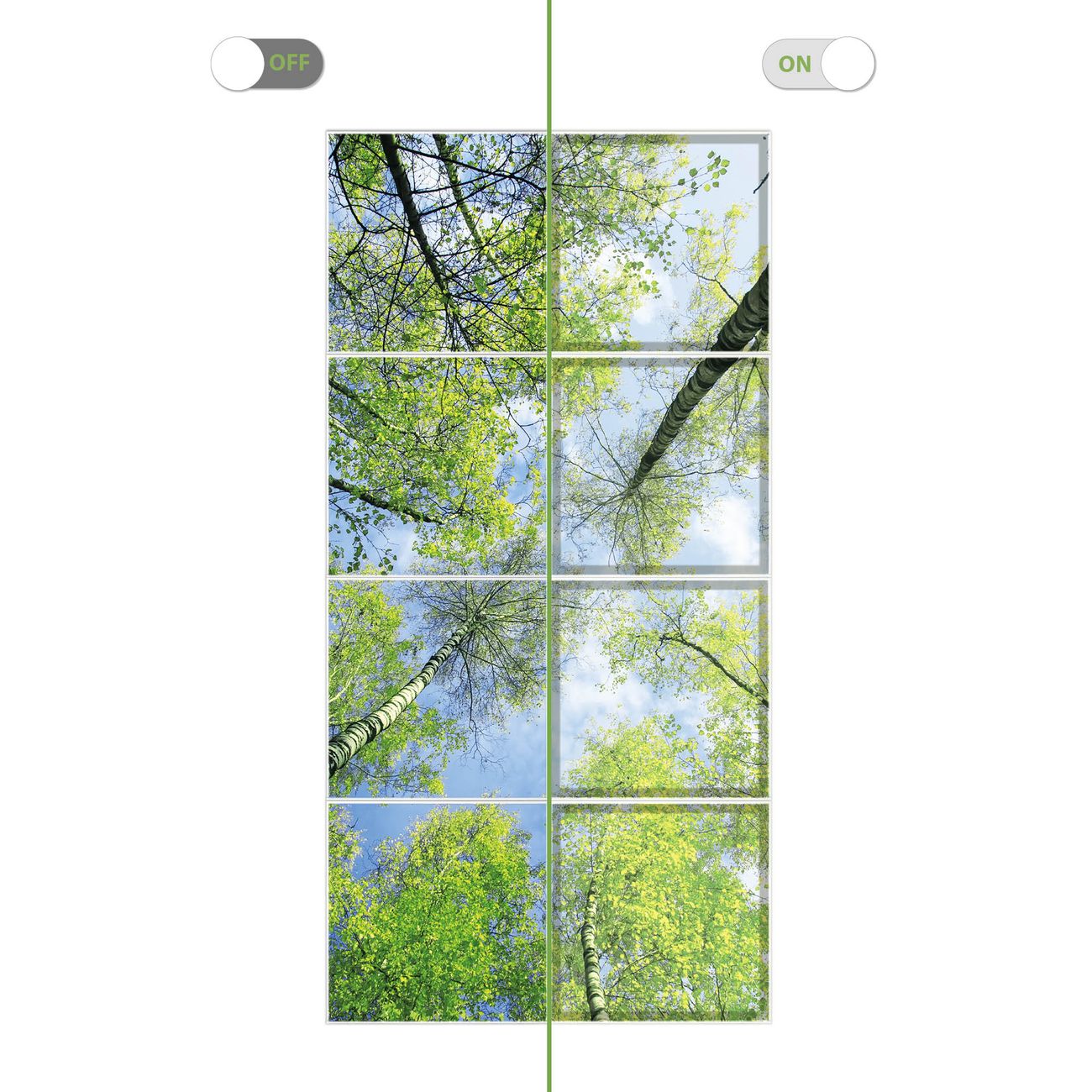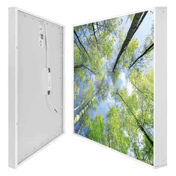 Entdecken Sie unsere vielseitigen Lichtdecken, hier in der Größe 124 x 248cm mit dem Motiv Motiv Zwischen Bäumen 3 - Ihre Beleuchtungslösung für jede Umgebung Beleuchten Sie Ihren Raum nicht nur, sondern schaffen Sie Atmosphäre! Die banjado Lichtdecke verwandelt jeden Ort, ob zu Hause, in Praxen, Büros oder Studios in eine Wohlfühloase. Unsere einzelnen Elemente haben eine genormte Einheitsgröße von 62 x 62cm und können somit in jede gängige Rasterdecken verbaut werden. So finden Sie Ihre passende Ausführung: Gern helfen wir Ihnen, die passende Ausführung zu wählen. Hierfür muss die aktuelle Gegebenheit Ihrer Decke oder Wand beachtet werden. Haben Sie bereits eine Rasterdecke (auch Odenwalddecke genannt)? Hier bestellen Sie lediglich das Motiv + Beleuchtungspanel, denn beides wird in die bereits vorhandene Decke eingelegt. Haben Sie eine glatte Decke mit Lichtauslass oder möchten die Lichtdecke an der Wand befestigen? Hier bestellen Sie bitte Motiv + Beleuchtungspanel + Deckenbefestigung, eine Aufbauanleitung liegt immer bei. Die Lichtdecke kann sowohl an der Decke als auch an der Wand montiert werden, perfekt für kreative Lichtakzente oder alternative Beleuchtungslösungen. Haben Sie bereits eine Lichtdecke und möchten nur das Motiv wechseln? Hier bestellen Sie bitte nur Motiv, der Wechsel ist denkbar einfach. Der Aufbau Ihrer banjado Lichtdecke gestaltet sich unkompliziert, dank einer verständlichen Anleitung, die Ihnen Schritt für Schritt durch den Montageprozess hilft. Für die endgültige Installation und den sicheren Anschluss empfehlen wir die Hinzuziehung eines Fachmanns, um die optimale Funktion und Sicherheit Ihrer Beleuchtung zu gewährleisten. Falls Sie einen Fachmann für die Installation benötigen, geben Sie uns gern Bescheid, wir vermitteln Ihnen gern einen geeigneten Ansprechpartner aus Ihrer Nähe. Steuerung: Steigern Sie Ihr Beleuchtungserlebnis mit der nahtlosen Integration in Ihr Smart Home. Durch die Kompatibilität mit der SmartLife App, Alexa und Google Assistant wird Ihr Smartphone zur zentralen Steuerungseinheit. Ihr Handy fungiert hierbei sozusagen als Fernbedienung. Legen Sie individuelle Lichtszenen in der App fest, die bei Aktivierung über den Wand-Ein-/Ausschalter immer wieder abgerufen werden können ohne Handy. Mit der Szenenfunktion in der Smart App können Sie die Beleuchtung personalisieren und steuern, sodass sie auf Ihre individuellen Bedürfnisse, Tagesrhythmus und Stimmung zugeschnitten ist. Beispielsweise können Sie sich in der Morgendämmerung durch ein sanftes Licht wecken lassen oder das Licht der Praxis werktags um 7 Uhr automatisch einschalten lassen. Dieses kann dann natürlich auch zu einer bestimmten Zeit automatisch ausgeschaltet werden. Motivwahl: Diese einzigartige Lichtdecke zeichnet sich durch ihre Fähigkeit aus, die Lichtfarbe je nach gewähltem Motiv anzupassen - ein Baum wirft ein sanftes grünes Licht, während eine Wolkendecke Ihren Raum in ein beruhigendes blaues Leuchten hüllt. Berücksichtigen Sie dies bitte bei Ihrer Motivauswahl. Sie können das Motiv jederzeit ohne großen Aufwand austauschen, ob nach Jahreszeit oder anderem Anlass, unsere Auswahl lässt kaum Wünsche offen. Wir fertigen Ihnen gern eine personalisierte Lichtdecke mit einem eigenen Motiv oder Logo oder Foto, schreiben Sie uns jederzeit an. Technische Daten: Das Motiv ist auf einer 4mm starken Acrylglas Scheibe aufgebracht, das Gesamtgewicht Ihrer Ausführung beträgt 35,4kg. Die Farbtemperatur lässt sich frei einstellen von 3000 bis 6000 Kelvin, damit können Sie stufenlos zwischen warmweiß, neutralweiß und kaltweiß wählen. Die Gesamtleistung bei Ihrer gewählten Ausführung beträgt 320W. Der Lichtstrom beträgt 3600 Lumen, die Nennspannung 230 V. Die Lichtdecke ist mit Schutzart IP20 für den Innenbereich konzipiert und sollte nicht im Nassbereich verwendet werden.