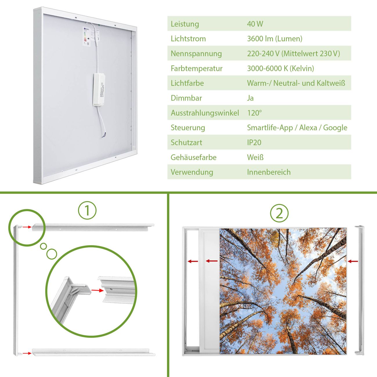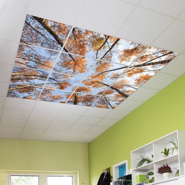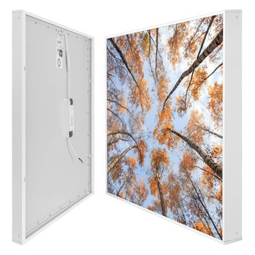 Entdecken Sie unsere vielseitigen Lichtdecken, hier in der Größe 248 x 248cm mit dem Motiv Motiv Zwischen Bäumen 4 - Ihre Beleuchtungslösung für jede Umgebung Beleuchten Sie Ihren Raum nicht nur, sondern schaffen Sie Atmosphäre! Die banjado Lichtdecke verwandelt jeden Ort, ob zu Hause, in Praxen, Büros oder Studios in eine Wohlfühloase. Unsere einzelnen Elemente haben eine genormte Einheitsgröße von 62 x 62cm und können somit in jede gängige Rasterdecken verbaut werden. So finden Sie Ihre passende Ausführung: Gern helfen wir Ihnen, die passende Ausführung zu wählen. Hierfür muss die aktuelle Gegebenheit Ihrer Decke oder Wand beachtet werden. Haben Sie bereits eine Rasterdecke (auch Odenwalddecke genannt)? Hier bestellen Sie lediglich das Motiv + Beleuchtungspanel, denn beides wird in die bereits vorhandene Decke eingelegt. Haben Sie eine glatte Decke mit Lichtauslass oder möchten die Lichtdecke an der Wand befestigen? Hier bestellen Sie bitte Motiv + Beleuchtungspanel + Deckenbefestigung, eine Aufbauanleitung liegt immer bei. Die Lichtdecke kann sowohl an der Decke als auch an der Wand montiert werden, perfekt für kreative Lichtakzente oder alternative Beleuchtungslösungen. Haben Sie bereits eine Lichtdecke und möchten nur das Motiv wechseln? Hier bestellen Sie bitte nur Motiv, der Wechsel ist denkbar einfach. Der Aufbau Ihrer banjado Lichtdecke gestaltet sich unkompliziert, dank einer verständlichen Anleitung, die Ihnen Schritt für Schritt durch den Montageprozess hilft. Für die endgültige Installation und den sicheren Anschluss empfehlen wir die Hinzuziehung eines Fachmanns, um die optimale Funktion und Sicherheit Ihrer Beleuchtung zu gewährleisten. Falls Sie einen Fachmann für die Installation benötigen, geben Sie uns gern Bescheid, wir vermitteln Ihnen gern einen geeigneten Ansprechpartner aus Ihrer Nähe. Steuerung: Steigern Sie Ihr Beleuchtungserlebnis mit der nahtlosen Integration in Ihr Smart Home. Durch die Kompatibilität mit der SmartLife App, Alexa und Google Assistant wird Ihr Smartphone zur zentralen Steuerungseinheit. Ihr Handy fungiert hierbei sozusagen als Fernbedienung. Legen Sie individuelle Lichtszenen in der App fest, die bei Aktivierung über den Wand-Ein-/Ausschalter immer wieder abgerufen werden können ohne Handy. Mit der Szenenfunktion in der Smart App können Sie die Beleuchtung personalisieren und steuern, sodass sie auf Ihre individuellen Bedürfnisse, Tagesrhythmus und Stimmung zugeschnitten ist. Beispielsweise können Sie sich in der Morgendämmerung durch ein sanftes Licht wecken lassen oder das Licht der Praxis werktags um 7 Uhr automatisch einschalten lassen. Dieses kann dann natürlich auch zu einer bestimmten Zeit automatisch ausgeschaltet werden. Motivwahl: Diese einzigartige Lichtdecke zeichnet sich durch ihre Fähigkeit aus, die Lichtfarbe je nach gewähltem Motiv anzupassen - ein Baum wirft ein sanftes grünes Licht, während eine Wolkendecke Ihren Raum in ein beruhigendes blaues Leuchten hüllt. Berücksichtigen Sie dies bitte bei Ihrer Motivauswahl. Sie können das Motiv jederzeit ohne großen Aufwand austauschen, ob nach Jahreszeit oder anderem Anlass, unsere Auswahl lässt kaum Wünsche offen. Wir fertigen Ihnen gern eine personalisierte Lichtdecke mit einem eigenen Motiv oder Logo oder Foto, schreiben Sie uns jederzeit an. Technische Daten: Das Motiv ist auf einer 4mm starken Acrylglas Scheibe aufgebracht, das Gesamtgewicht Ihrer Ausführung beträgt 70,9kg. Die Farbtemperatur lässt sich frei einstellen von 3000 bis 6000 Kelvin, damit können Sie stufenlos zwischen warmweiß, neutralweiß und kaltweiß wählen. Die Gesamtleistung bei Ihrer gewählten Ausführung beträgt 640W. Der Lichtstrom beträgt 3600 Lumen, die Nennspannung 230 V. Die Lichtdecke ist mit Schutzart IP20 für den Innenbereich konzipiert und sollte nicht im Nassbereich verwendet werden.