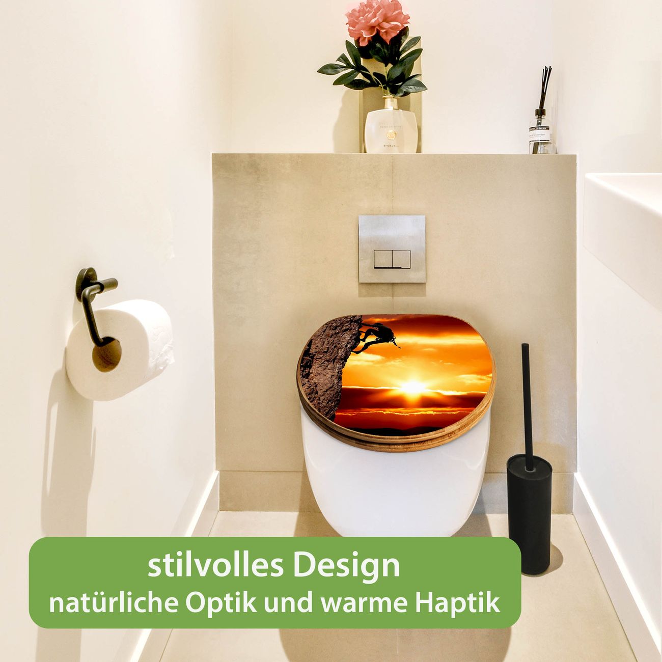 Mit dem banjado Toilettensitz in Bambus verbinden Sie Design und Funktionalität. Sie erhalten den WC-Sitz mit bewährt schwerer Holz Qualität und Universal Scharnieren. Das Motiv Motiv Bergsteiger besteht aus einer schutzlaminierten Motivfolie, die durch das Schutzlaminat zusätzlich vor Kratzern schützt. Durch diesen Motivdruck wird der WC-Sitz zu einem Blickfang in Ihrem Bad.