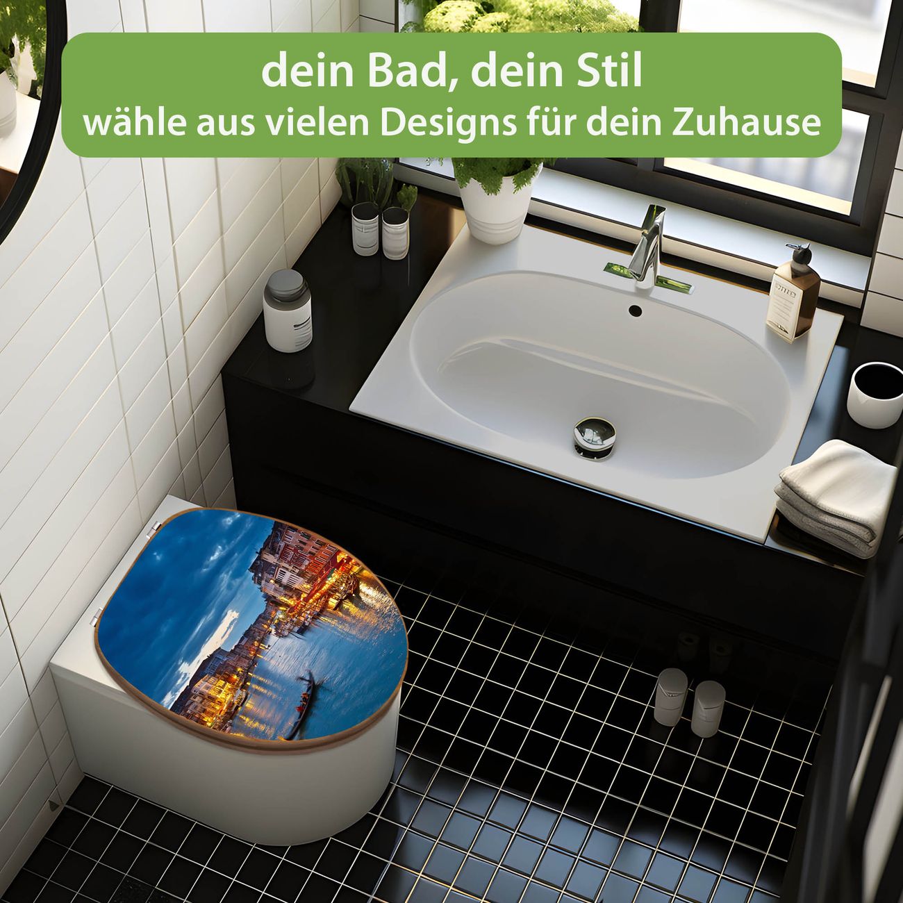 Mit dem banjado Toilettensitz in Bambus verbinden Sie Design und Funktionalität. Sie erhalten den WC-Sitz mit bewährt schwerer Holz Qualität und Universal Scharnieren. Das Motiv Motiv Canale Grande Bei Nacht besteht aus einer schutzlaminierten Motivfolie, die durch das Schutzlaminat zusätzlich vor Kratzern schützt. Durch diesen Motivdruck wird der WC-Sitz zu einem Blickfang in Ihrem Bad.
