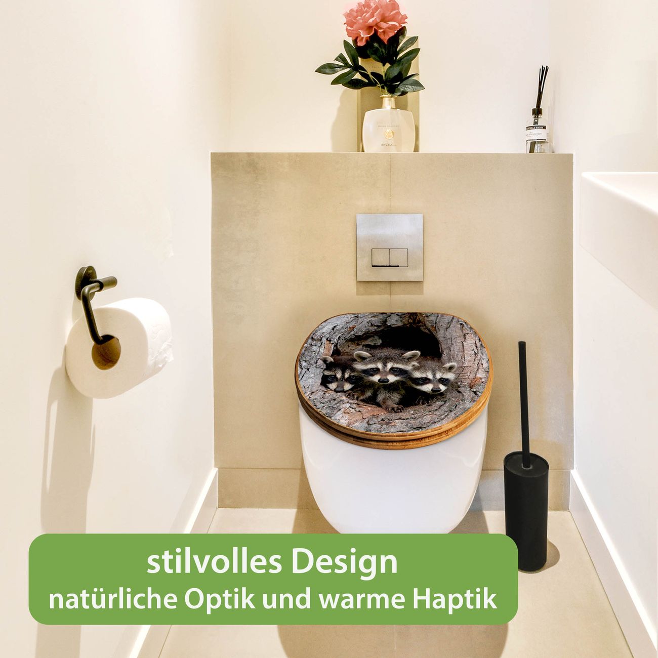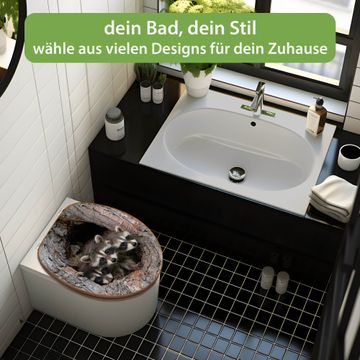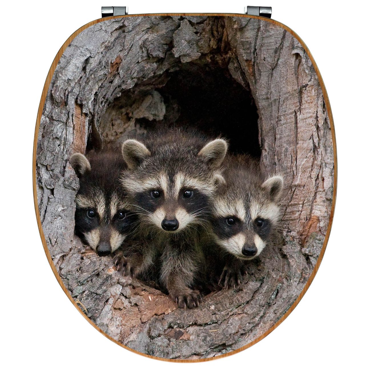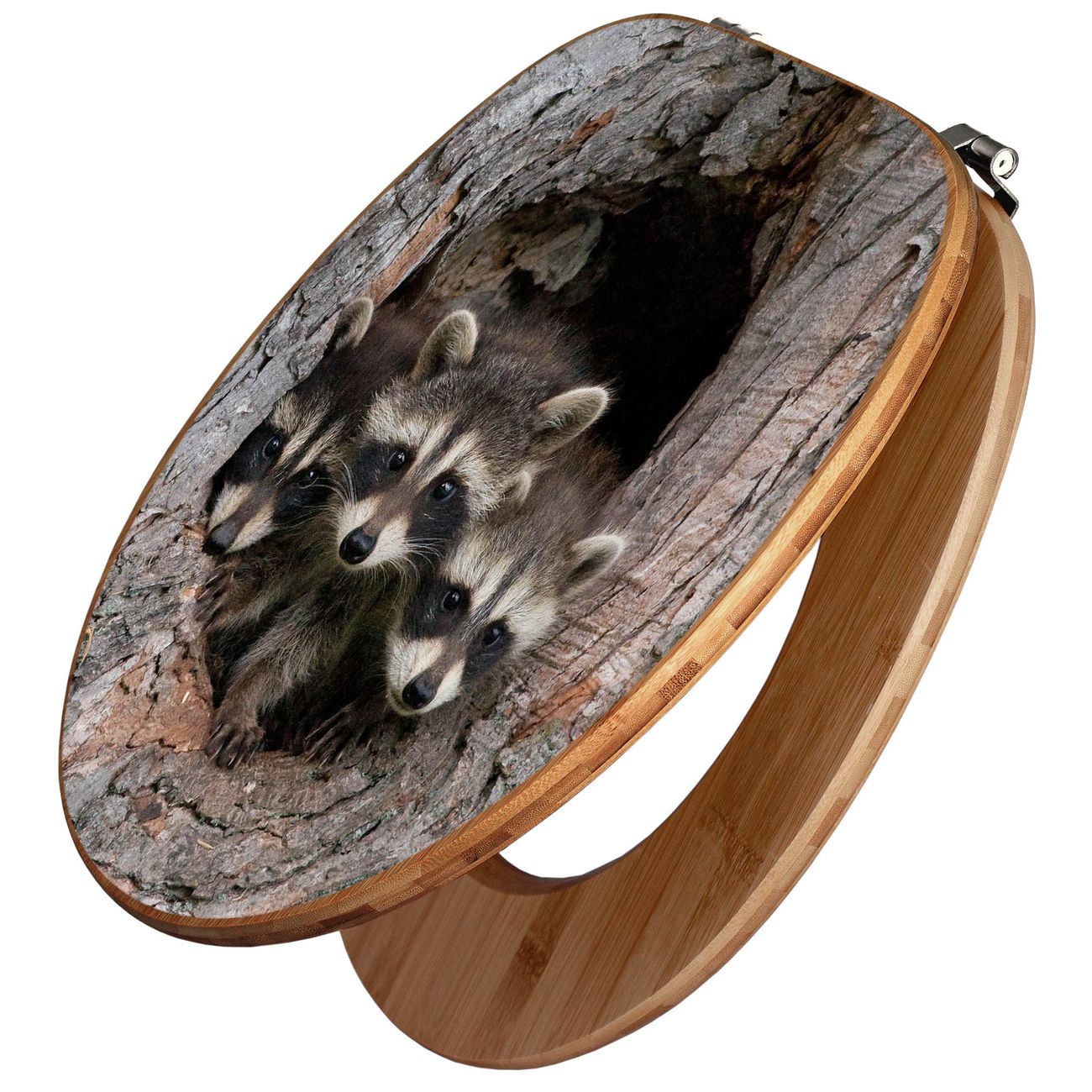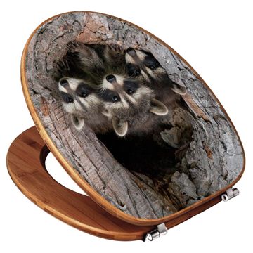 Design WC-Sitz Bambus Holz Motiv Drei Waschbären