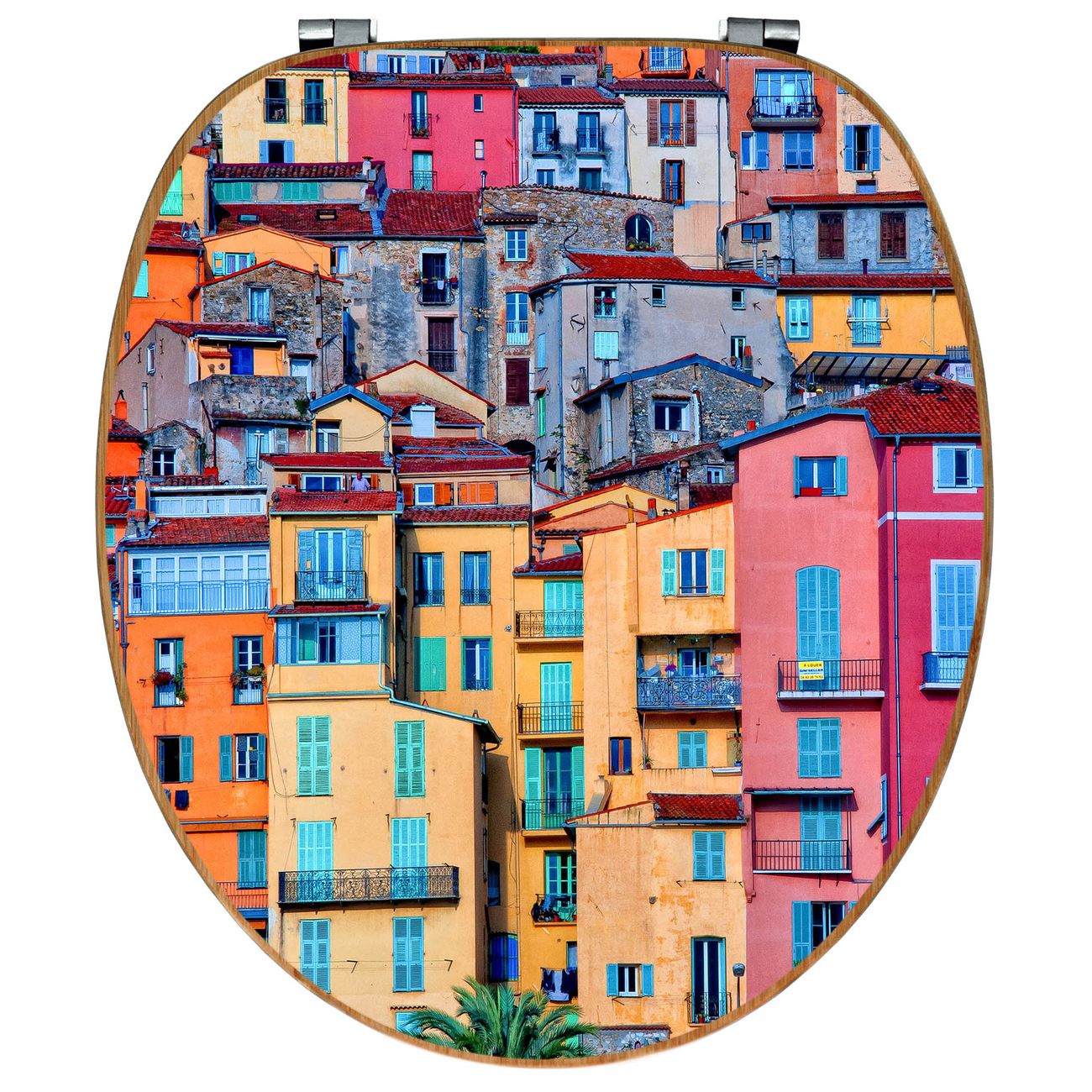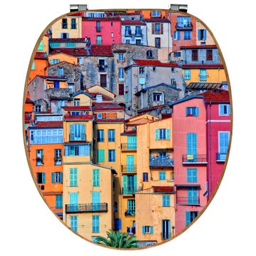 Mit dem banjado Toilettensitz in Bambus verbinden Sie Design und Funktionalität. Sie erhalten den WC-Sitz mit bewährt schwerer Holz Qualität und Universal Scharnieren. Das Motiv Motiv Häuserberg besteht aus einer schutzlaminierten Motivfolie, die durch das Schutzlaminat zusätzlich vor Kratzern schützt. Durch diesen Motivdruck wird der WC-Sitz zu einem Blickfang in Ihrem Bad.