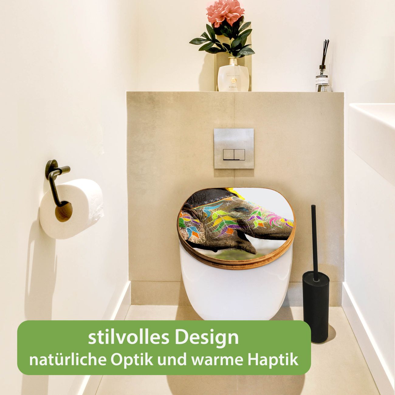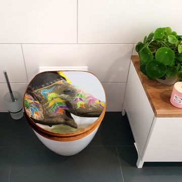 Mit dem banjado Toilettensitz in Bambus verbinden Sie Design und Funktionalität. Sie erhalten den WC-Sitz mit bewährt schwerer Holz Qualität und Universal Scharnieren. Das Motiv Motiv Indischer Elephant besteht aus einer schutzlaminierten Motivfolie, die durch das Schutzlaminat zusätzlich vor Kratzern schützt. Durch diesen Motivdruck wird der WC-Sitz zu einem Blickfang in Ihrem Bad.