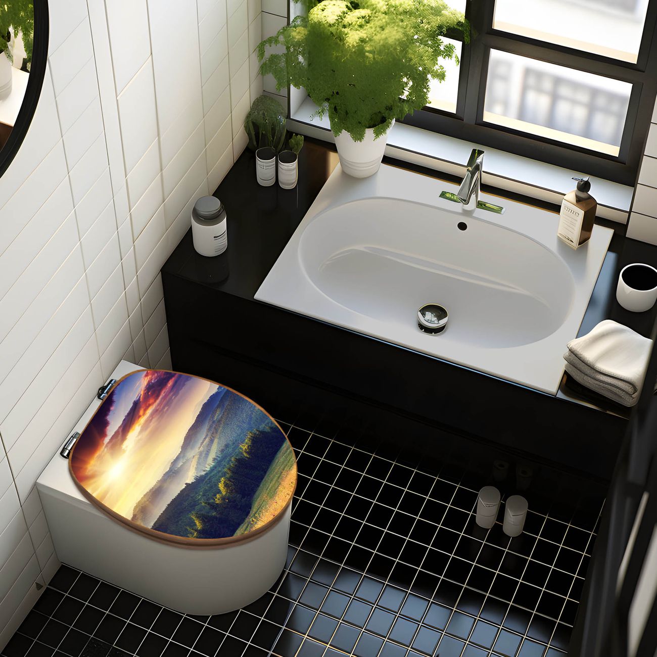 Mit dem banjado Toilettensitz in Bambus verbinden Sie Design und Funktionalität. Sie erhalten den WC-Sitz mit bewährt schwerer Holz Qualität und Universal Scharnieren. Das Motiv Motiv Karpaten Sonnenuntergang besteht aus einer schutzlaminierten Motivfolie, die durch das Schutzlaminat zusätzlich vor Kratzern schützt. Durch diesen Motivdruck wird der WC-Sitz zu einem Blickfang in Ihrem Bad.