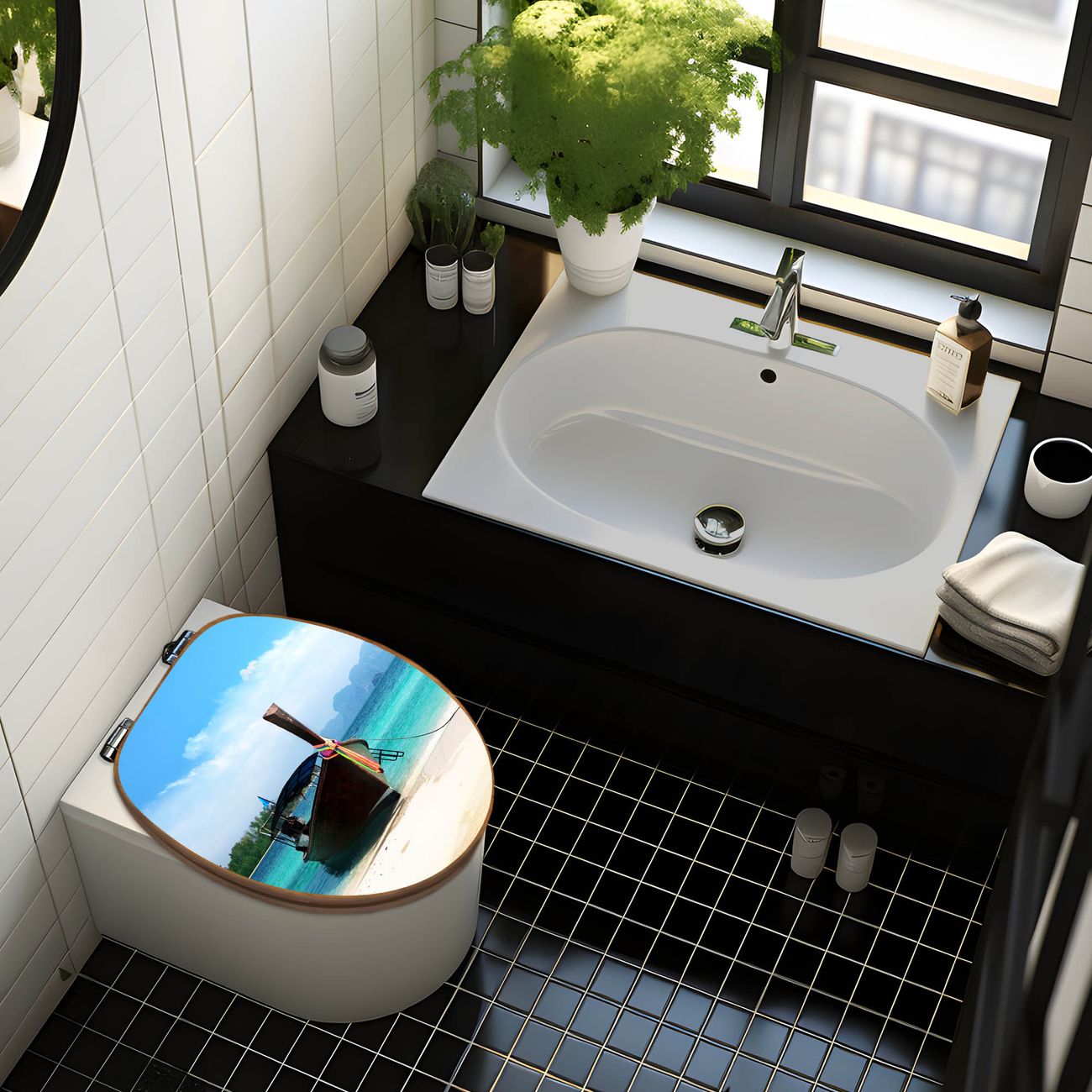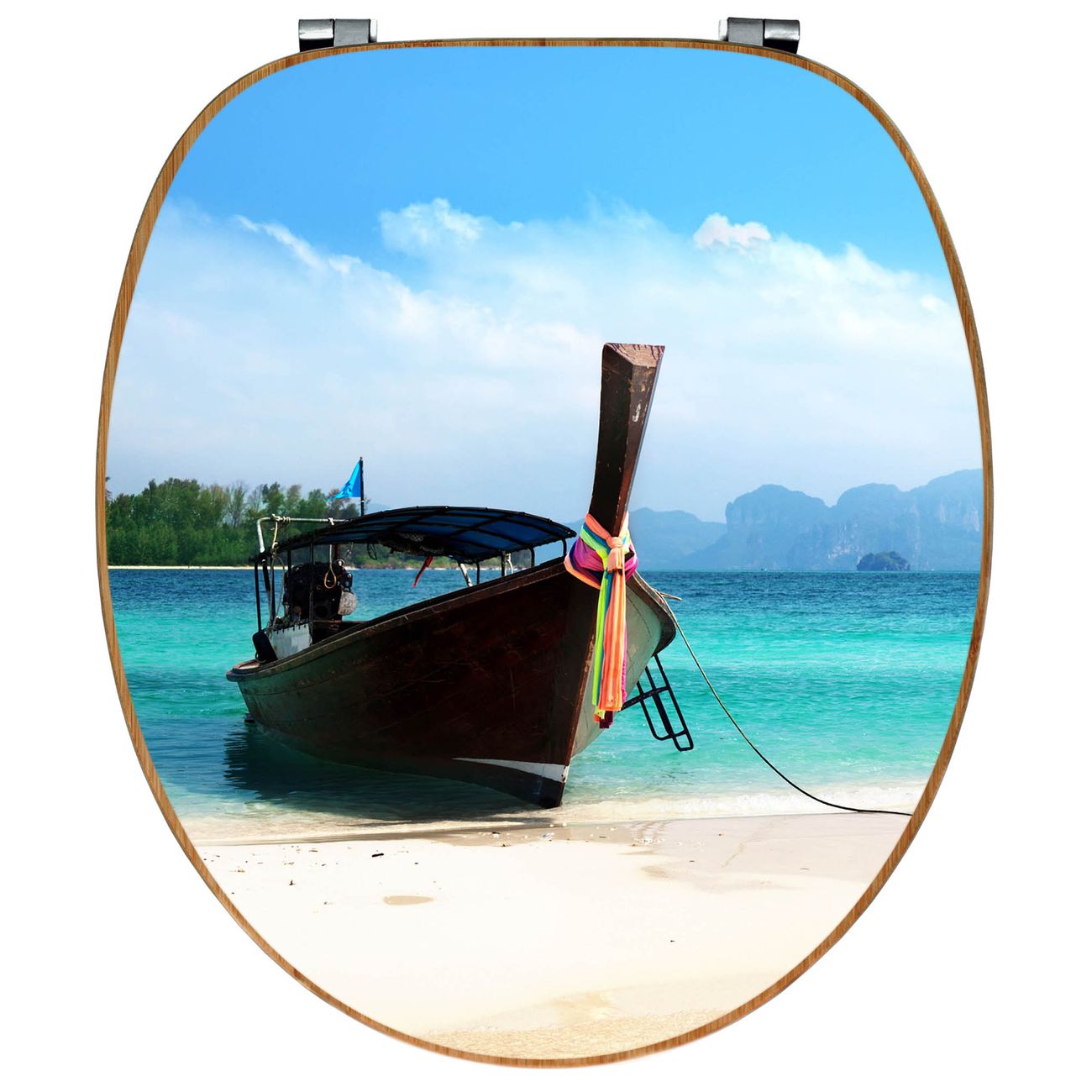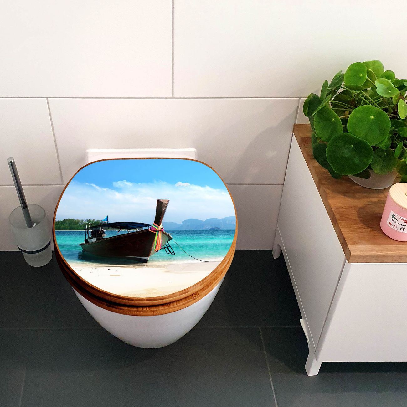 Mit dem banjado Toilettensitz in Bambus verbinden Sie Design und Funktionalität. Sie erhalten den WC-Sitz mit bewährt schwerer Holz Qualität und Universal Scharnieren. Das Motiv Motiv Koh Poda besteht aus einer schutzlaminierten Motivfolie, die durch das Schutzlaminat zusätzlich vor Kratzern schützt. Durch diesen Motivdruck wird der WC-Sitz zu einem Blickfang in Ihrem Bad.