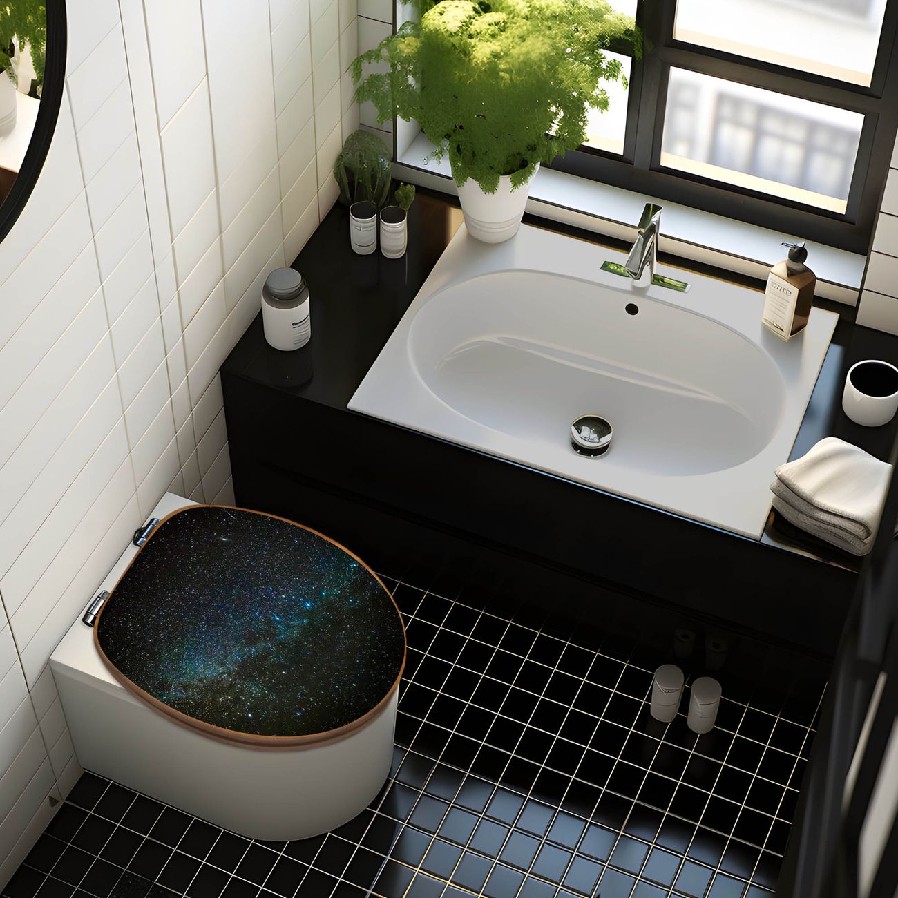 Mit dem banjado Toilettensitz in Bambus verbinden Sie Design und Funktionalität. Sie erhalten den WC-Sitz mit bewährt schwerer Holz Qualität und Universal Scharnieren. Das Motiv Motiv Nachthimmel besteht aus einer schutzlaminierten Motivfolie, die durch das Schutzlaminat zusätzlich vor Kratzern schützt. Durch diesen Motivdruck wird der WC-Sitz zu einem Blickfang in Ihrem Bad.