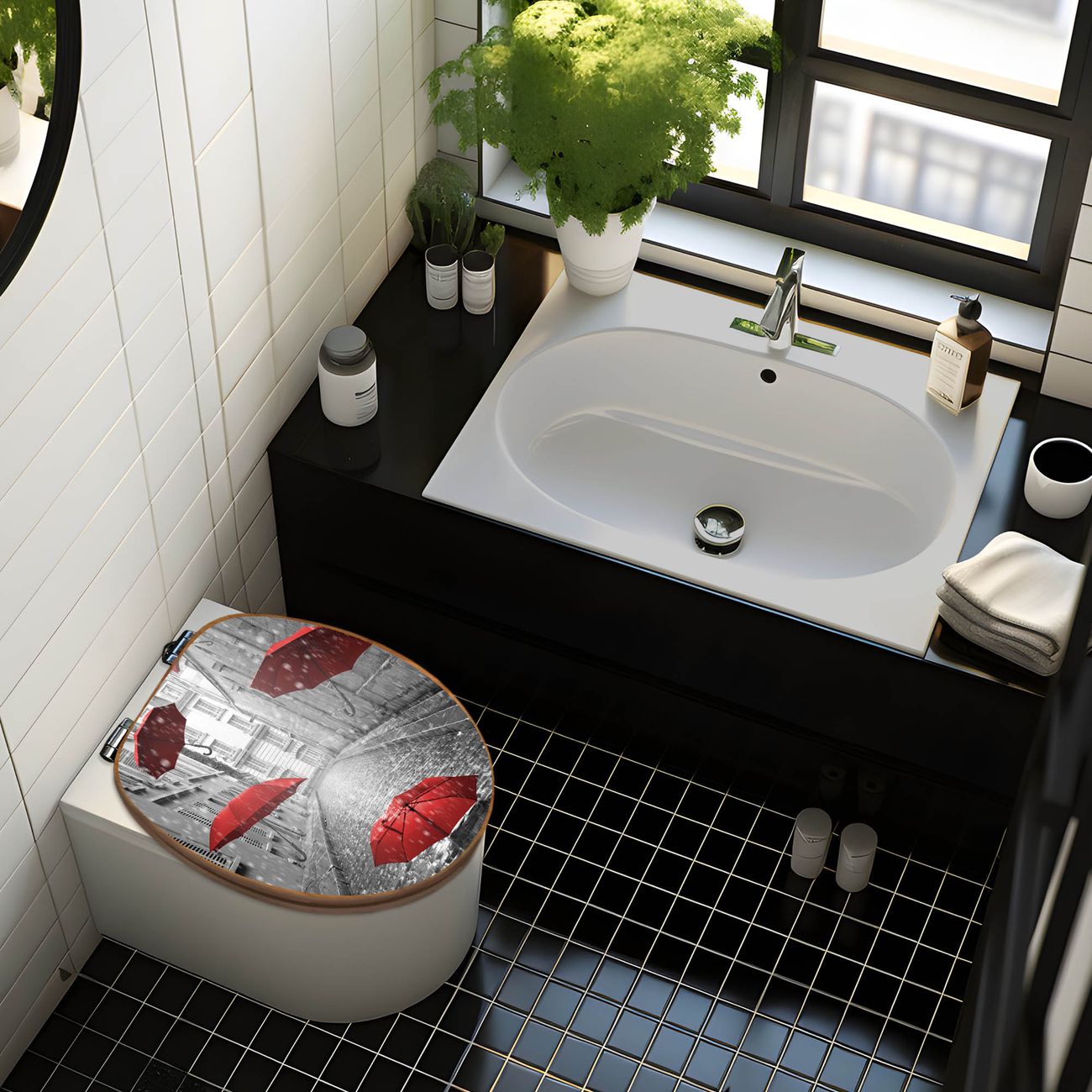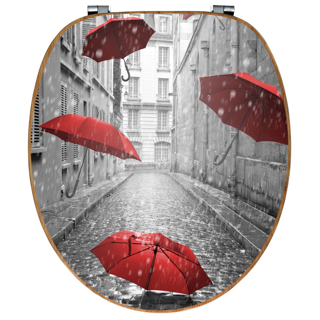Mit dem banjado Toilettensitz in Bambus verbinden Sie Design und Funktionalität. Sie erhalten den WC-Sitz mit bewährt schwerer Holz Qualität und Universal Scharnieren. Das Motiv Motiv Rote Schirme besteht aus einer schutzlaminierten Motivfolie, die durch das Schutzlaminat zusätzlich vor Kratzern schützt. Durch diesen Motivdruck wird der WC-Sitz zu einem Blickfang in Ihrem Bad.