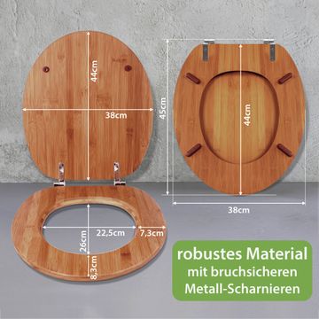 Der Klodeckel besteht aus robustem Bambus, die Scharniere sind aus bruchsicherem Metall - Materialien die Ihnen eine leichte und hygienische Reinigung ermöglichen. Die Gesamtgröße beträgt 44cm x 38cm x 5cm. Der WC-Sitz besitzt keine Absenkautomatik. Der WC Sitz ist universal geeignet für alle gängigen Toilettenschüsseln. Mit Hilfe der detaillierten Aufbauanleitung ermöglichen wir eine schnelle und unkomplizierte Montage. Für ein hygienisches und leichtes Reinigen können Sie den Toilettendeckel genauso einfach wieder abnehmen. Bitte beachten Sie, das es sich dabei um ein Naturprodukt handelt und dadurch Abweichungen zu unseren Produktbildern auftreten können.
