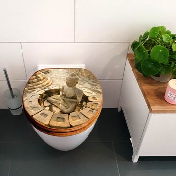 Mit dem banjado Toilettensitz in Bambus verbinden Sie Design und Funktionalität. Sie erhalten den WC-Sitz mit bewährt schwerer Holz Qualität und Universal Scharnieren. Das Motiv Motiv Sitzender Buddha besteht aus einer schutzlaminierten Motivfolie, die durch das Schutzlaminat zusätzlich vor Kratzern schützt. Durch diesen Motivdruck wird der WC-Sitz zu einem Blickfang in Ihrem Bad.
