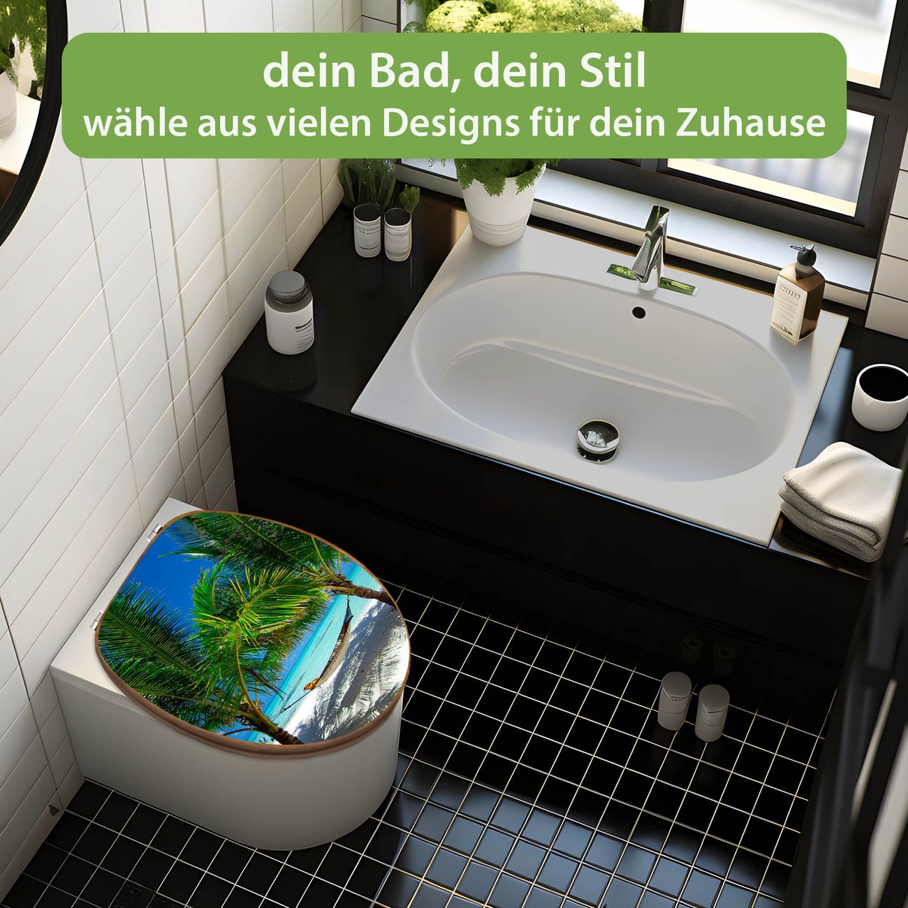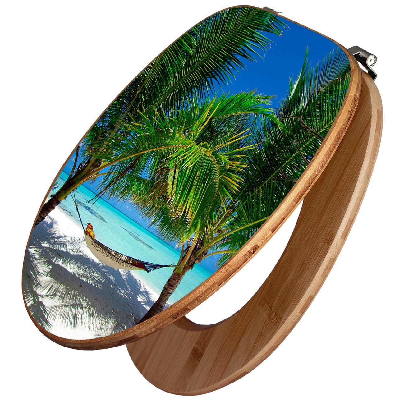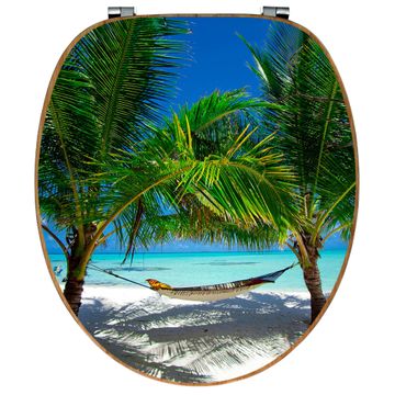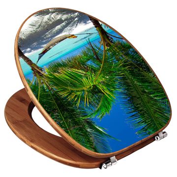 Mit dem banjado Toilettensitz in Bambus verbinden Sie Design und Funktionalität. Sie erhalten den WC-Sitz mit bewährt schwerer Holz Qualität und Universal Scharnieren. Das Motiv Motiv Strand besteht aus einer schutzlaminierten Motivfolie, die durch das Schutzlaminat zusätzlich vor Kratzern schützt. Durch diesen Motivdruck wird der WC-Sitz zu einem Blickfang in Ihrem Bad.