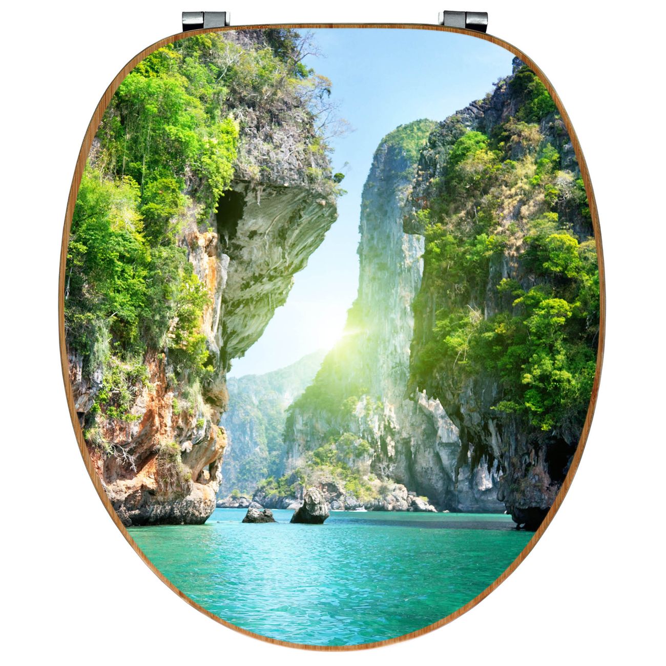 Mit dem banjado Toilettensitz in Bambus verbinden Sie Design und Funktionalität. Sie erhalten den WC-Sitz mit bewährt schwerer Holz Qualität und Universal Scharnieren. Das Motiv Motiv Versteckte Bucht besteht aus einer schutzlaminierten Motivfolie, die durch das Schutzlaminat zusätzlich vor Kratzern schützt. Durch diesen Motivdruck wird der WC-Sitz zu einem Blickfang in Ihrem Bad.