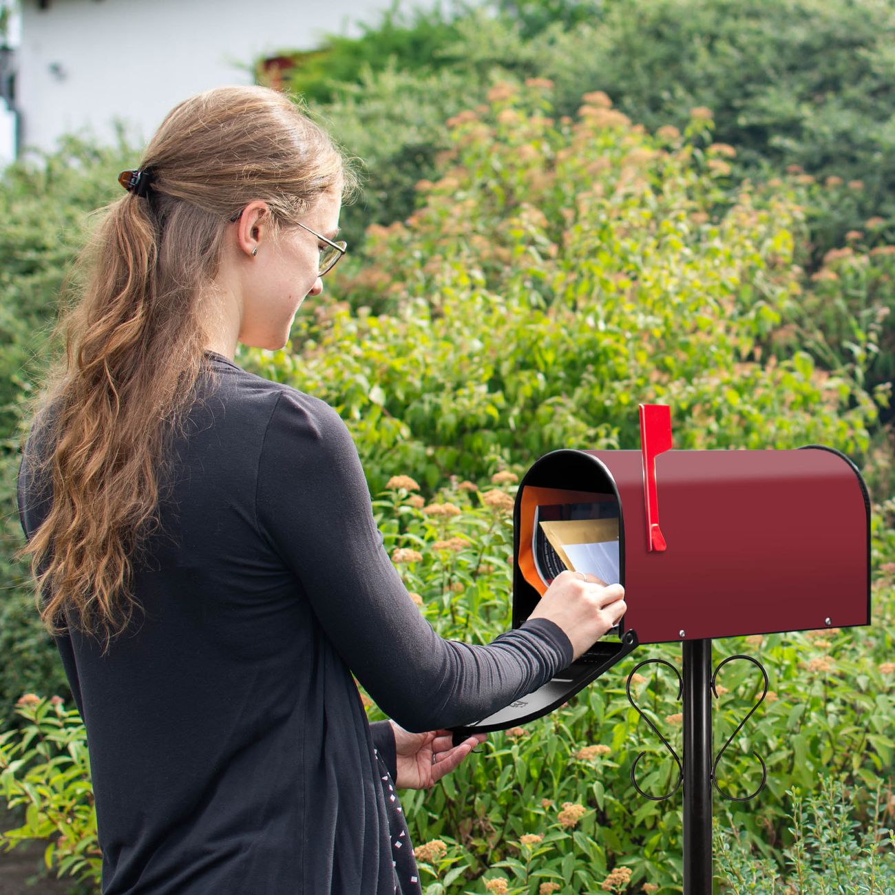 Der amerikanische Briefkasten von banjado mit Burgund Farbe bietet Ihnen ausreichend Fassungsvermögen, um große A4 Sendungen und Zeitschriften zu empfangen. Die typisch amerikanische rote Fahne zeigt Ihnen an, wenn Sie Post erhalten haben. Die US-Mailbox besteht aus verzinktem Stahlblech welches lackiert wurde und ist 48 x 22 x 16 CM (BxHxT) groß. Die Folie mit Farbe Burgund besteht aus einer wetter- und UV-resistenten Folie, die mit einem Schutzlaminat überzogen ist, sodass die US Mailbox zusätzlich vor Kratzern geschützt ist. An der Unterkante sind 4 Löcher je Seite um die Mailbox, typisch amerikanisch, an einem Holzpfahl oder einem Zaun zu befestigen. Auf Wunsch können Sie bei uns den passenden Standfuß oder die passende Wandhalterung kaufen um die US-Mailbox sicher zu befestigen. Wir bieten Ihnen ebenfalls Namensschilder, bereits beschriftet oder frei zu beschriften, und verschiedene selbst gestaltete Bitte-Keine-Werbung-Aufkleber.