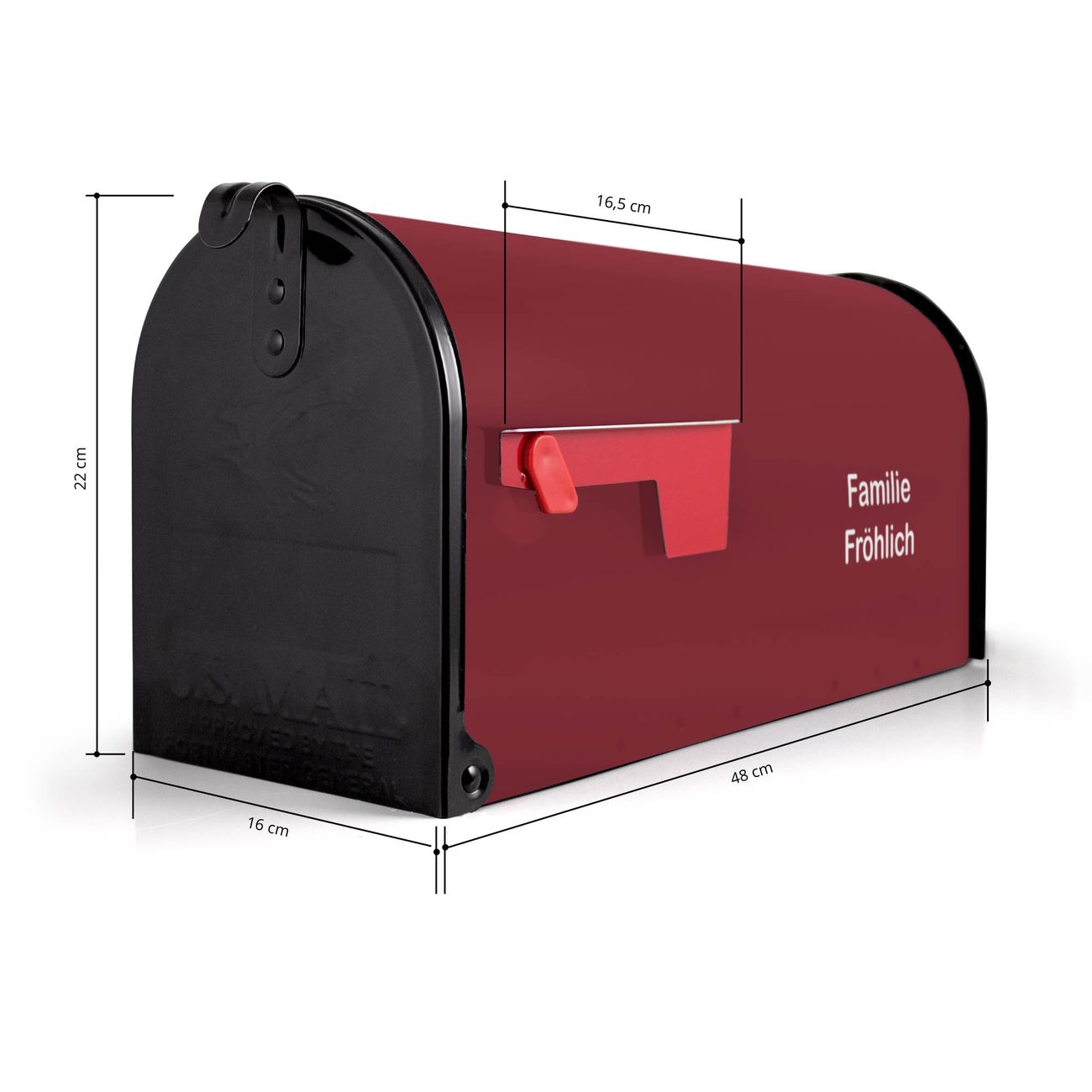 Der amerikanische Briefkasten von banjado mit Burgund Farbe bietet Ihnen ausreichend Fassungsvermögen, um große A4 Sendungen und Zeitschriften zu empfangen. Die typisch amerikanische rote Fahne zeigt Ihnen an, wenn Sie Post erhalten haben. Die US-Mailbox besteht aus verzinktem Stahlblech welches lackiert wurde und ist 48 x 22 x 16 CM (BxHxT) groß. Die Folie mit Farbe Burgund besteht aus einer wetter- und UV-resistenten Folie, die mit einem Schutzlaminat überzogen ist, sodass die US Mailbox zusätzlich vor Kratzern geschützt ist. An der Unterkante sind 4 Löcher je Seite um die Mailbox, typisch amerikanisch, an einem Holzpfahl oder einem Zaun zu befestigen. Auf Wunsch können Sie bei uns den passenden Standfuß oder die passende Wandhalterung kaufen um die US-Mailbox sicher zu befestigen. Wir bieten Ihnen ebenfalls Namensschilder, bereits beschriftet oder frei zu beschriften, und verschiedene selbst gestaltete Bitte-Keine-Werbung-Aufkleber.