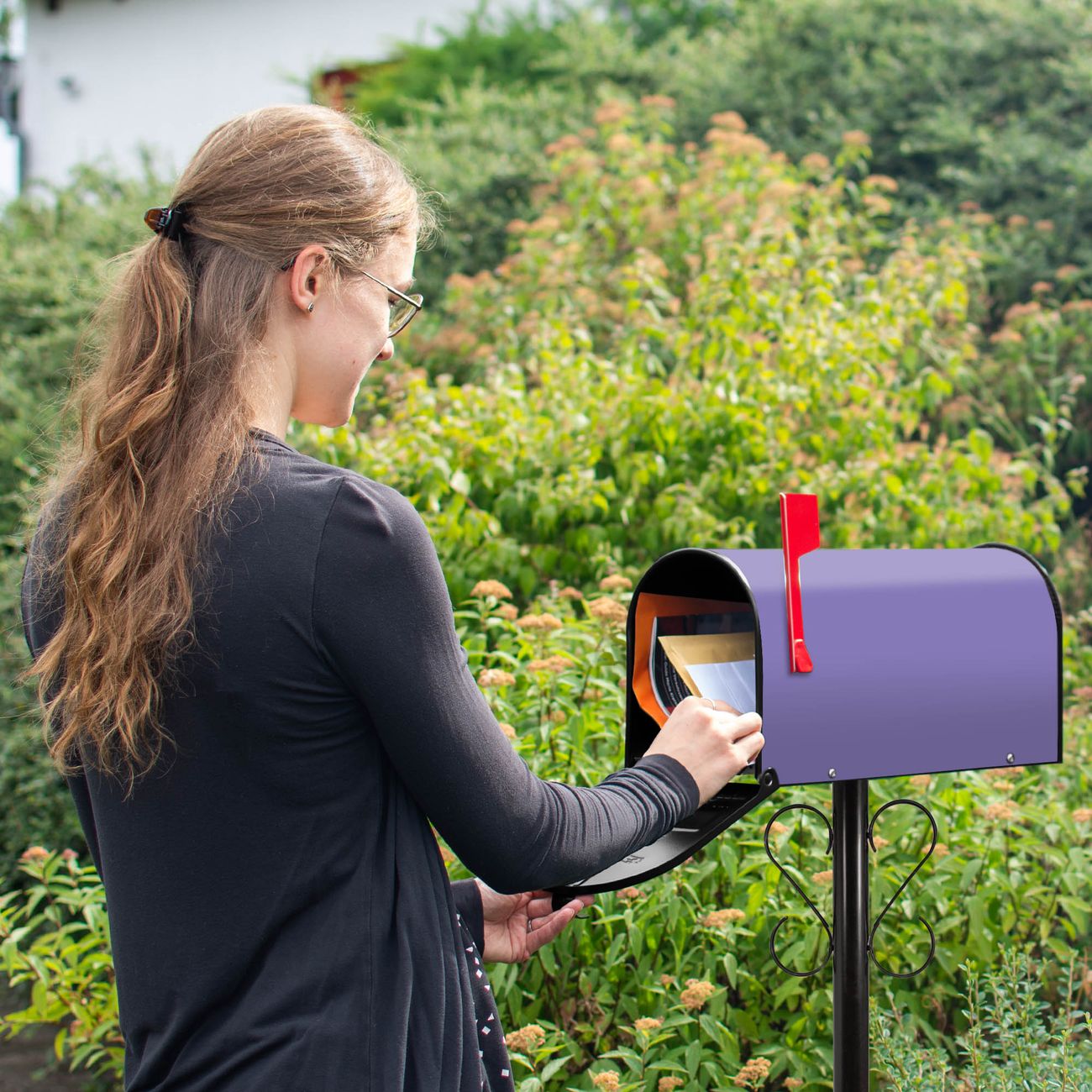 Der amerikanische Briefkasten von banjado mit Lavendel Farbe bietet Ihnen ausreichend Fassungsvermögen, um große A4 Sendungen und Zeitschriften zu empfangen. Die typisch amerikanische rote Fahne zeigt Ihnen an, wenn Sie Post erhalten haben. Die US-Mailbox besteht aus verzinktem Stahlblech welches lackiert wurde und ist 48 x 22 x 16 CM (BxHxT) groß. Die Folie mit Farbe Lavendel besteht aus einer wetter- und UV-resistenten Folie, die mit einem Schutzlaminat überzogen ist, sodass die US Mailbox zusätzlich vor Kratzern geschützt ist. An der Unterkante sind 4 Löcher je Seite um die Mailbox, typisch amerikanisch, an einem Holzpfahl oder einem Zaun zu befestigen. Auf Wunsch können Sie bei uns den passenden Standfuß oder die passende Wandhalterung kaufen um die US-Mailbox sicher zu befestigen. Wir bieten Ihnen ebenfalls Namensschilder, bereits beschriftet oder frei zu beschriften, und verschiedene selbst gestaltete Bitte-Keine-Werbung-Aufkleber.