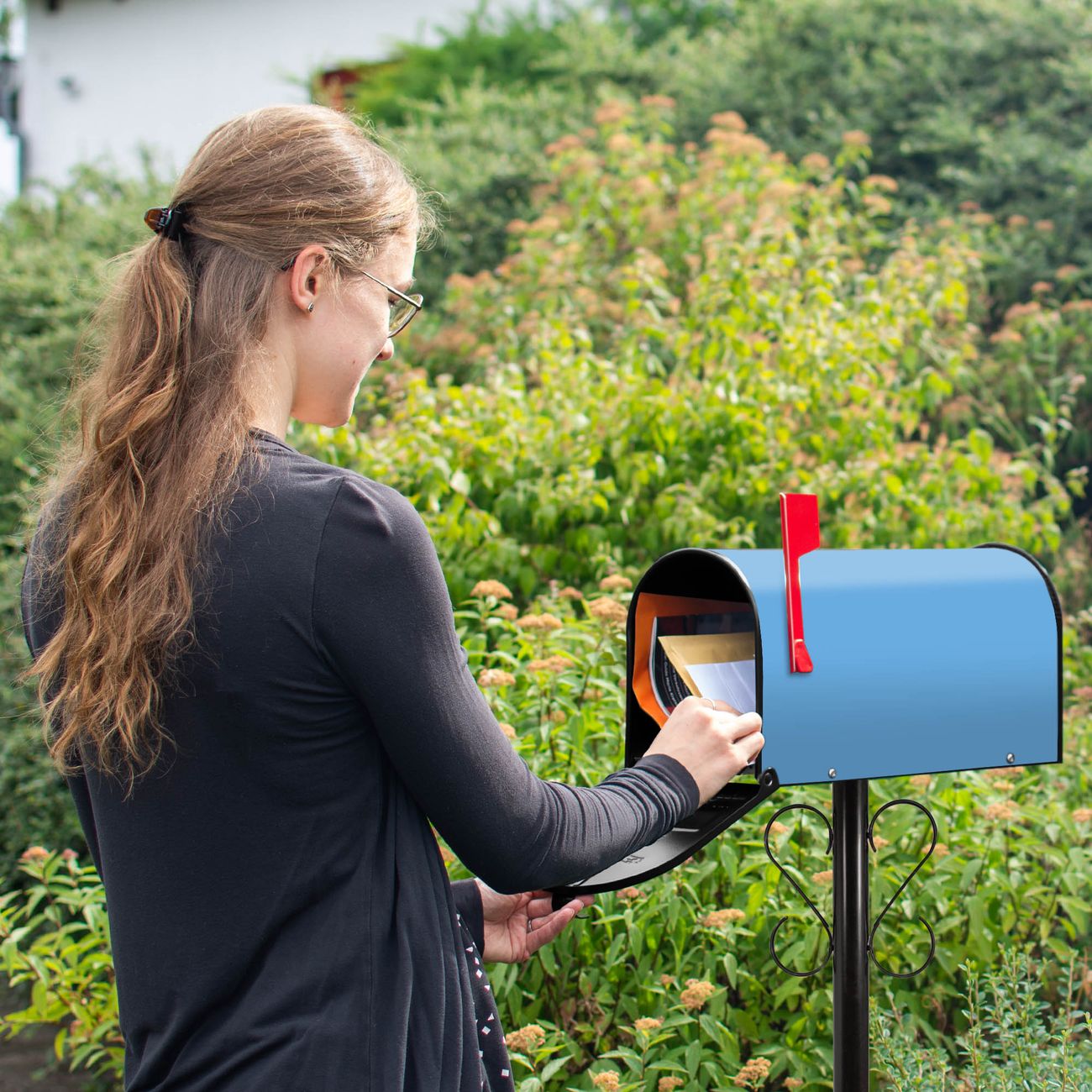 Der amerikanische Briefkasten von banjado mit Pastellblau Farbe bietet Ihnen ausreichend Fassungsvermögen, um große A4 Sendungen und Zeitschriften zu empfangen. Die typisch amerikanische rote Fahne zeigt Ihnen an, wenn Sie Post erhalten haben. Die US-Mailbox besteht aus verzinktem Stahlblech welches lackiert wurde und ist 48 x 22 x 16 CM (BxHxT) groß. Die Folie mit Farbe Pastellblau besteht aus einer wetter- und UV-resistenten Folie, die mit einem Schutzlaminat überzogen ist, sodass die US Mailbox zusätzlich vor Kratzern geschützt ist. An der Unterkante sind 4 Löcher je Seite um die Mailbox, typisch amerikanisch, an einem Holzpfahl oder einem Zaun zu befestigen. Auf Wunsch können Sie bei uns den passenden Standfuß oder die passende Wandhalterung kaufen um die US-Mailbox sicher zu befestigen. Wir bieten Ihnen ebenfalls Namensschilder, bereits beschriftet oder frei zu beschriften, und verschiedene selbst gestaltete Bitte-Keine-Werbung-Aufkleber.