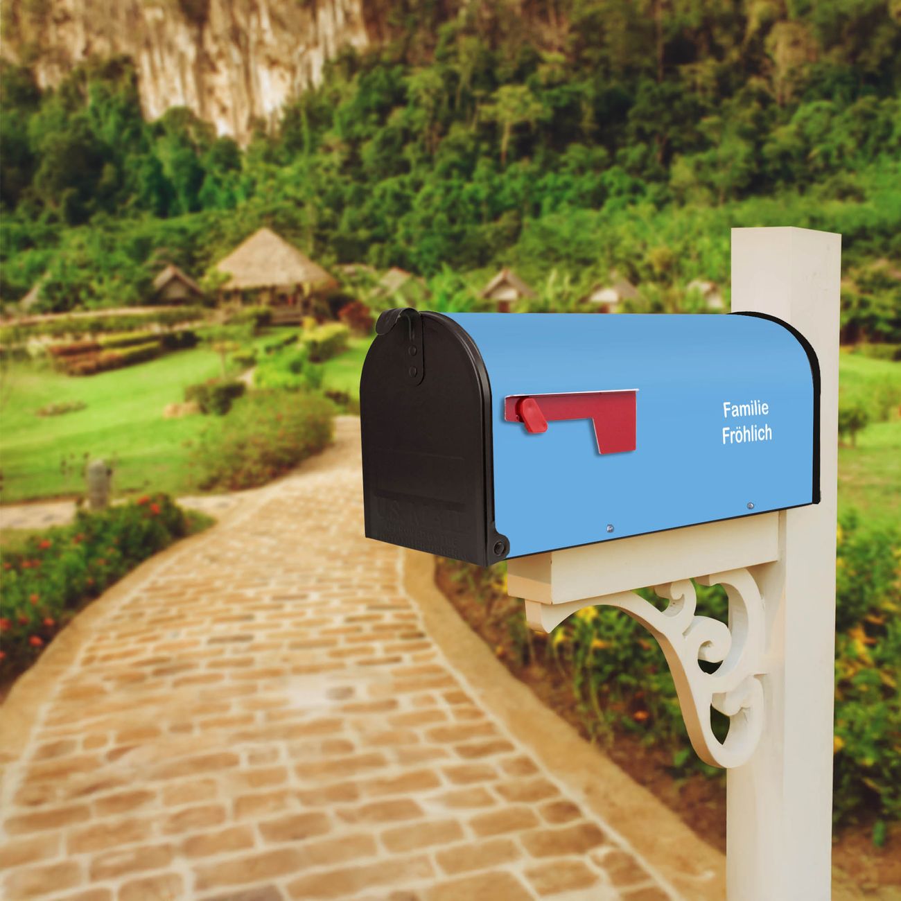 Der amerikanische Briefkasten von banjado mit Pastellblau Farbe bietet Ihnen ausreichend Fassungsvermögen, um große A4 Sendungen und Zeitschriften zu empfangen. Die typisch amerikanische rote Fahne zeigt Ihnen an, wenn Sie Post erhalten haben. Die US-Mailbox besteht aus verzinktem Stahlblech welches lackiert wurde und ist 48 x 22 x 16 CM (BxHxT) groß. Die Folie mit Farbe Pastellblau besteht aus einer wetter- und UV-resistenten Folie, die mit einem Schutzlaminat überzogen ist, sodass die US Mailbox zusätzlich vor Kratzern geschützt ist. An der Unterkante sind 4 Löcher je Seite um die Mailbox, typisch amerikanisch, an einem Holzpfahl oder einem Zaun zu befestigen. Auf Wunsch können Sie bei uns den passenden Standfuß oder die passende Wandhalterung kaufen um die US-Mailbox sicher zu befestigen. Wir bieten Ihnen ebenfalls Namensschilder, bereits beschriftet oder frei zu beschriften, und verschiedene selbst gestaltete Bitte-Keine-Werbung-Aufkleber.