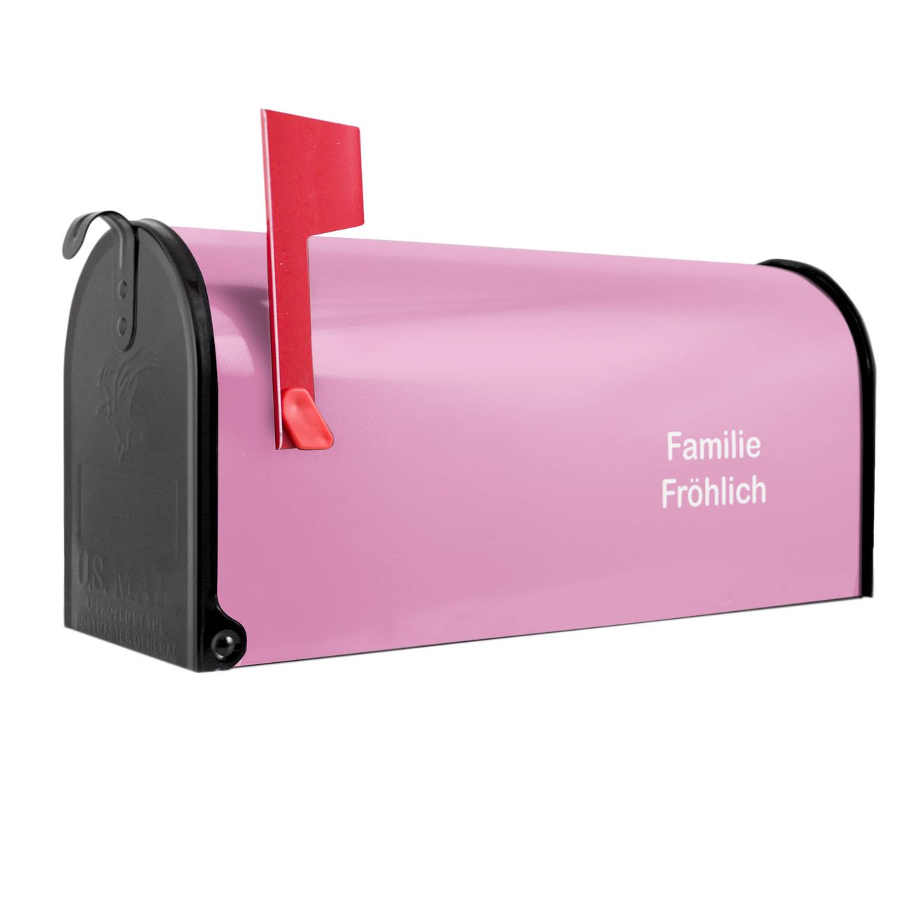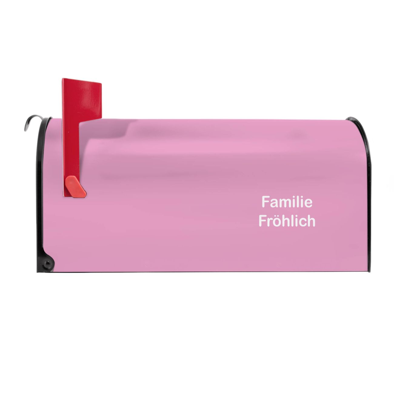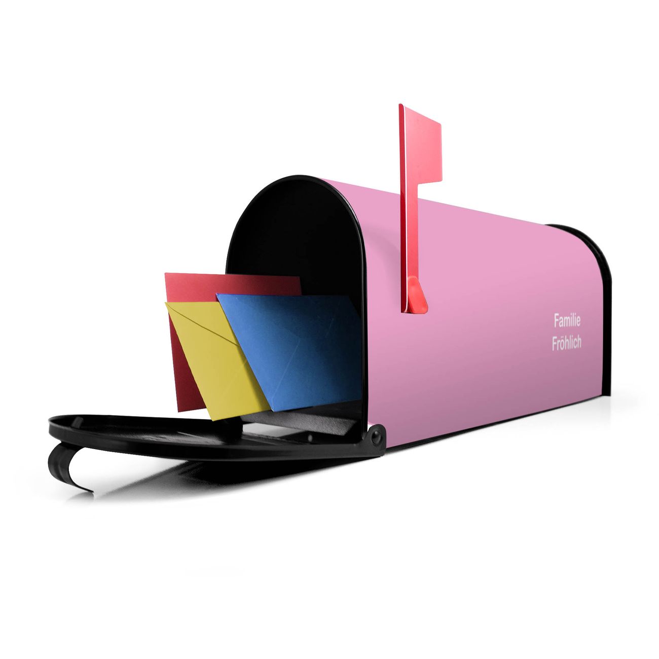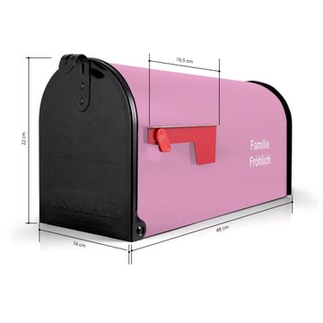 Der amerikanische Briefkasten von banjado mit Rose Farbe bietet Ihnen ausreichend Fassungsvermögen, um große A4 Sendungen und Zeitschriften zu empfangen. Die typisch amerikanische rote Fahne zeigt Ihnen an, wenn Sie Post erhalten haben. Die US-Mailbox besteht aus verzinktem Stahlblech welches lackiert wurde und ist 48 x 22 x 16 CM (BxHxT) groß. Die Folie mit Farbe Rose besteht aus einer wetter- und UV-resistenten Folie, die mit einem Schutzlaminat überzogen ist, sodass die US Mailbox zusätzlich vor Kratzern geschützt ist. An der Unterkante sind 4 Löcher je Seite um die Mailbox, typisch amerikanisch, an einem Holzpfahl oder einem Zaun zu befestigen. Auf Wunsch können Sie bei uns den passenden Standfuß oder die passende Wandhalterung kaufen um die US-Mailbox sicher zu befestigen. Wir bieten Ihnen ebenfalls Namensschilder, bereits beschriftet oder frei zu beschriften, und verschiedene selbst gestaltete Bitte-Keine-Werbung-Aufkleber.