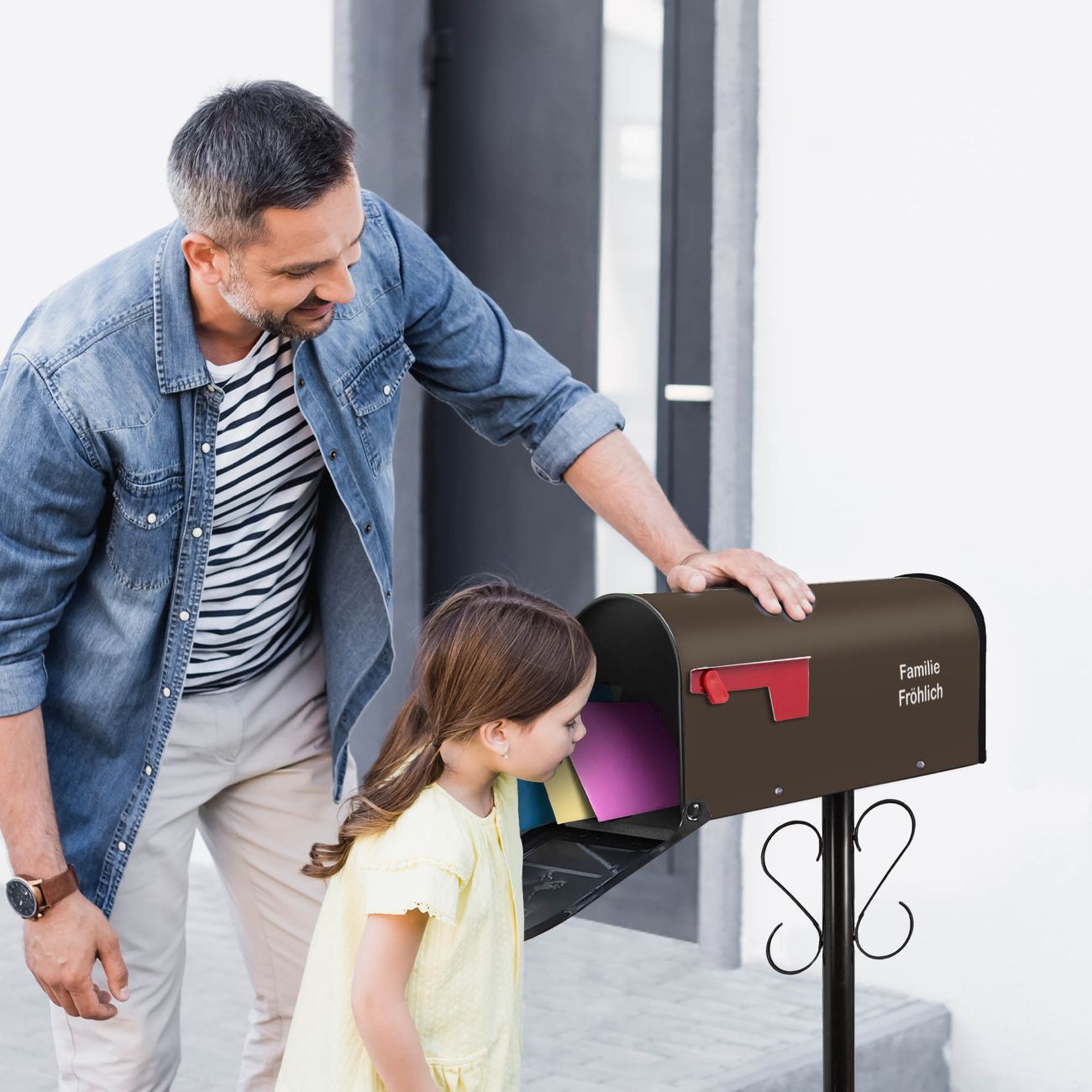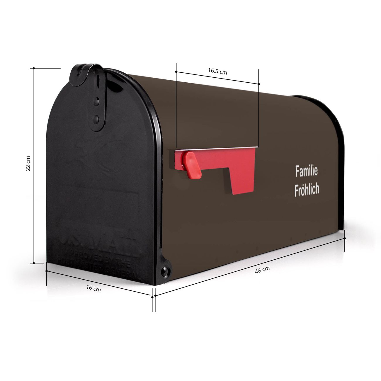 Der amerikanische Briefkasten von banjado mit Schokobraun Farbe bietet Ihnen ausreichend Fassungsvermögen, um große A4 Sendungen und Zeitschriften zu empfangen. Die typisch amerikanische rote Fahne zeigt Ihnen an, wenn Sie Post erhalten haben. Die US-Mailbox besteht aus verzinktem Stahlblech welches lackiert wurde und ist 48 x 22 x 16 CM (BxHxT) groß. Die Folie mit Farbe Schokobraun besteht aus einer wetter- und UV-resistenten Folie, die mit einem Schutzlaminat überzogen ist, sodass die US Mailbox zusätzlich vor Kratzern geschützt ist. An der Unterkante sind 4 Löcher je Seite um die Mailbox, typisch amerikanisch, an einem Holzpfahl oder einem Zaun zu befestigen. Auf Wunsch können Sie bei uns den passenden Standfuß oder die passende Wandhalterung kaufen um die US-Mailbox sicher zu befestigen. Wir bieten Ihnen ebenfalls Namensschilder, bereits beschriftet oder frei zu beschriften, und verschiedene selbst gestaltete Bitte-Keine-Werbung-Aufkleber.