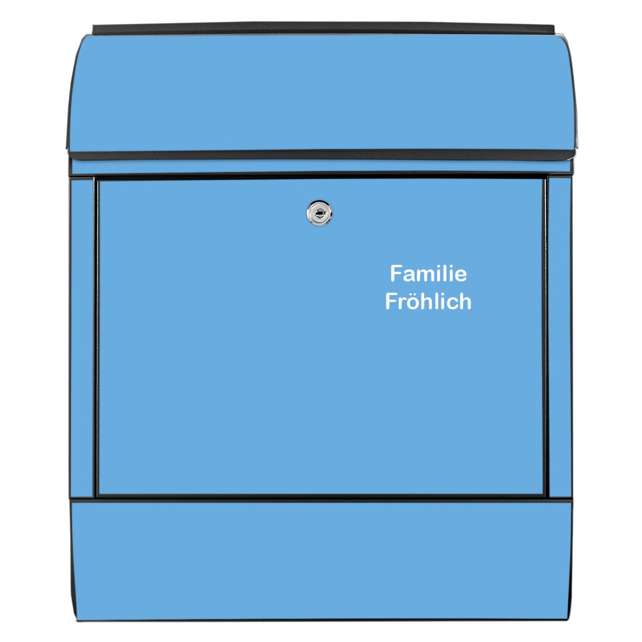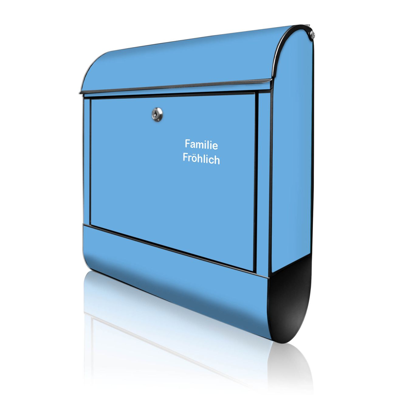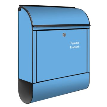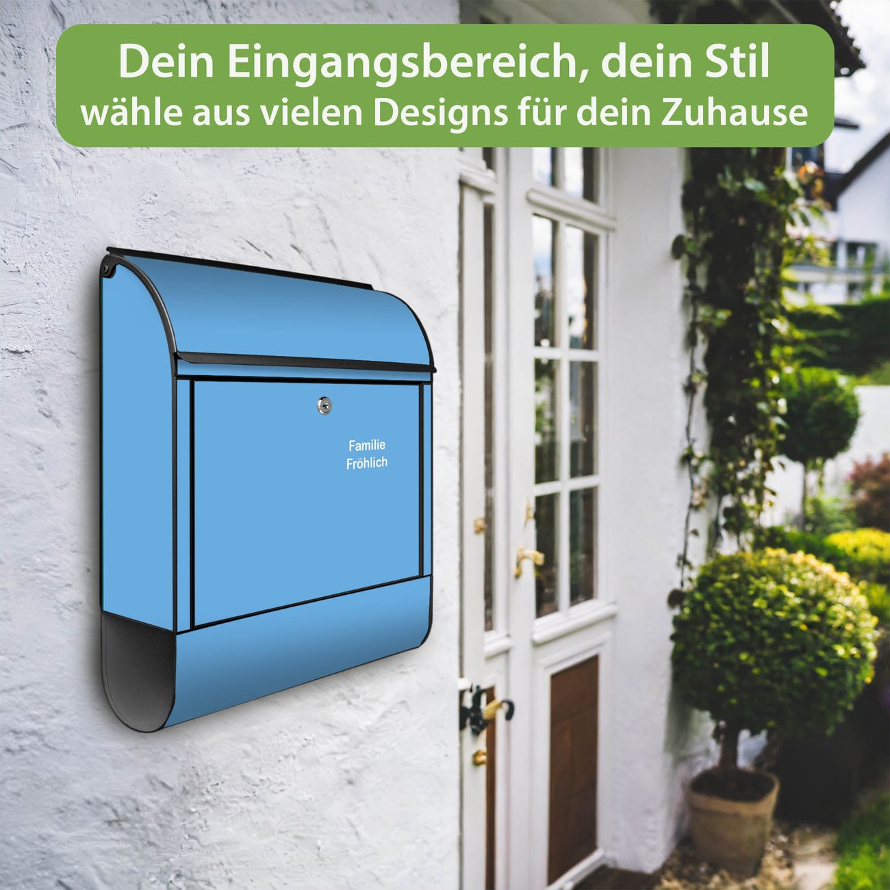DESIGN: Der Postkasten mit Motiv Farbe Pastellblau hat ein sehr ansprechendes und ausgefallenes Design, damit entlocken Sie Ihren Nachbarn und dem Postboten ein Lächeln. Heben Sie Sich von der tristen grauen Masse ab, ohne auf Funktionalität zu verzichten. DETAILS: Der Postkasten besteht aus pulverbeschichtetem Stahl. Er ist 38x46x12,5cm groß. Das Motiv besteht aus einer wetter- und UV-resistenten Folie, die mit einem Schutzlaminat überzogen ist, sodass der Briefkasten zusätzlich vor Kratzern geschützt ist. Der Briefkasten wird mit Montagematerial, zusätzlich zwei Schlüssel sowie einer Bohrschablone geliefert. NUTZEN: Sie können diesen Briefkasten sowohl als Wandbriefkasten montieren oder einen passenden Ständer kaufen und als Standbriefkasten einbetonieren. Die Größe bietet genügend Platz für Sendungen aller Art, der Einwurf fasst auch größere A4 Sendungen. BANJADO: Ihr Briefkasten wird in Sachsen in einer kleinen Manufaktur von Hand veredelt. Die Motivfolie ist lösungsmittelfrei und schutzlaminiert für einen langen Halt. Wir legen großen Wert auf die Verbindung von Funktionalität und Design. Sie erhalten Handarbeit aus Sachsen.