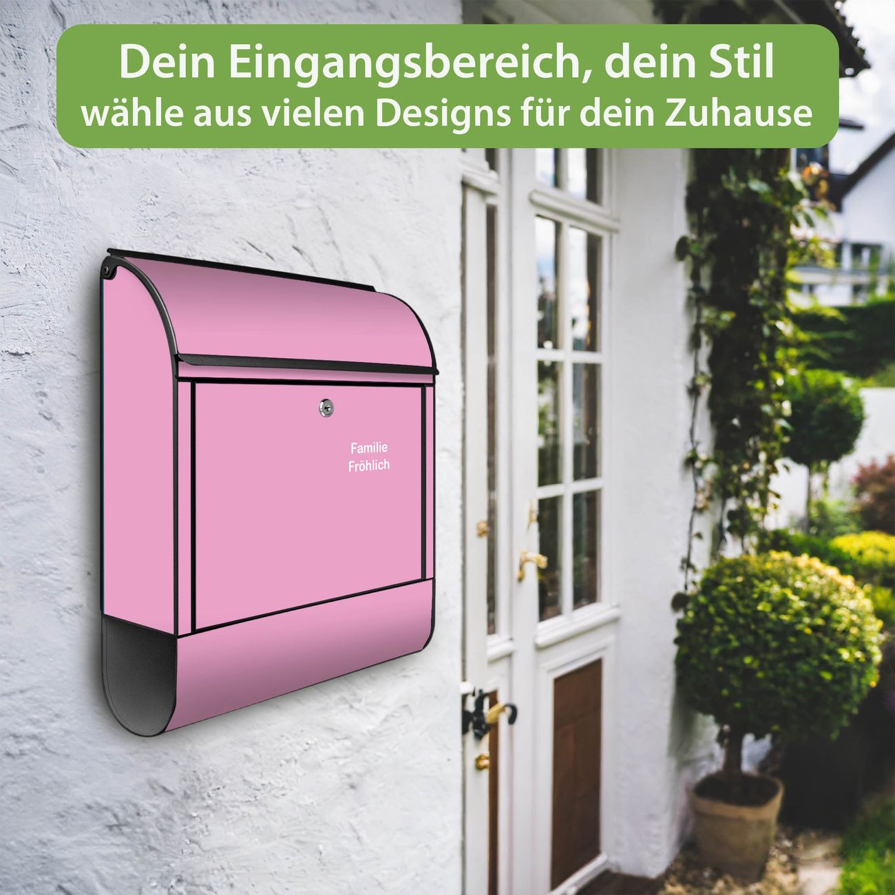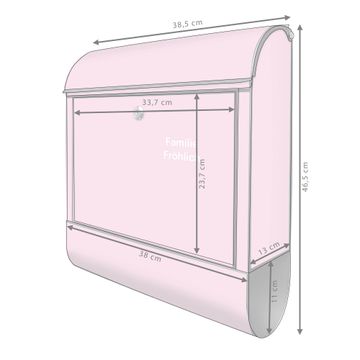 DESIGN: Der Postkasten mit Motiv Farbe Rose hat ein sehr ansprechendes und ausgefallenes Design, damit entlocken Sie Ihren Nachbarn und dem Postboten ein Lächeln. Heben Sie Sich von der tristen grauen Masse ab, ohne auf Funktionalität zu verzichten. DETAILS: Der Postkasten besteht aus pulverbeschichtetem Stahl. Er ist 38x46x12,5cm groß. Das Motiv besteht aus einer wetter- und UV-resistenten Folie, die mit einem Schutzlaminat überzogen ist, sodass der Briefkasten zusätzlich vor Kratzern geschützt ist. Der Briefkasten wird mit Montagematerial, zusätzlich zwei Schlüssel sowie einer Bohrschablone geliefert. NUTZEN: Sie können diesen Briefkasten sowohl als Wandbriefkasten montieren oder einen passenden Ständer kaufen und als Standbriefkasten einbetonieren. Die Größe bietet genügend Platz für Sendungen aller Art, der Einwurf fasst auch größere A4 Sendungen. BANJADO: Ihr Briefkasten wird in Sachsen in einer kleinen Manufaktur von Hand veredelt. Die Motivfolie ist lösungsmittelfrei und schutzlaminiert für einen langen Halt. Wir legen großen Wert auf die Verbindung von Funktionalität und Design. Sie erhalten Handarbeit aus Sachsen.
