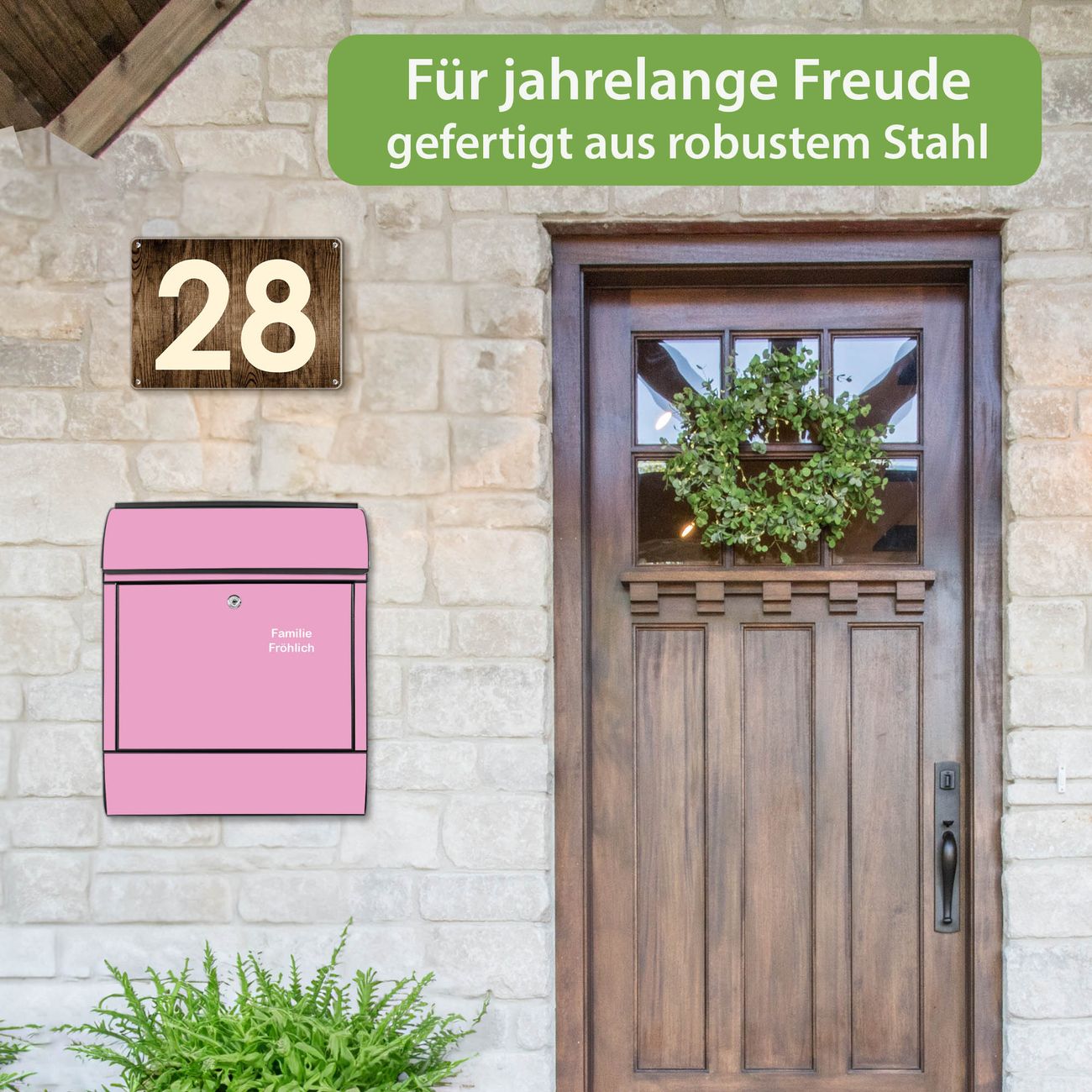 Der Vorschau-Text Familie Fröhlich wird durch Ihren persönlichen Wunschtext ersetzt. Die Schriftart und Farbe bleiben gleich wie in der Vorschau.
