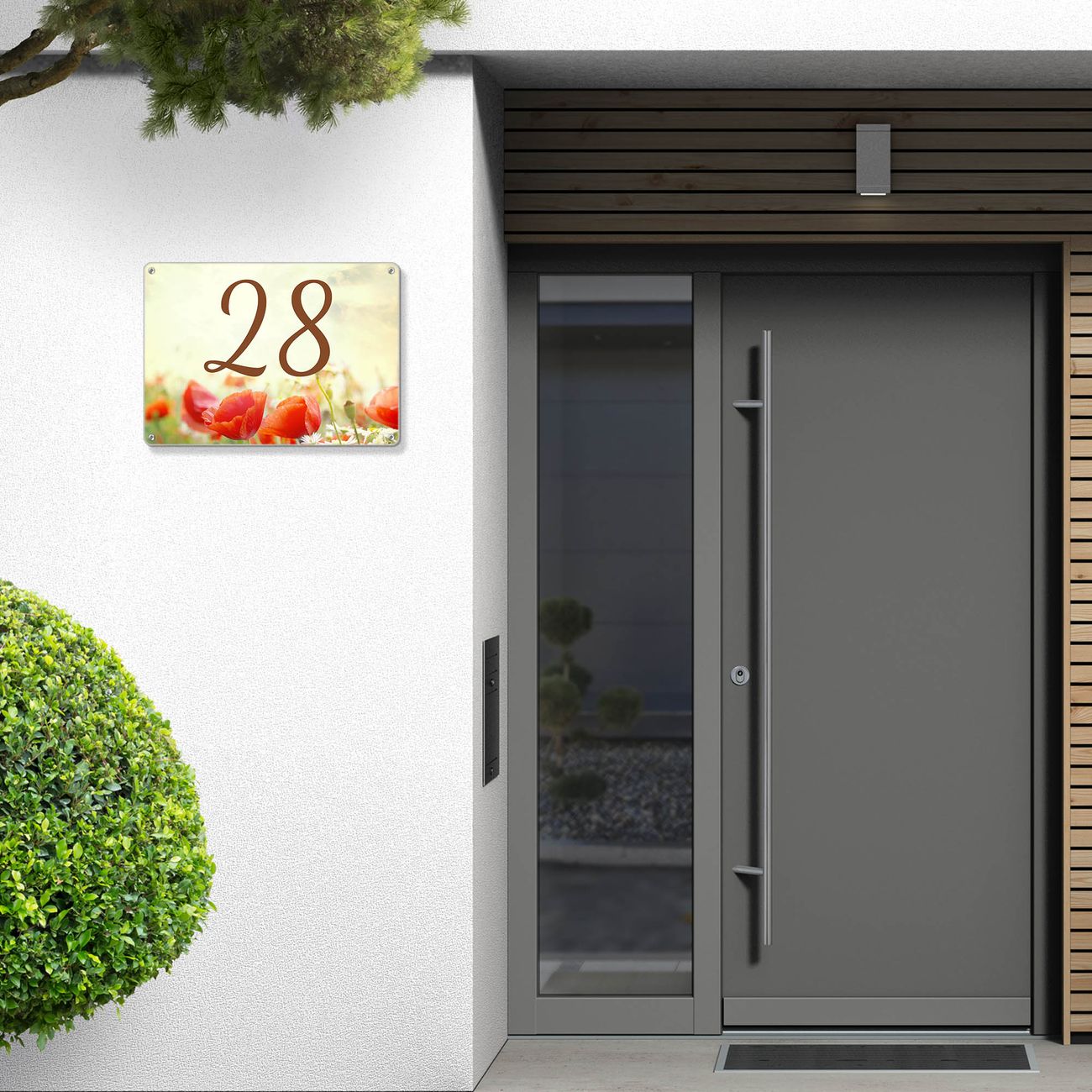 Das banjado Hausnummer Schild ist mit 4 Schrauben einfach am Haus anzubringen und zeigt dank der Größe stilsicher Ihre Hausnummer oder auch individuell Hausnummer mit Straßennamen. Das Hausschild personalisiert können Sie ganz auf Ihre Wünsche anpassen. Wir bieten verschiedenste Motive an. Dazu können Sie das Schild mit Ihrer Hausnummer anpassen.