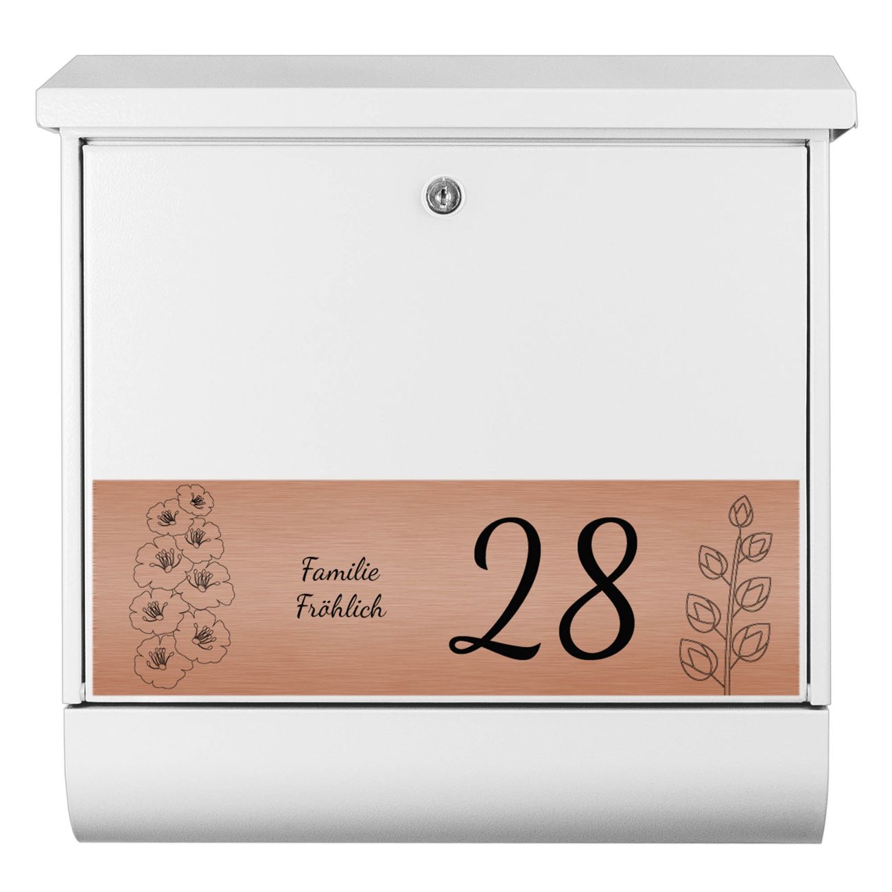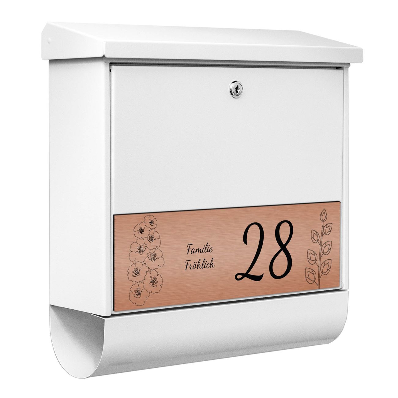 Der Briefkasten besteht aus Stahl, einem hochwertigen Material das äußerst unempfindlich gegenüber Witterungseinflüssen ist. Die Gravur Platte aus Acryl in Metall-Optik ist 33x10cm groß und schmückt die Vorderseite des Briefkastens. Das Material sieht Metall zum Verwechseln ähnlich und ist ebenso witterungsbeständig wie dieser. Durch das Bearbeiten erscheint an den gravierten Stellen die schwarze Unterschicht und hebt so in einem guten Kontrast ihren Wunschtext, Ihre Hausnummer und die Gravur immer ab. Der Postkasten ist 42,5cm hoch, 38cm breit und 11,5cm tief. Der Briefeinwurf ist 33,2cm x 3,1cm, Format DIN C4. Der Briefkasten wird mit Montagematerial und zwei Schlüsseln geliefert.