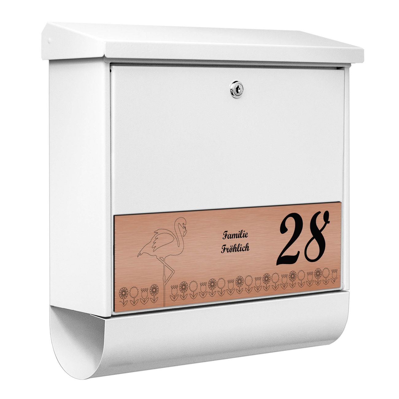 Der Briefkasten besteht aus Stahl, einem hochwertigen Material das äußerst unempfindlich gegenüber Witterungseinflüssen ist. Die Gravur Platte aus Acryl in Metall-Optik ist 33x10cm groß und schmückt die Vorderseite des Briefkastens. Das Material sieht Metall zum Verwechseln ähnlich und ist ebenso witterungsbeständig wie dieser. Durch das Bearbeiten erscheint an den gravierten Stellen die schwarze Unterschicht und hebt so in einem guten Kontrast ihren Wunschtext, Ihre Hausnummer und die Gravur immer ab. Der Postkasten ist 42,5cm hoch, 38cm breit und 11,5cm tief. Der Briefeinwurf ist 33,2cm x 3,1cm, Format DIN C4. Der Briefkasten wird mit Montagematerial und zwei Schlüsseln geliefert.