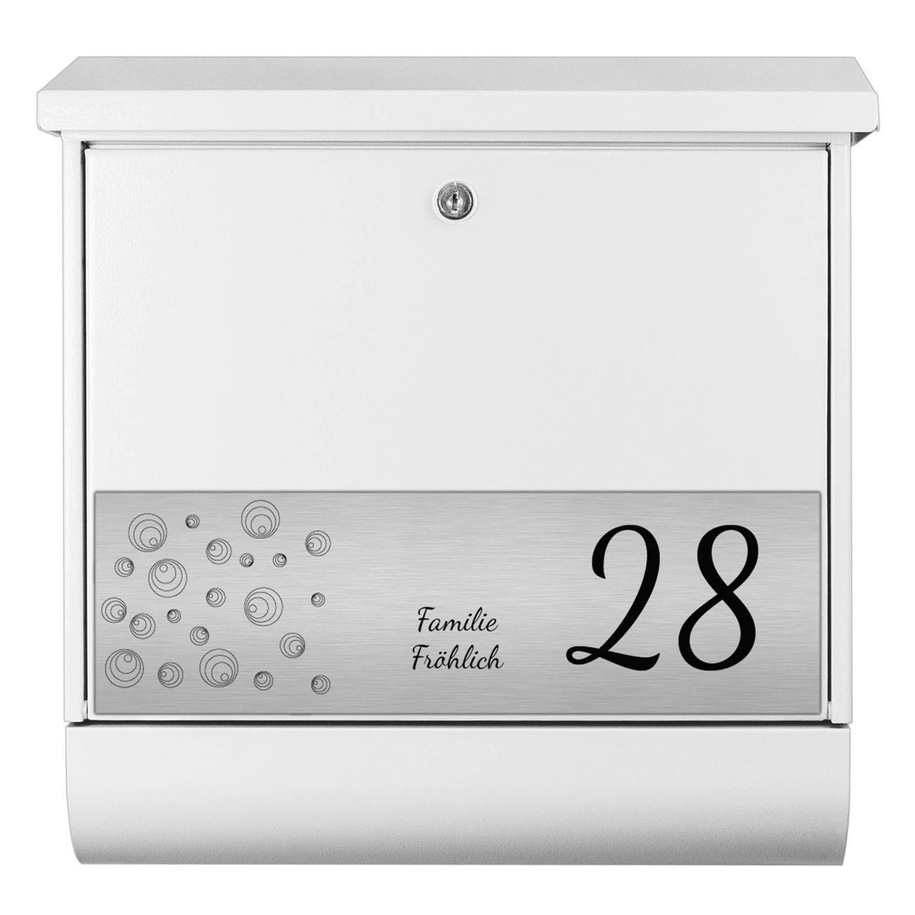 Der Briefkasten besteht aus Stahl, einem hochwertigen Material das äußerst unempfindlich gegenüber Witterungseinflüssen ist. Die Gravur Platte aus Acryl in Metall-Optik ist 33x10cm groß und schmückt die Vorderseite des Briefkastens. Das Material sieht Metall zum Verwechseln ähnlich und ist ebenso witterungsbeständig wie dieser. Durch das Bearbeiten erscheint an den gravierten Stellen die schwarze Unterschicht und hebt so in einem guten Kontrast ihren Wunschtext, Ihre Hausnummer und die Gravur immer ab. Der Postkasten ist 42,5cm hoch, 38cm breit und 11,5cm tief. Der Briefeinwurf ist 33,2cm x 3,1cm, Format DIN C4. Der Briefkasten wird mit Montagematerial und zwei Schlüsseln geliefert.