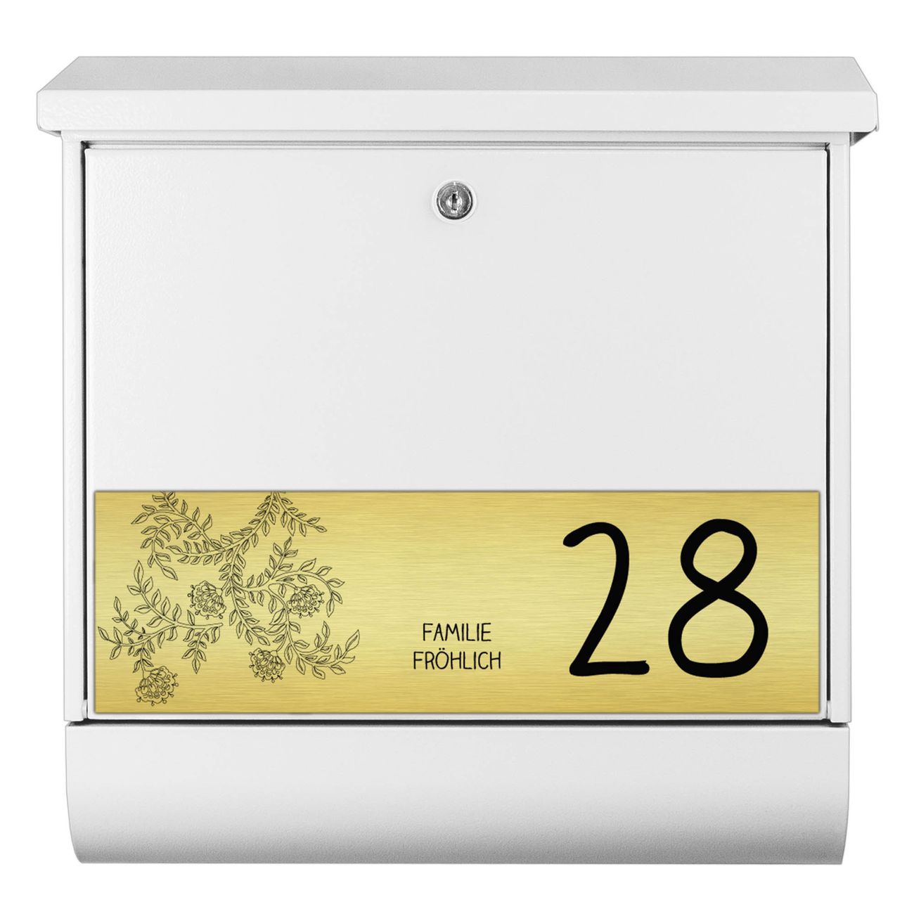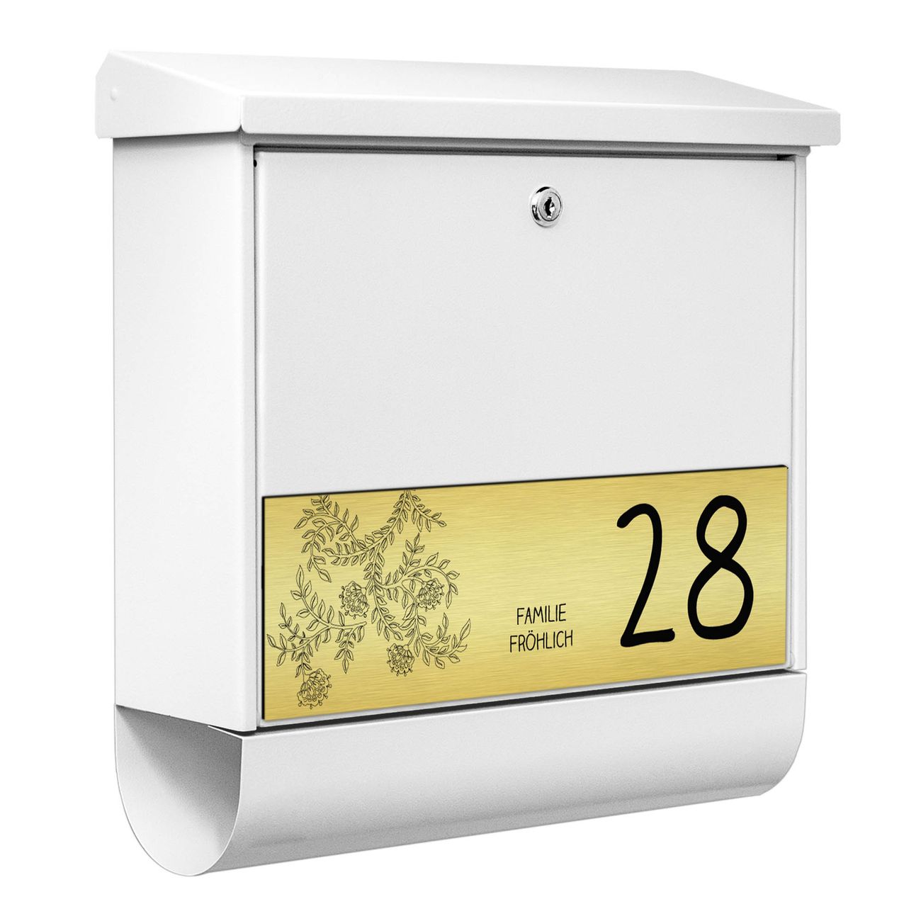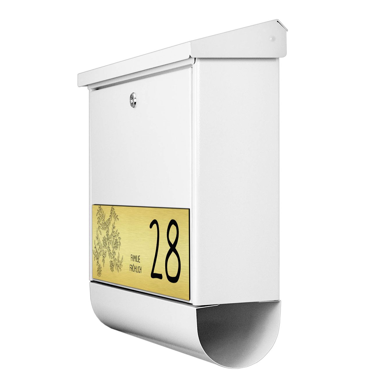 Der Briefkasten besteht aus Stahl, einem hochwertigen Material das äußerst unempfindlich gegenüber Witterungseinflüssen ist. Die Gravur Platte aus Acryl in Metall-Optik ist 33x10cm groß und schmückt die Vorderseite des Briefkastens. Das Material sieht Metall zum Verwechseln ähnlich und ist ebenso witterungsbeständig wie dieser. Durch das Bearbeiten erscheint an den gravierten Stellen die schwarze Unterschicht und hebt so in einem guten Kontrast ihren Wunschtext, Ihre Hausnummer und die Gravur immer ab. Der Postkasten ist 42,5cm hoch, 38cm breit und 11,5cm tief. Der Briefeinwurf ist 33,2cm x 3,1cm, Format DIN C4. Der Briefkasten wird mit Montagematerial und zwei Schlüsseln geliefert.