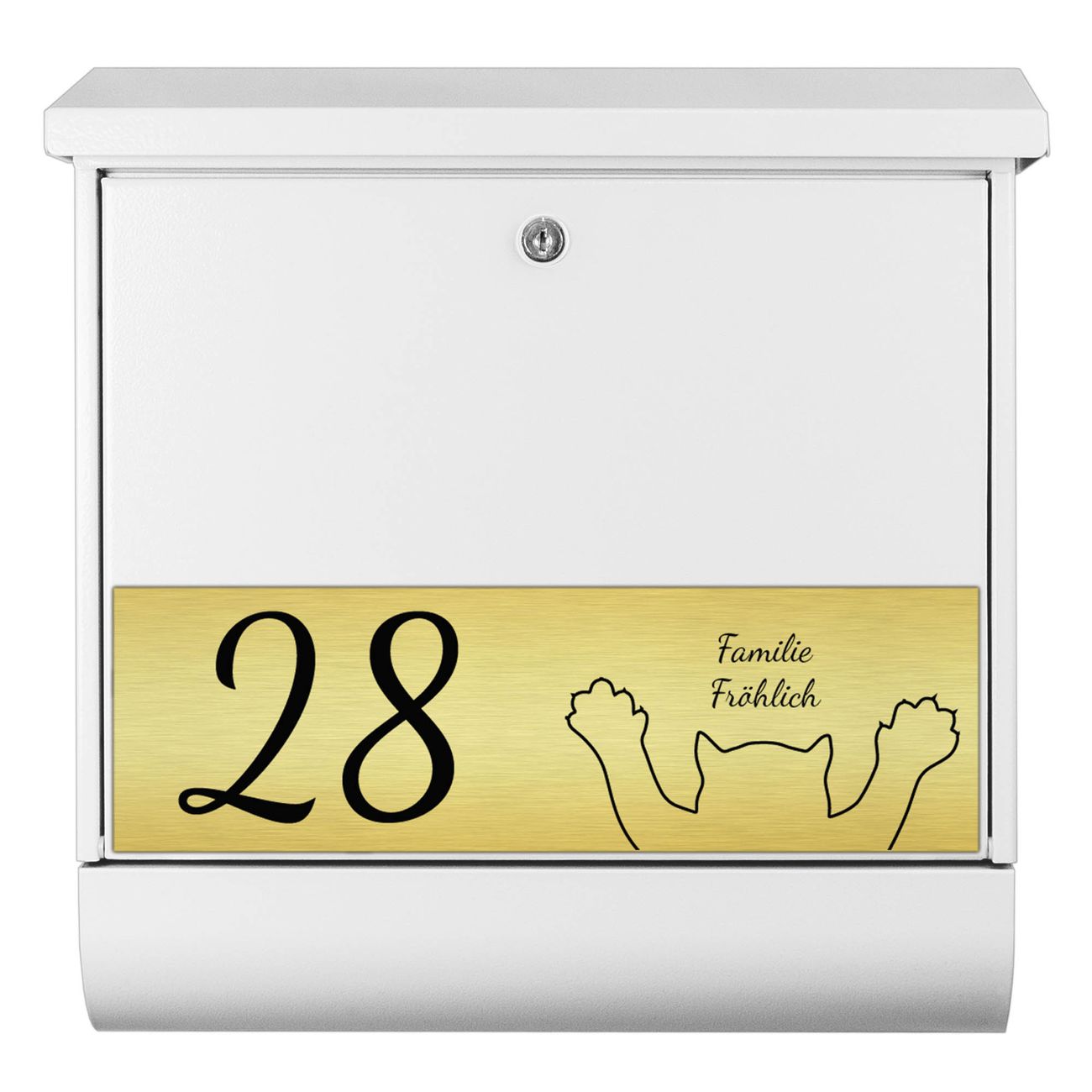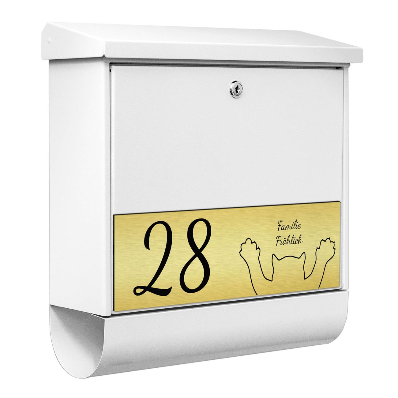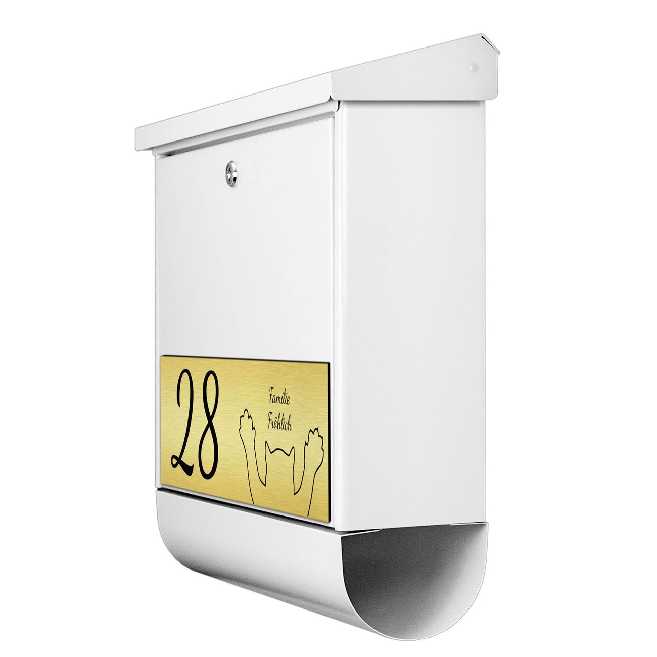 Der Briefkasten besteht aus Stahl, einem hochwertigen Material das äußerst unempfindlich gegenüber Witterungseinflüssen ist. Die Gravur Platte aus Acryl in Metall-Optik ist 33x10cm groß und schmückt die Vorderseite des Briefkastens. Das Material sieht Metall zum Verwechseln ähnlich und ist ebenso witterungsbeständig wie dieser. Durch das Bearbeiten erscheint an den gravierten Stellen die schwarze Unterschicht und hebt so in einem guten Kontrast ihren Wunschtext, Ihre Hausnummer und die Gravur immer ab. Der Postkasten ist 42,5cm hoch, 38cm breit und 11,5cm tief. Der Briefeinwurf ist 33,2cm x 3,1cm, Format DIN C4. Der Briefkasten wird mit Montagematerial und zwei Schlüsseln geliefert.